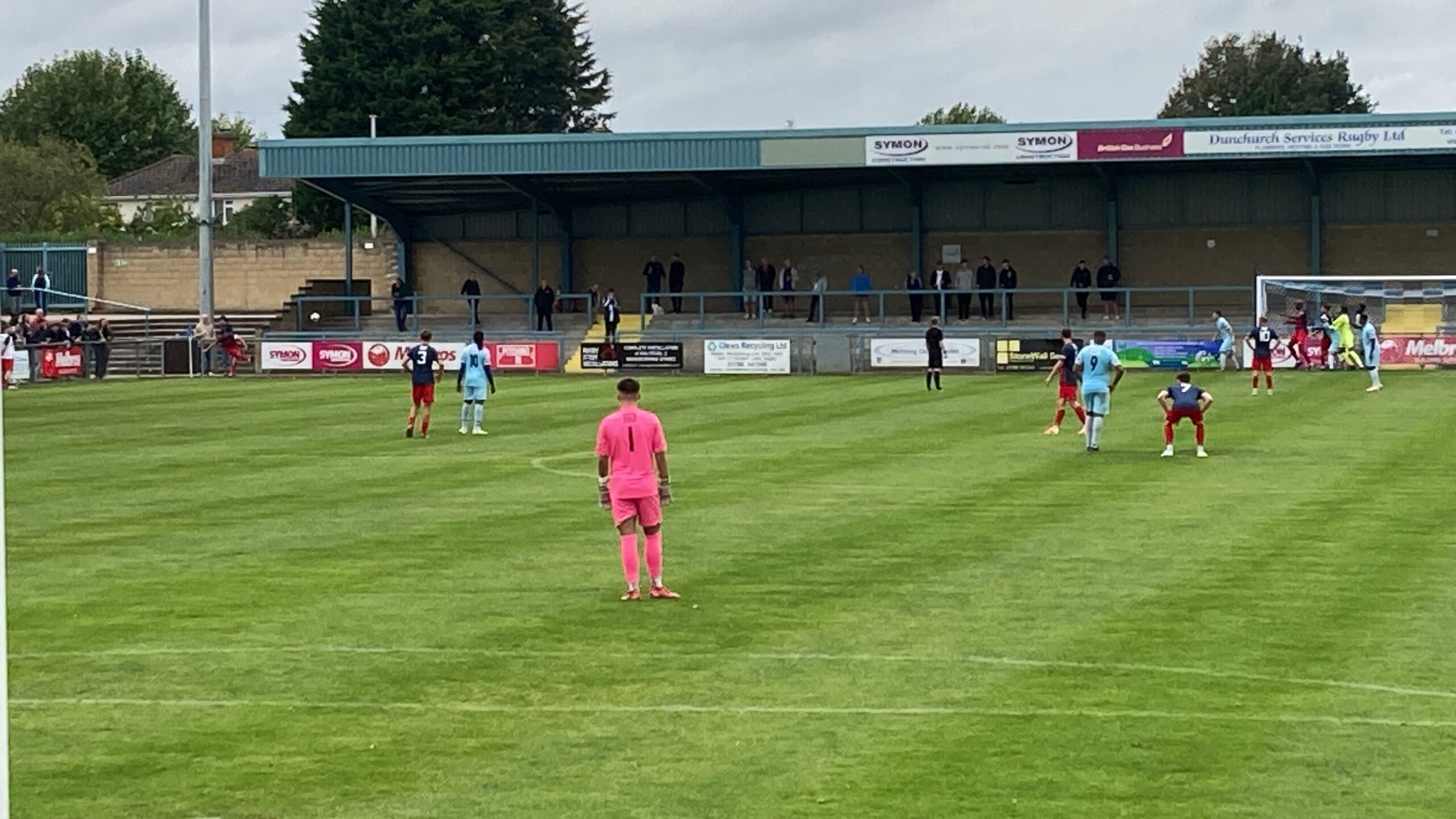 3 minutes later and Rugby have a long throw in from the left, it’s headed on… And headed at goal… SAVED! Sphinx clear.