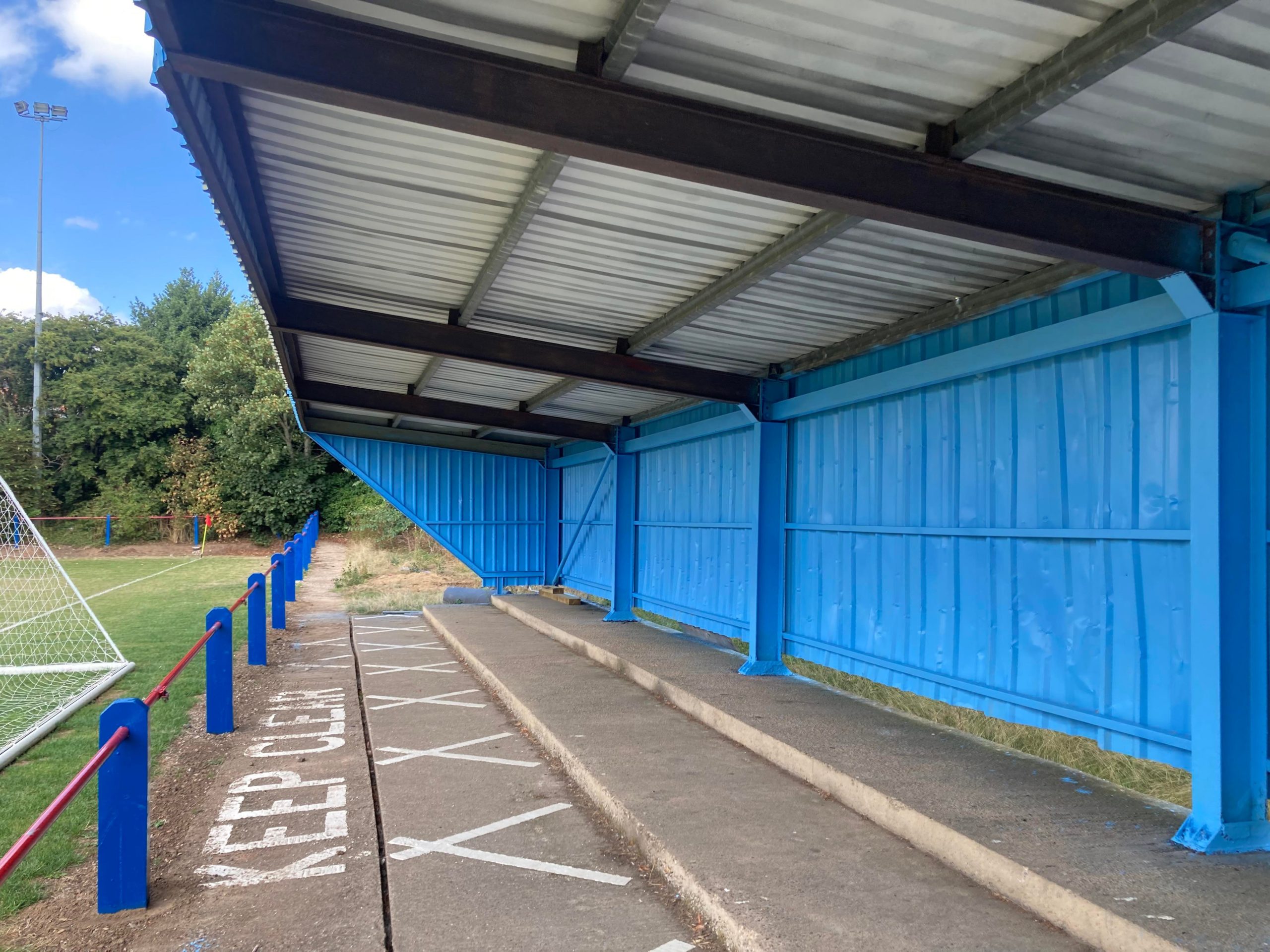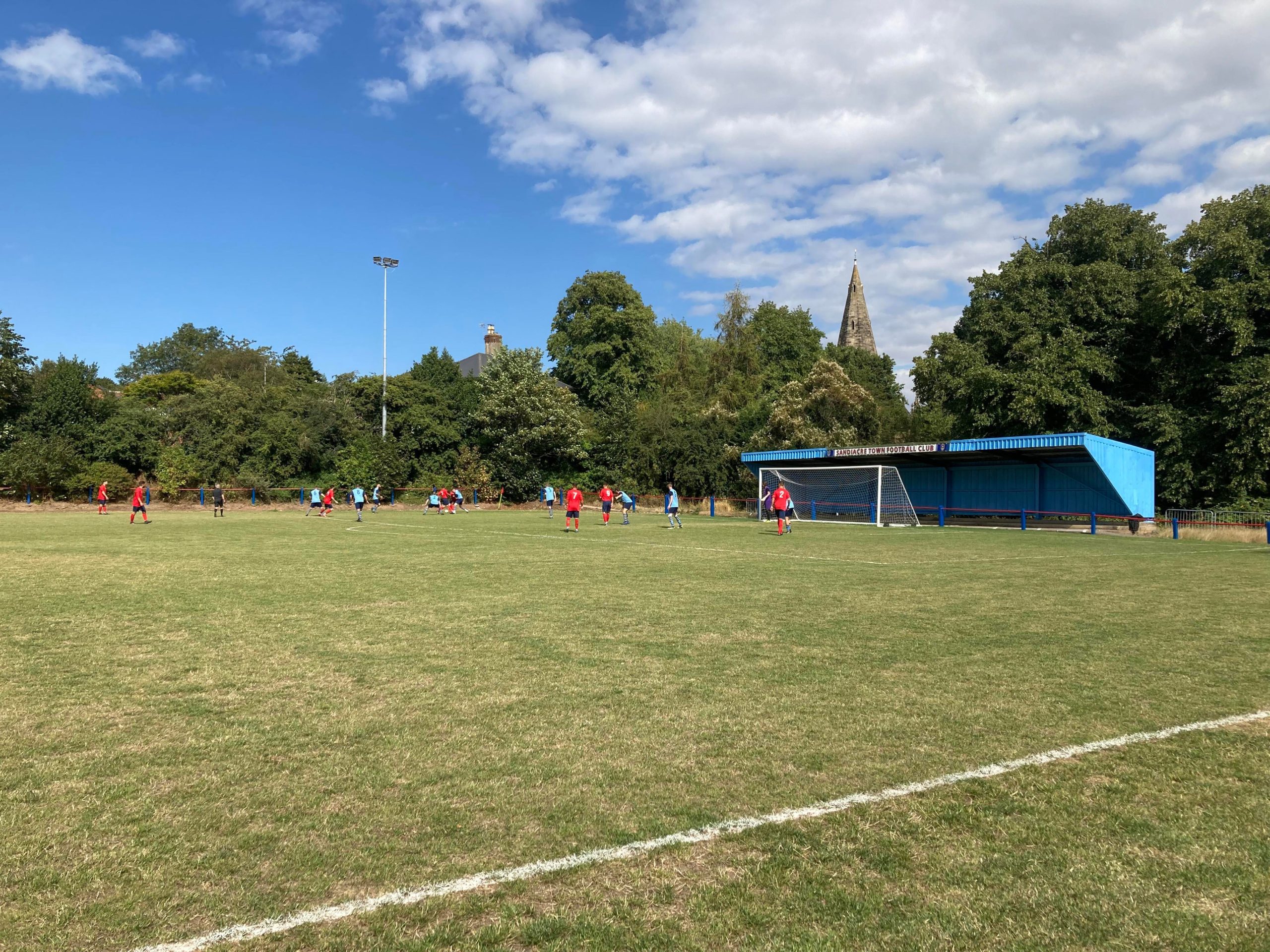 - The Ground: 7/10 – It’s a good little setup! The stand behind the goal makes it for me! It has a good backdrop of the church building behind the stand and the bars are painted in club colours which I like too! I especially liked the clubhouse! It is a small one but the decoration in there is stunning to say the least! It’s as good as Collingham’s for me and I certainly liked that one! Great ground!
