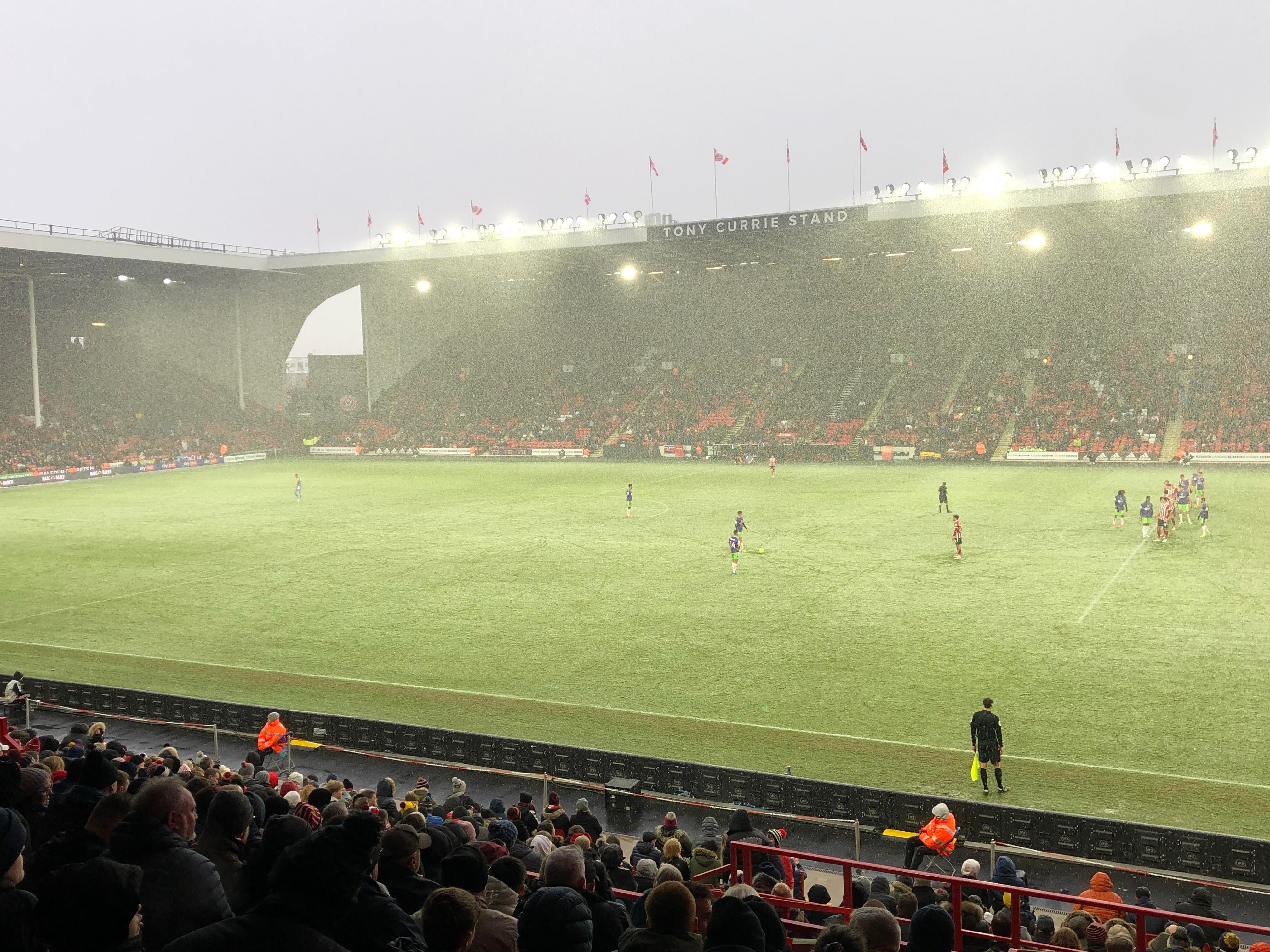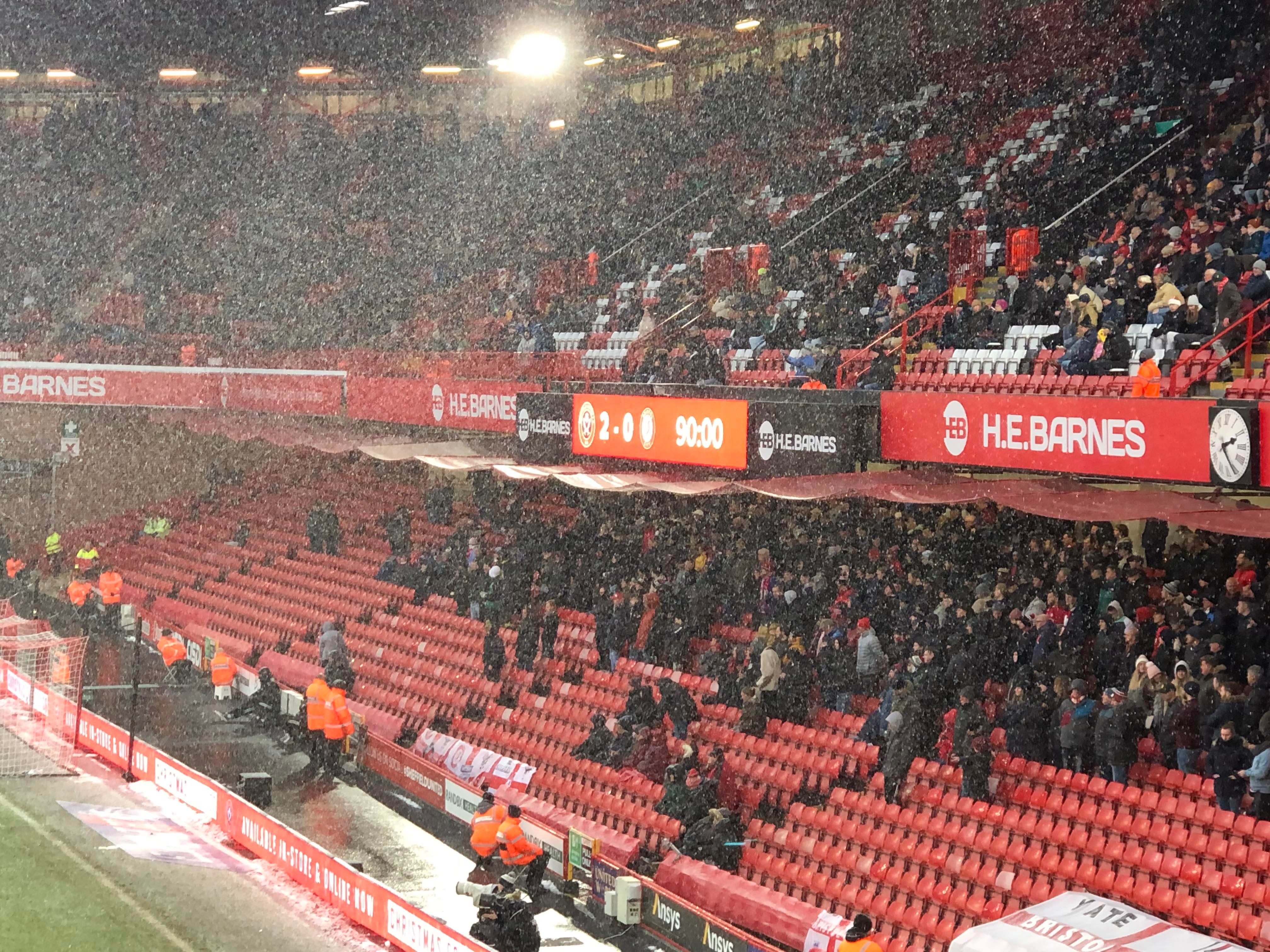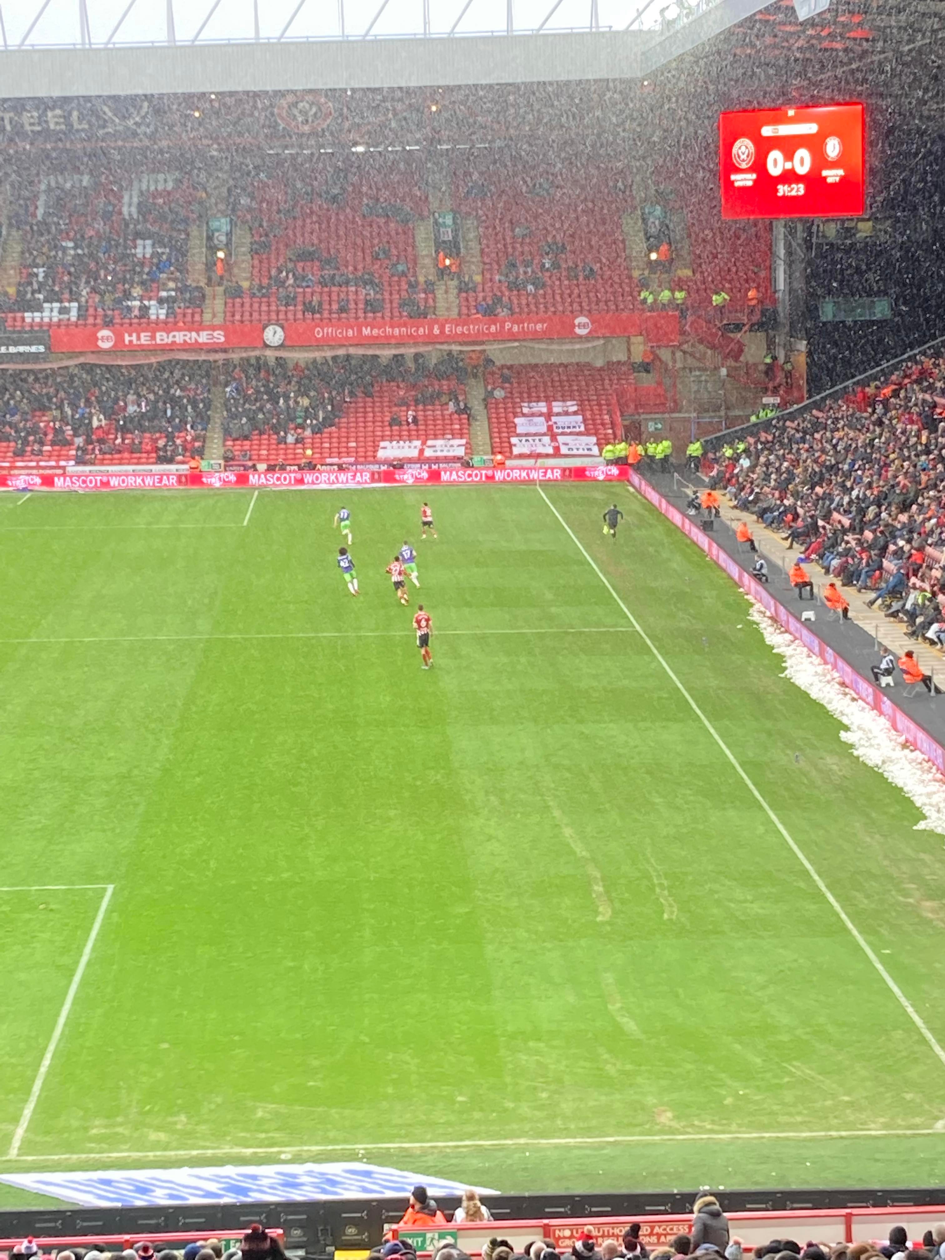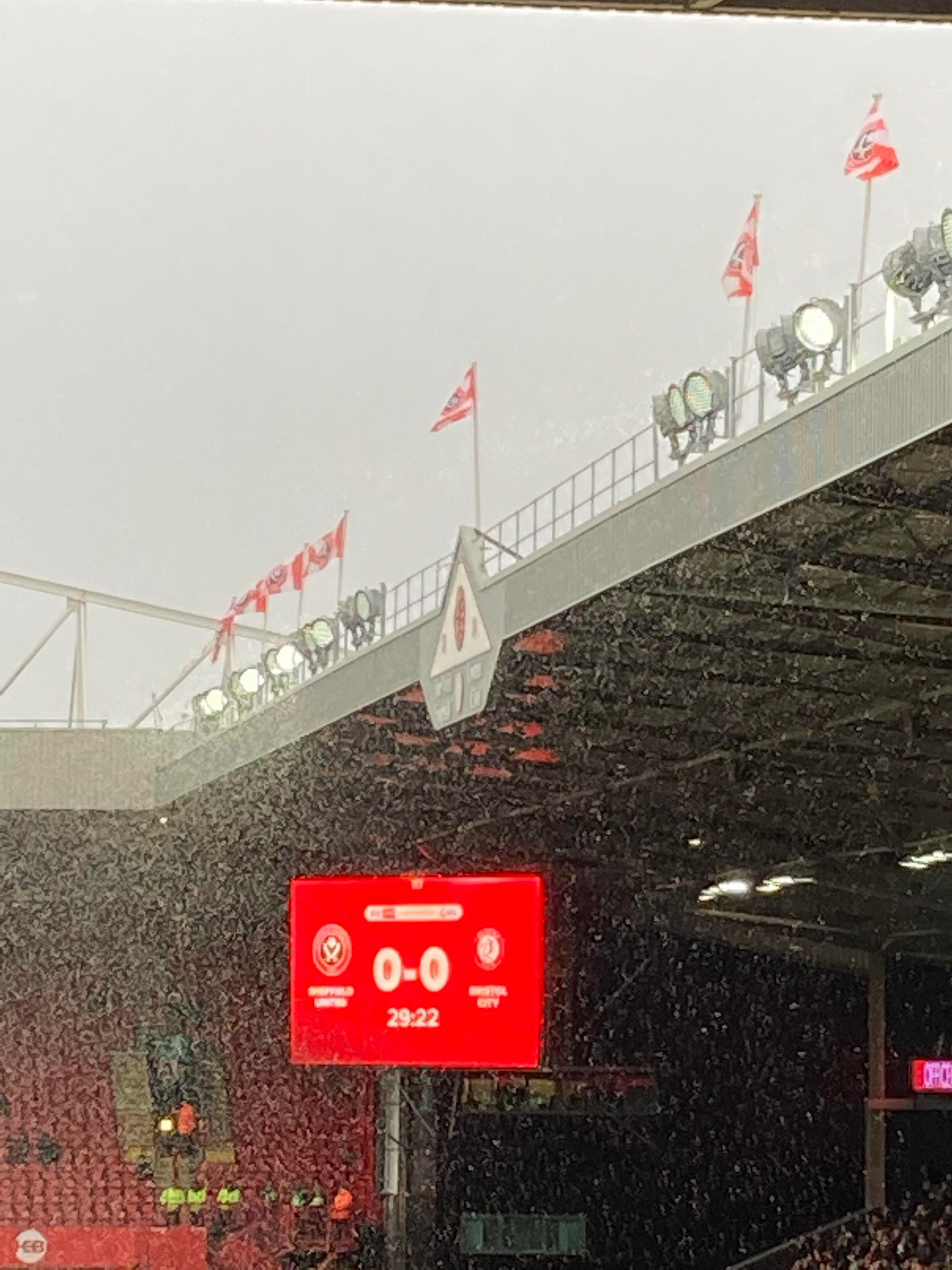 “UNITED! UNITED!” 28 minutes now and United have a throw in on the right, it’s played in, United work it across to Conor Hourihane on the edge of the box and he shoots… Keeper saves! The snow is coming down here in Sheffield now!! 33rd minute and United work it across the Bristol box, it’s on the right and crossed in, it comes to Enda Stevens on the edge of the box for the volley… Over!