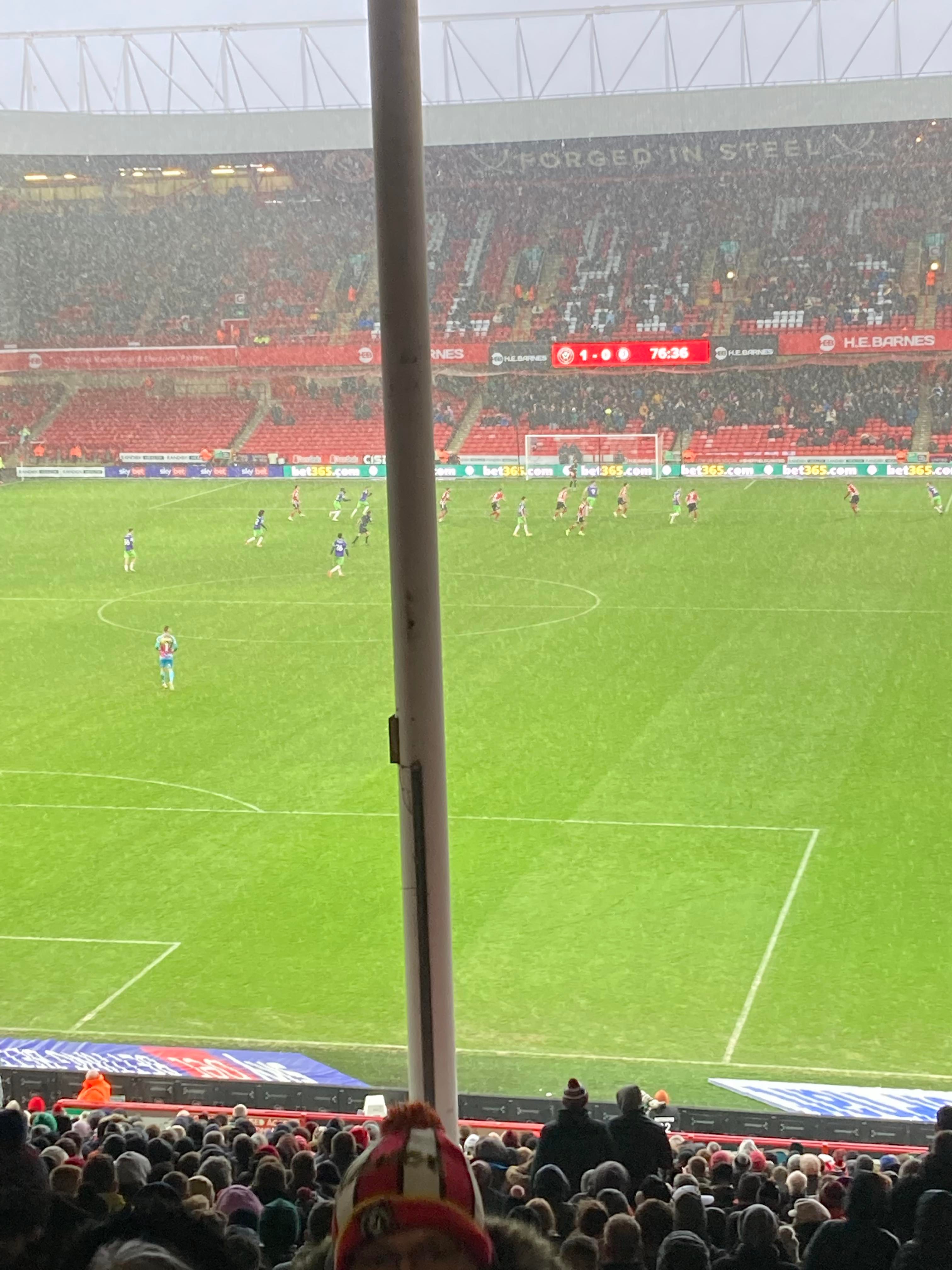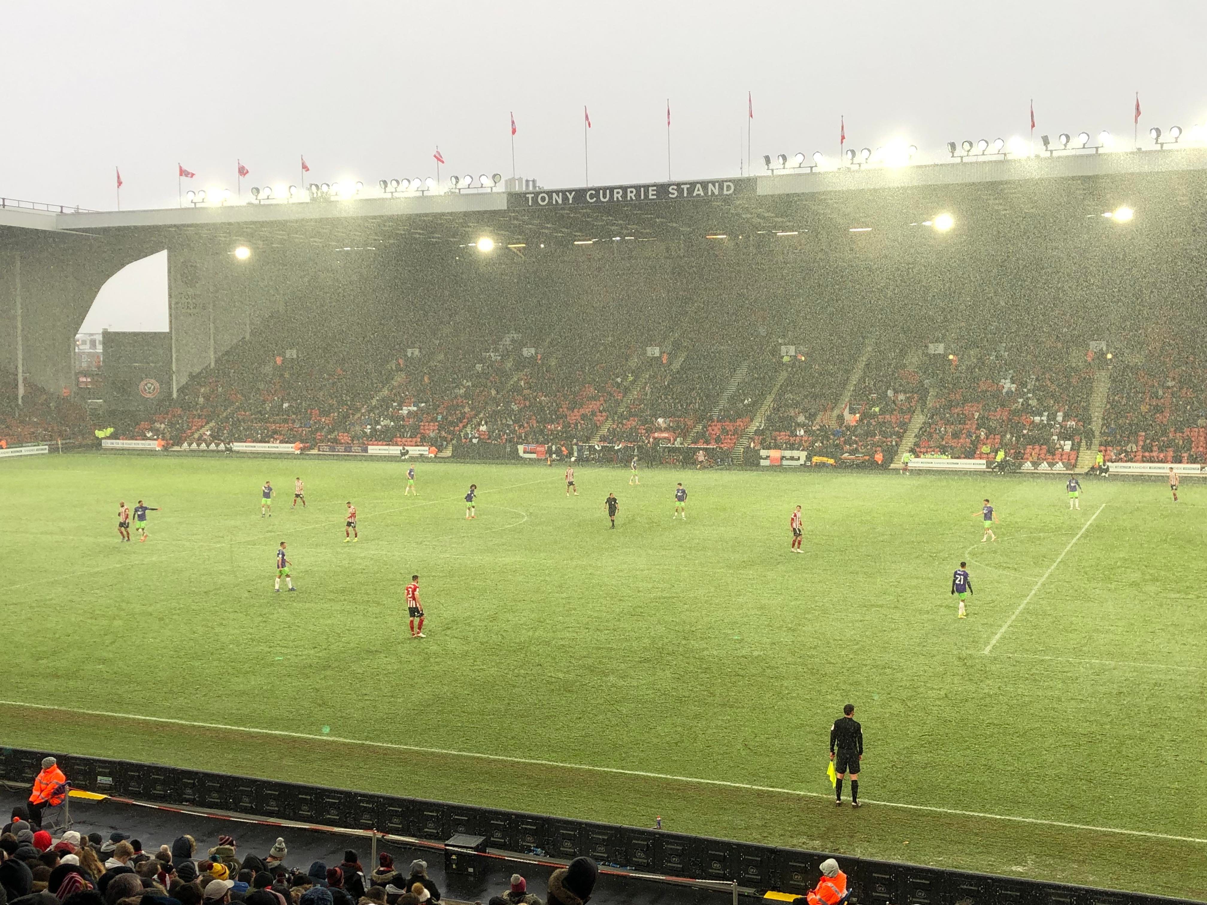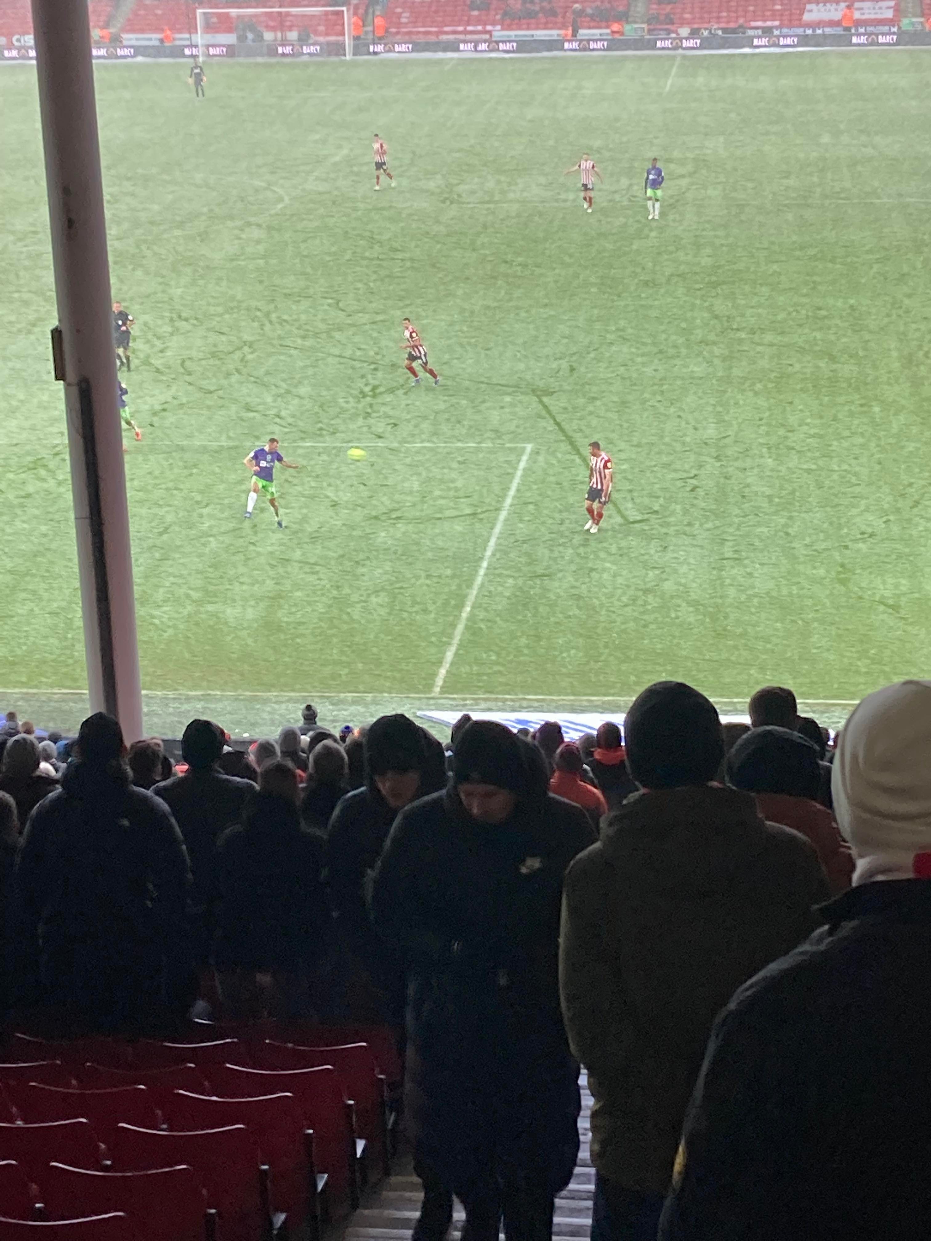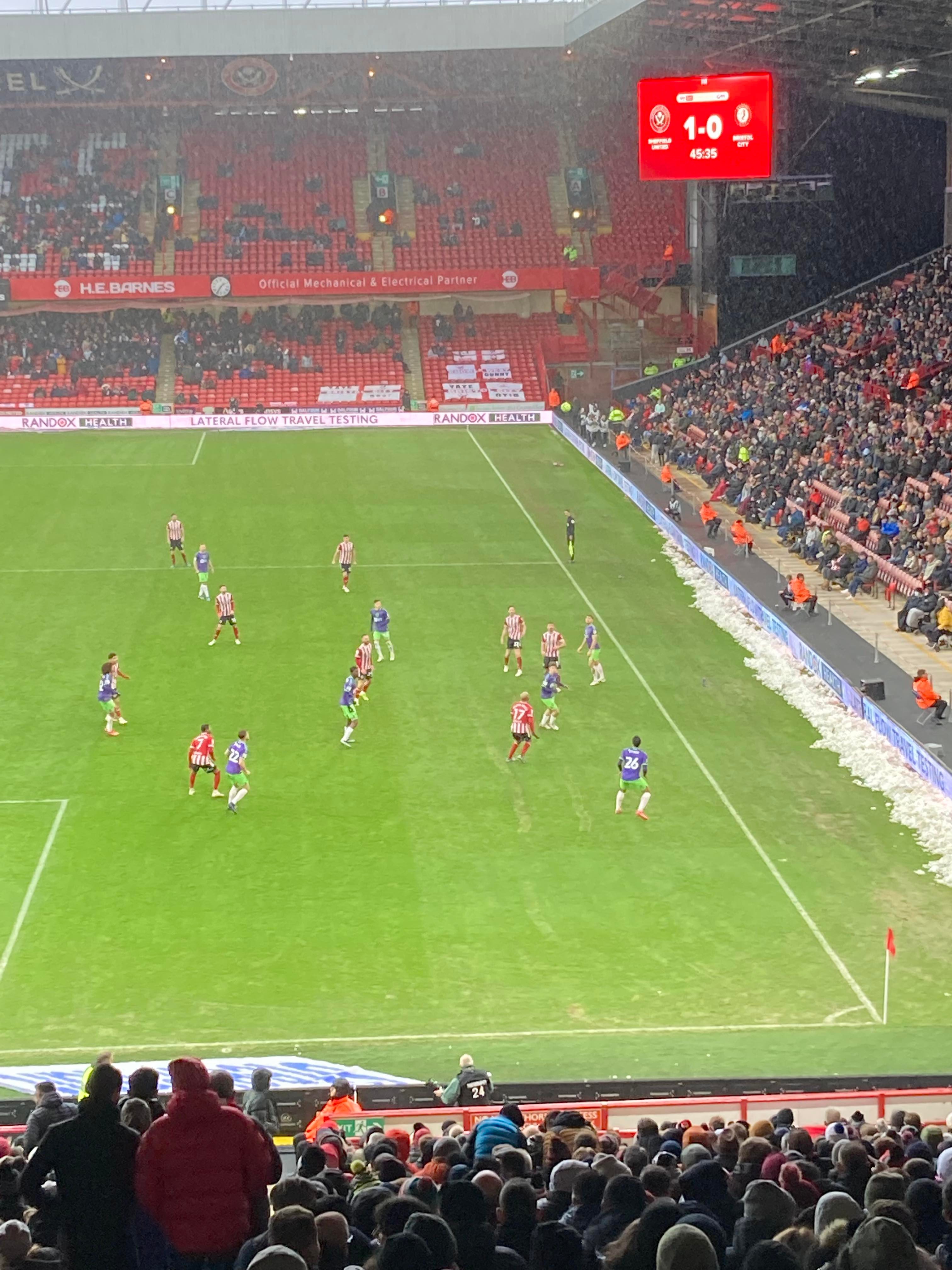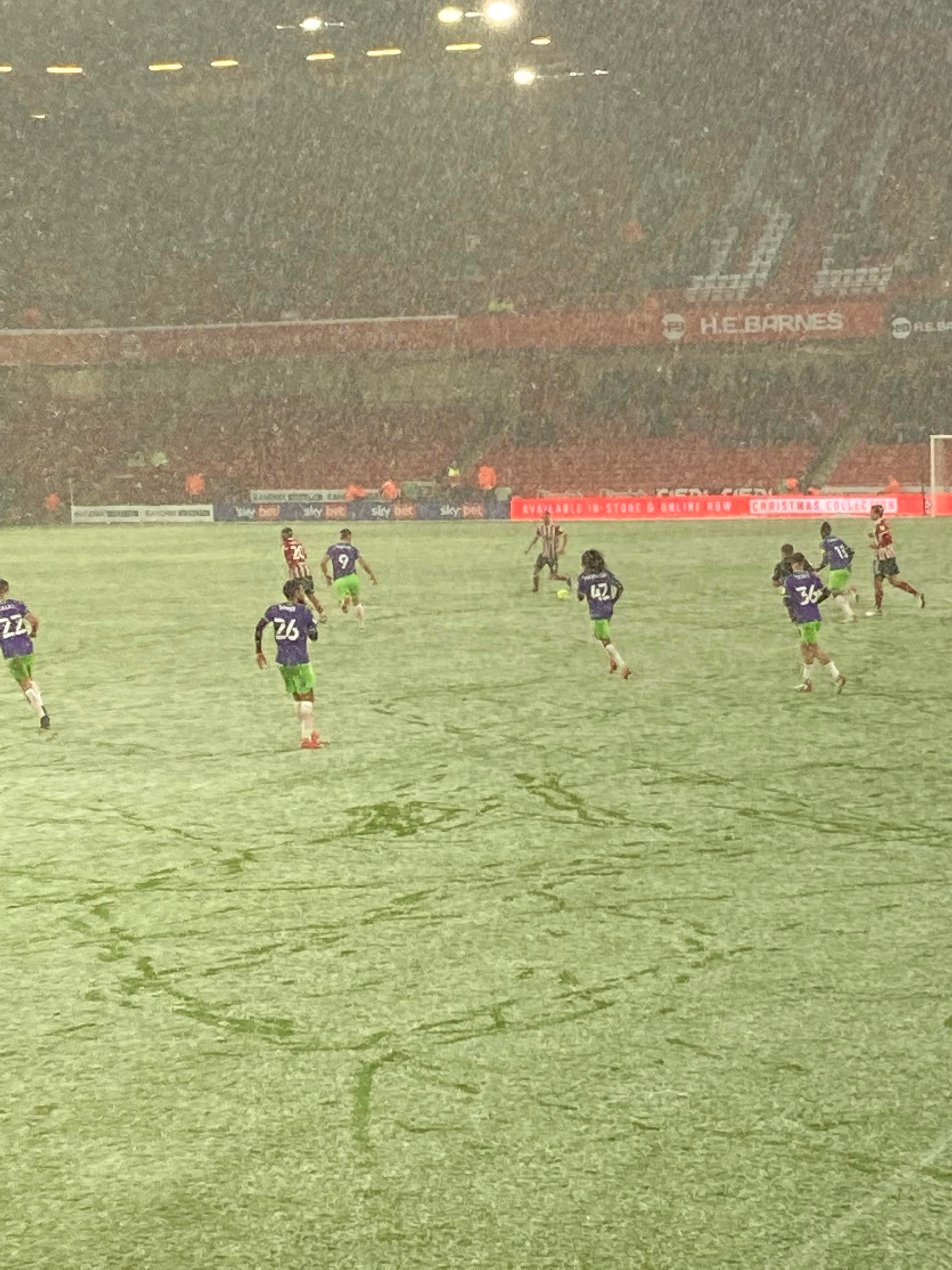 “UNITED! UNITED!” 28 minutes now and United have a throw in on the right, it’s played in, United work it across to Conor Hourihane on the edge of the box and he shoots… Keeper saves! The snow is coming down here in Sheffield now!! 33rd minute and United work it across the Bristol box, it’s on the right and crossed in, it comes to Enda Stevens on the edge of the box for the volley… Over!