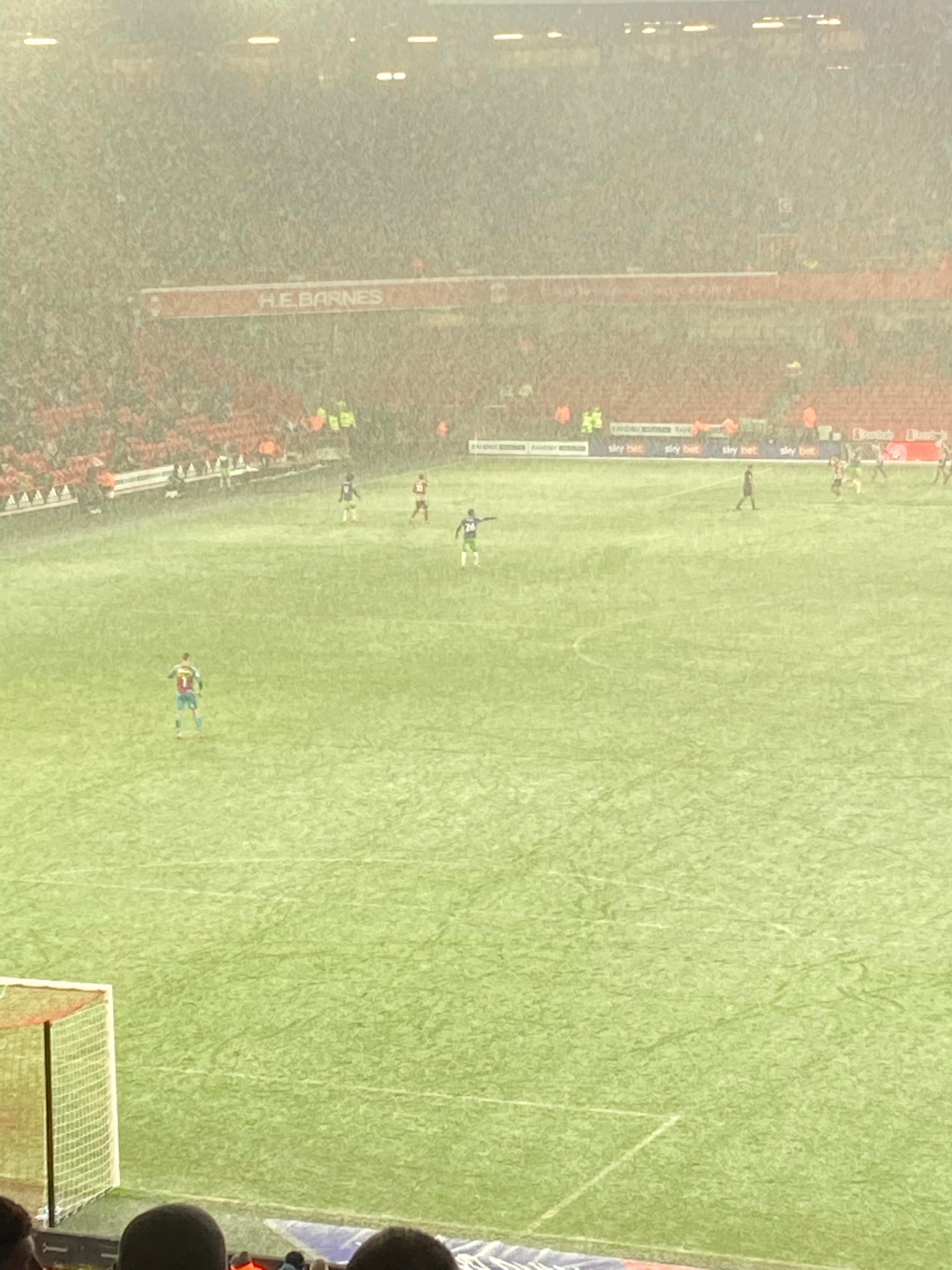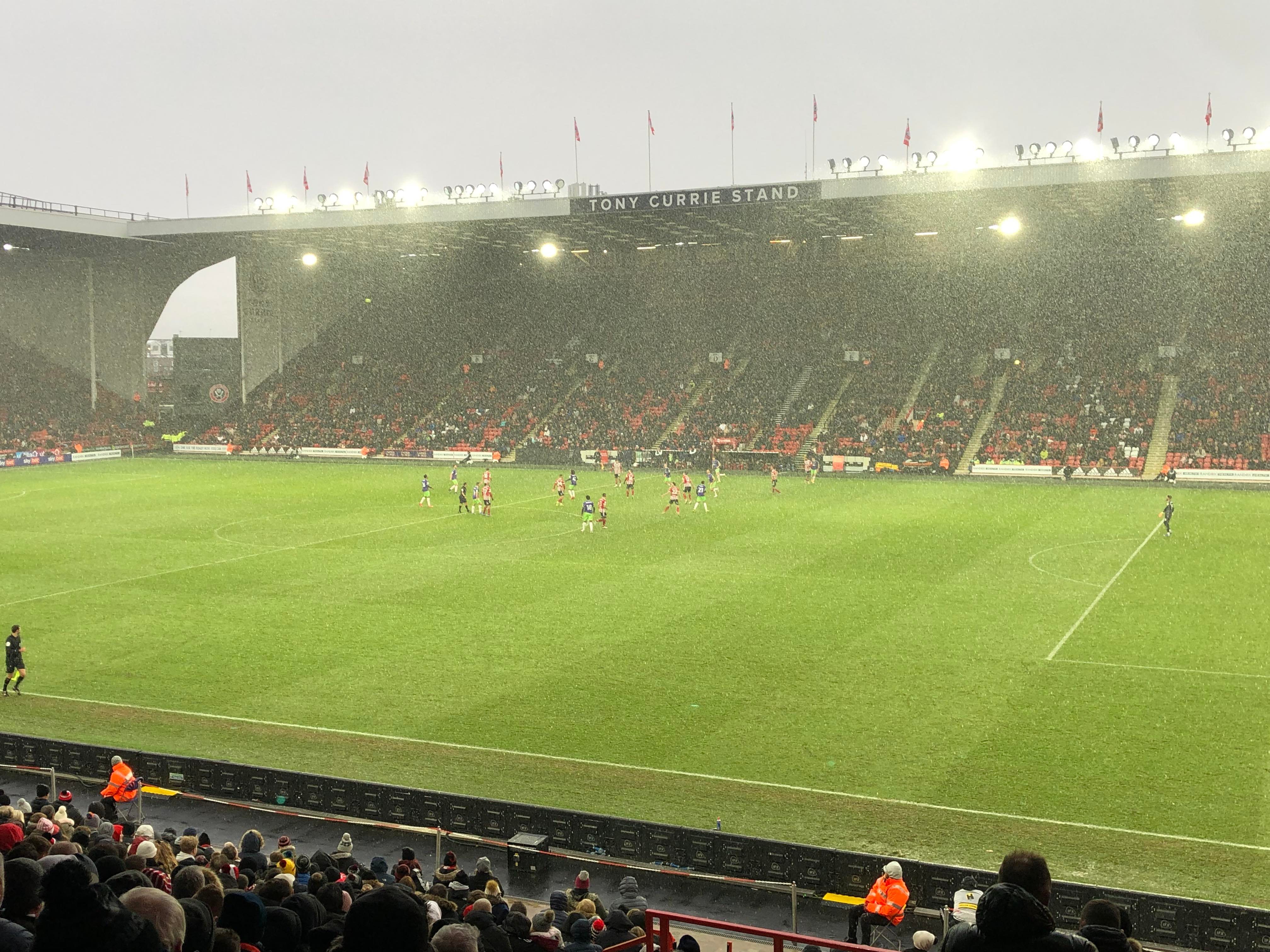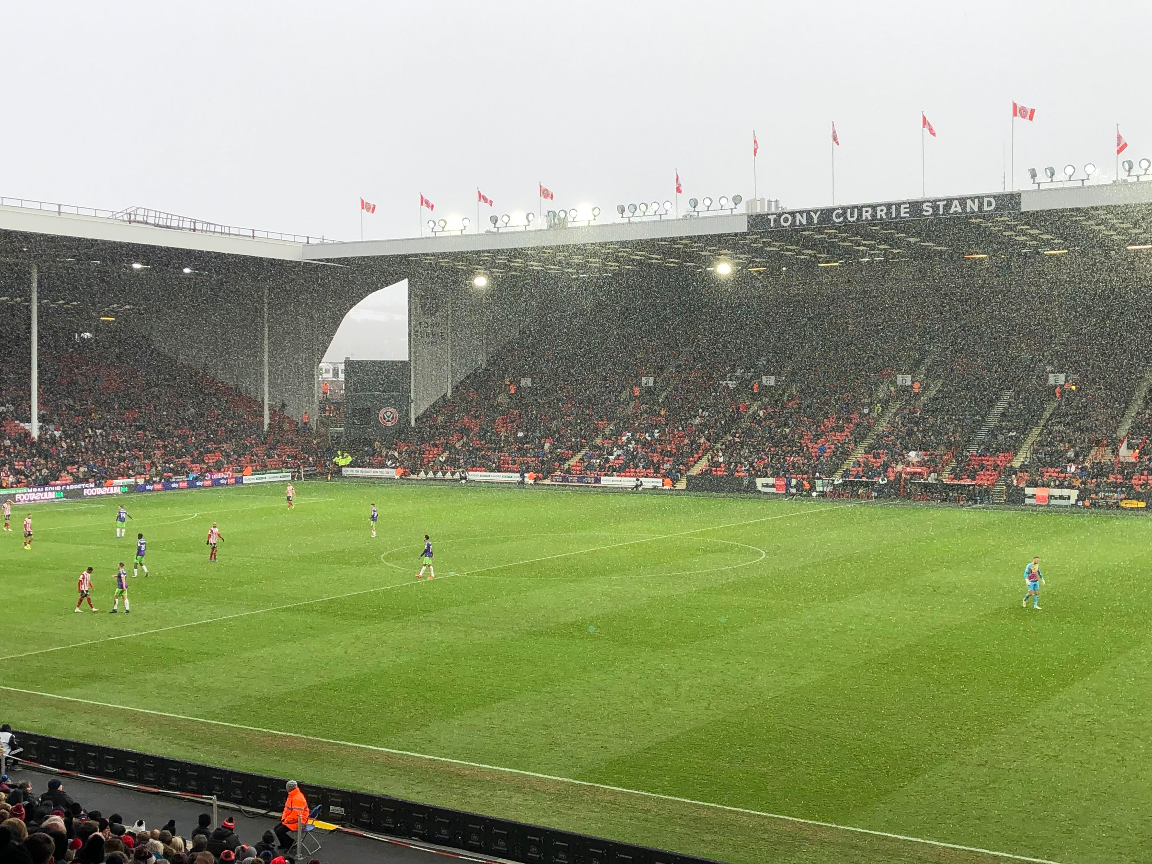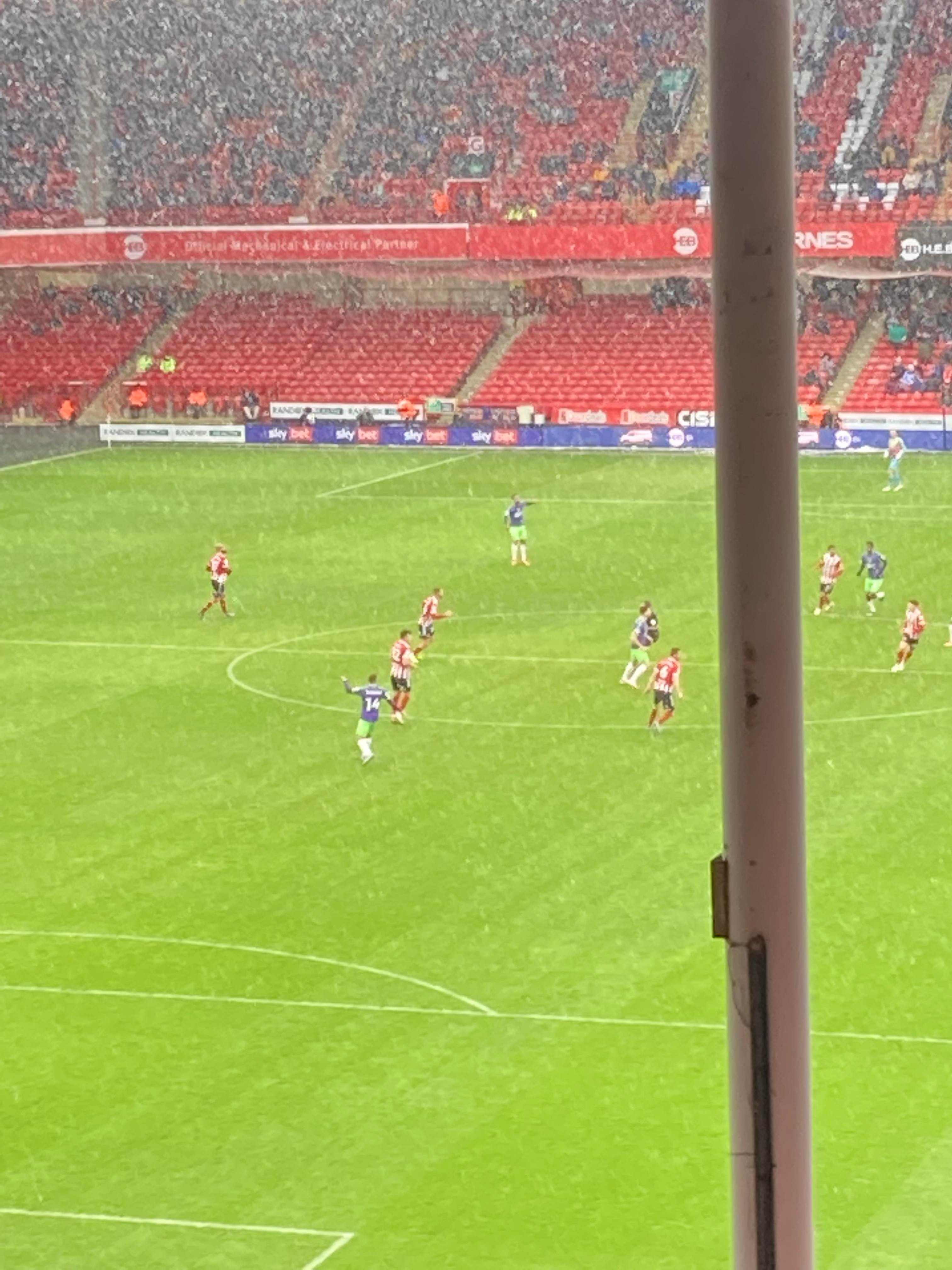 “UNITED! UNITED!” 28 minutes now and United have a throw in on the right, it’s played in, United work it across to Conor Hourihane on the edge of the box and he shoots… Keeper saves! The snow is coming down here in Sheffield now!! 33rd minute and United work it across the Bristol box, it’s on the right and crossed in, it comes to Enda Stevens on the edge of the box for the volley… Over!