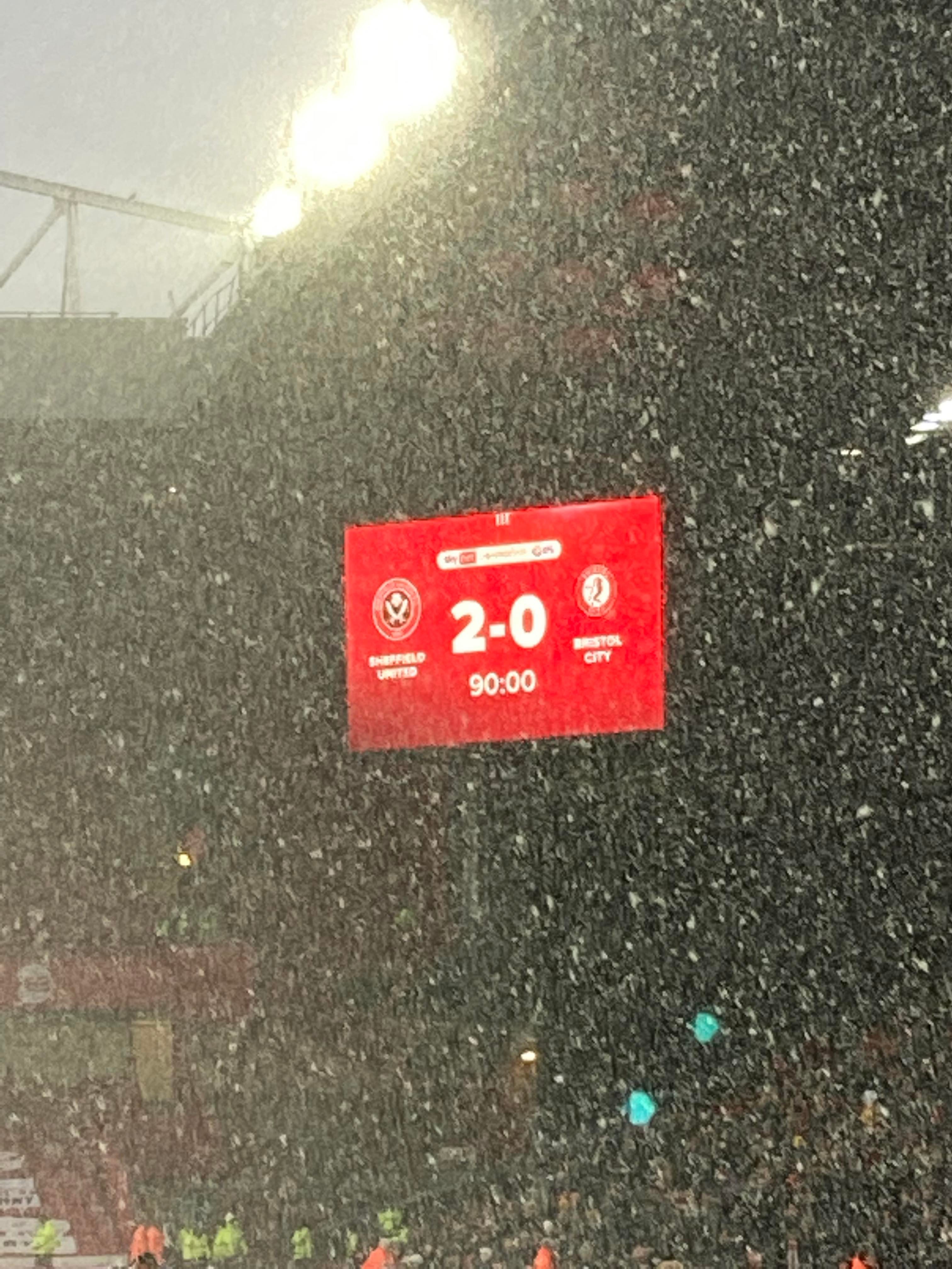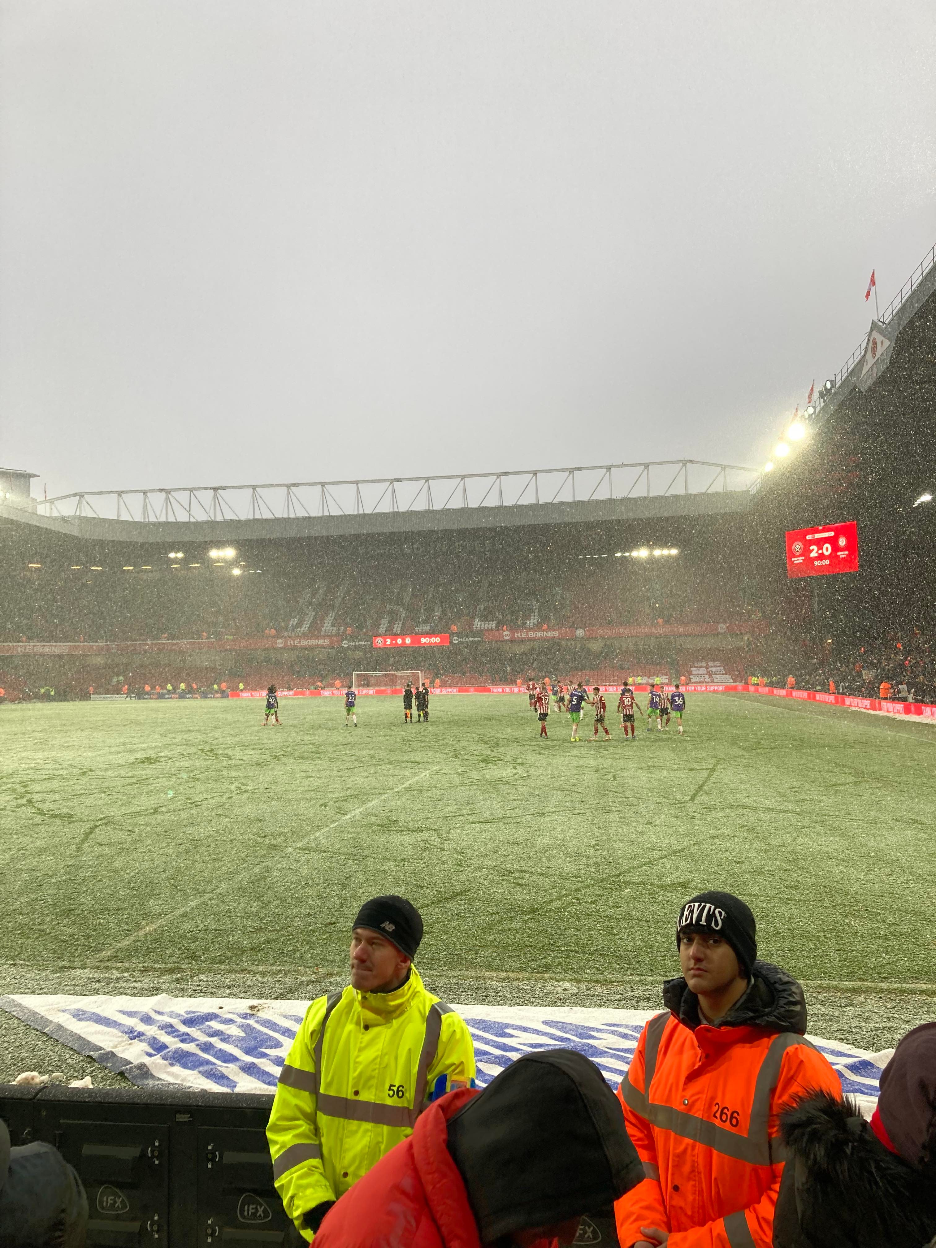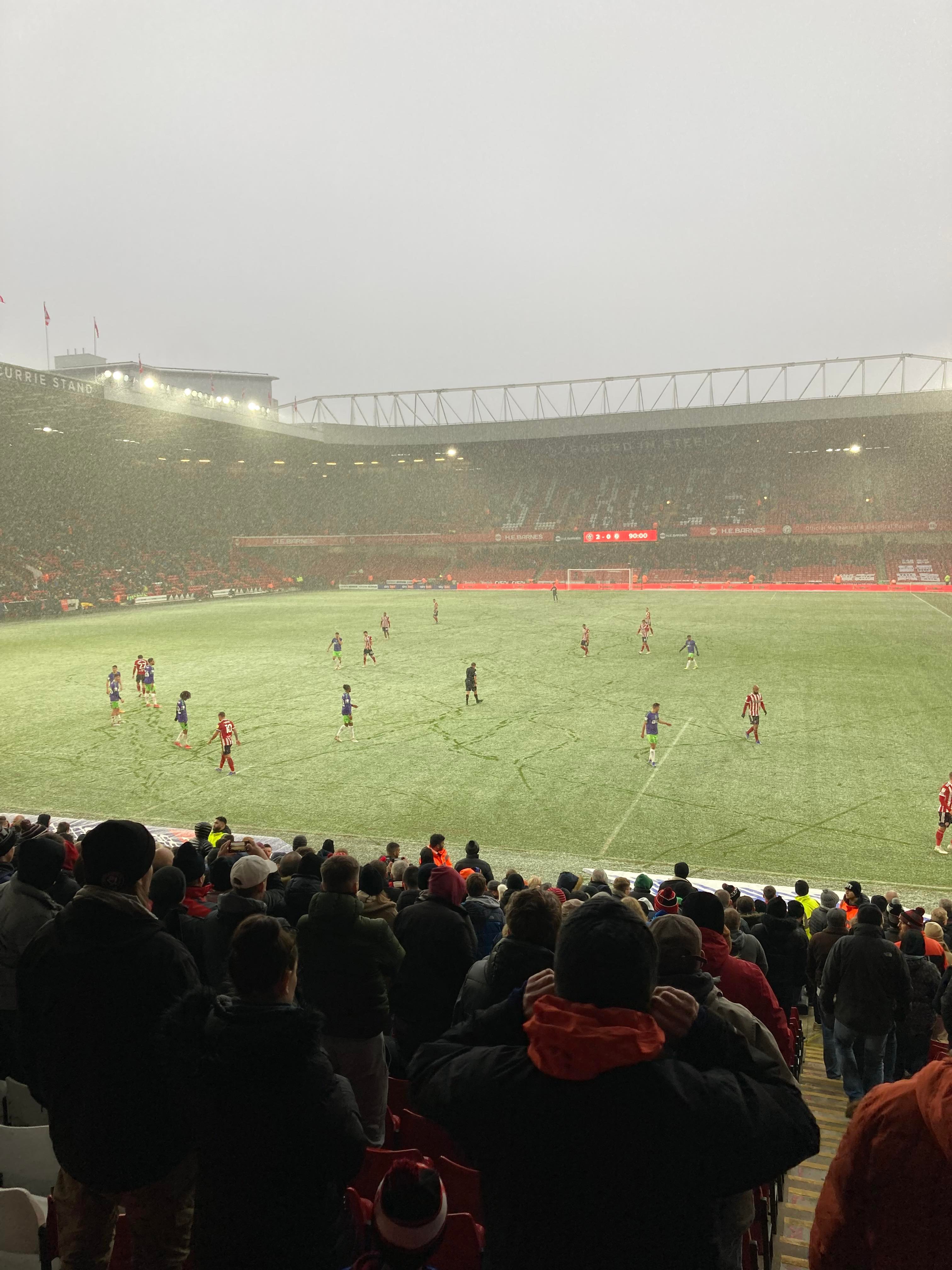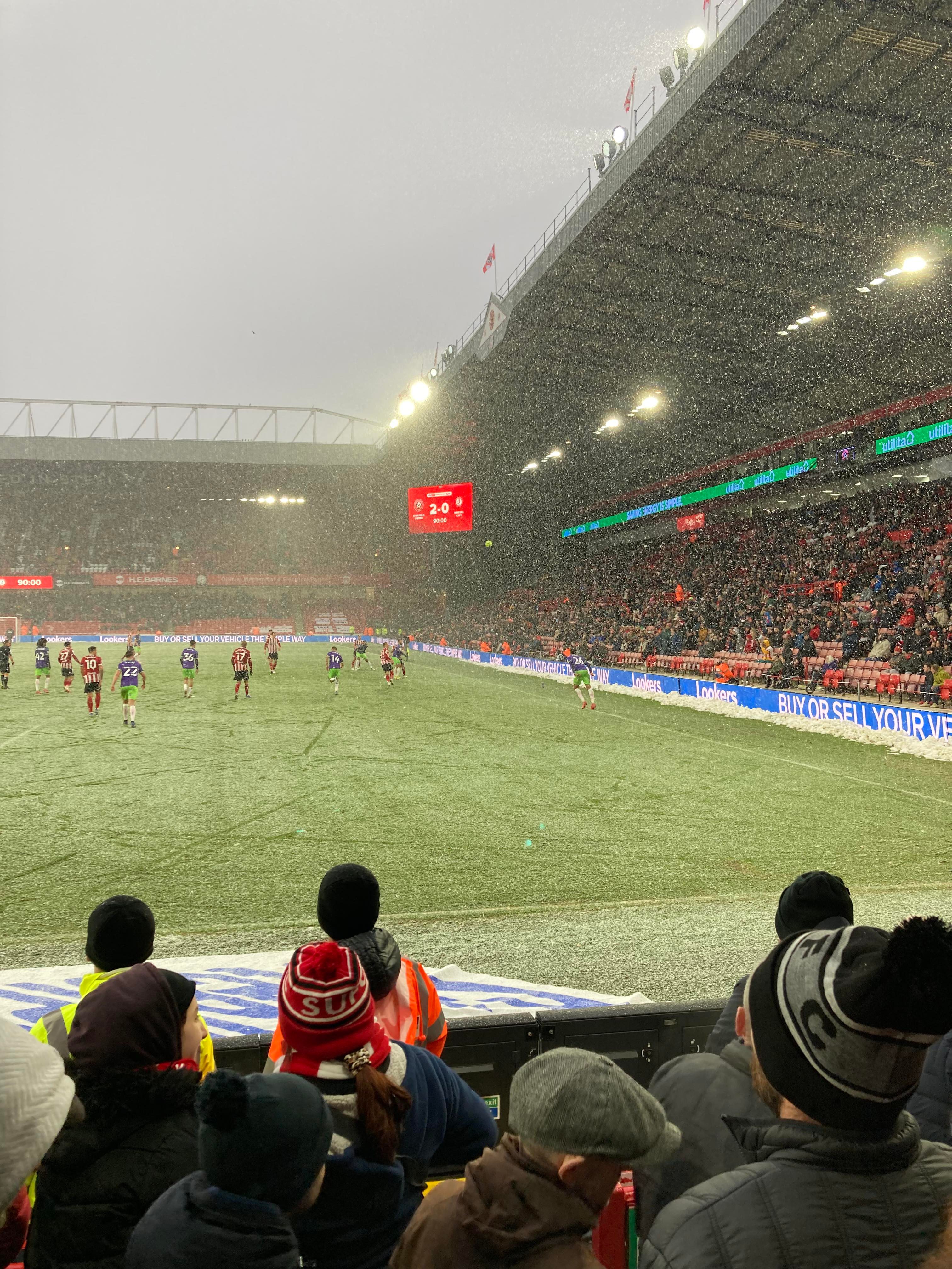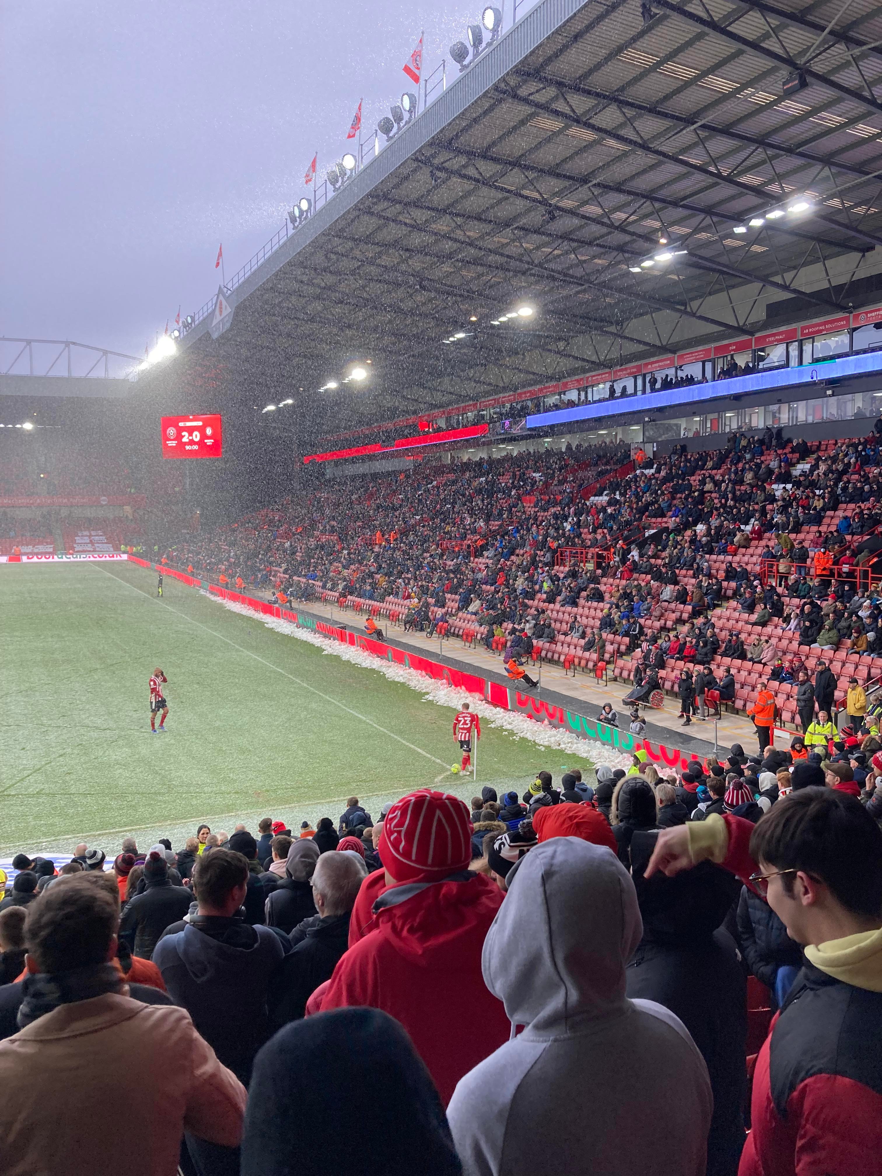 “You fill up my senses!” Echoing around the ground now! About 3 minutes into stoppage time and United play the ball from the right wing into David McGoldrick who plays it through to Morgan Gibbs-White who gets into the box, this to finish it!!! No! He’s put it wide!! The snow is starting to settle on the pitch but the game hasn’t been affected and the Referee blows for full time after a lengthy period of injury time!! Perfect start for Heckingbottom!