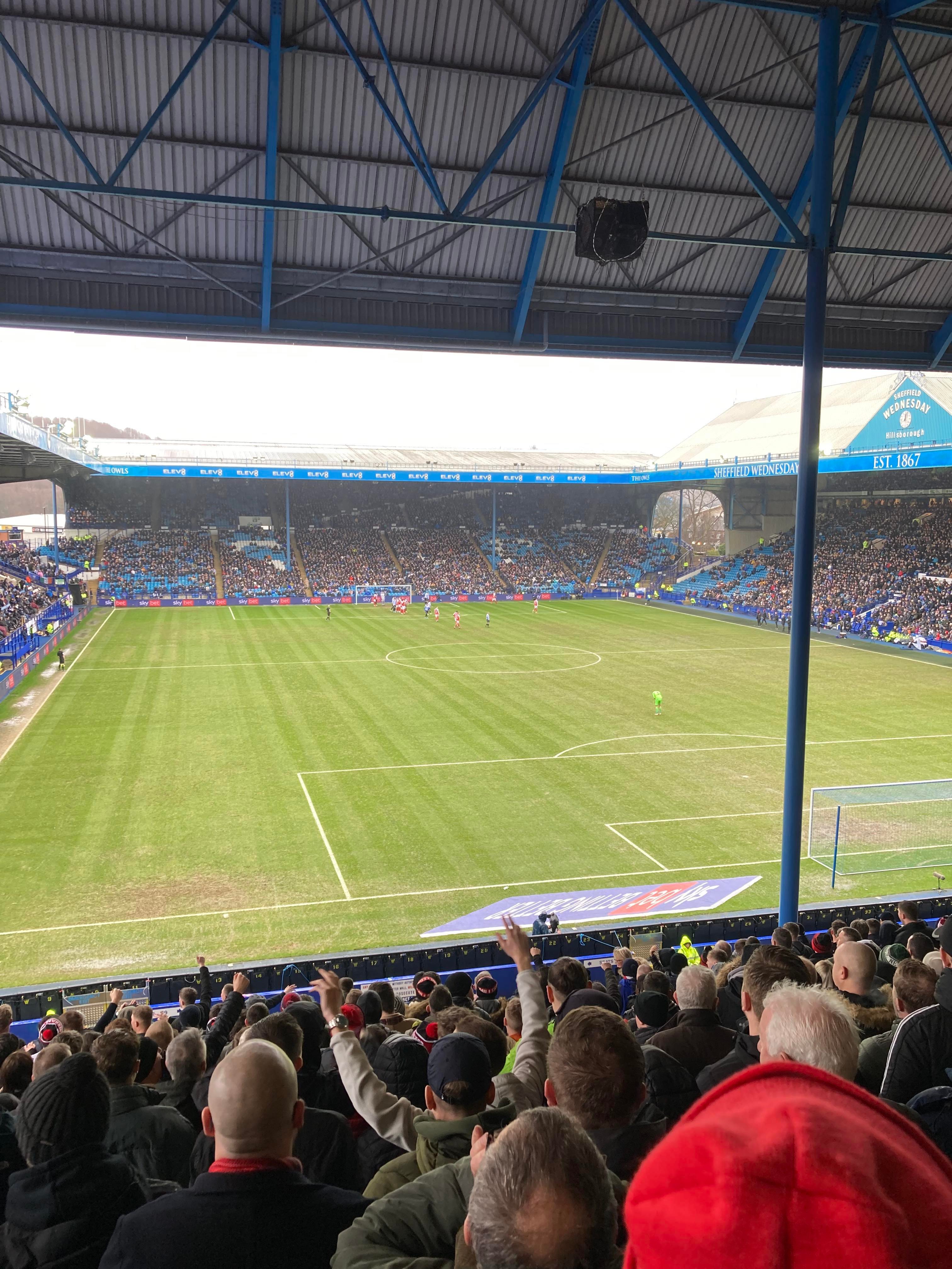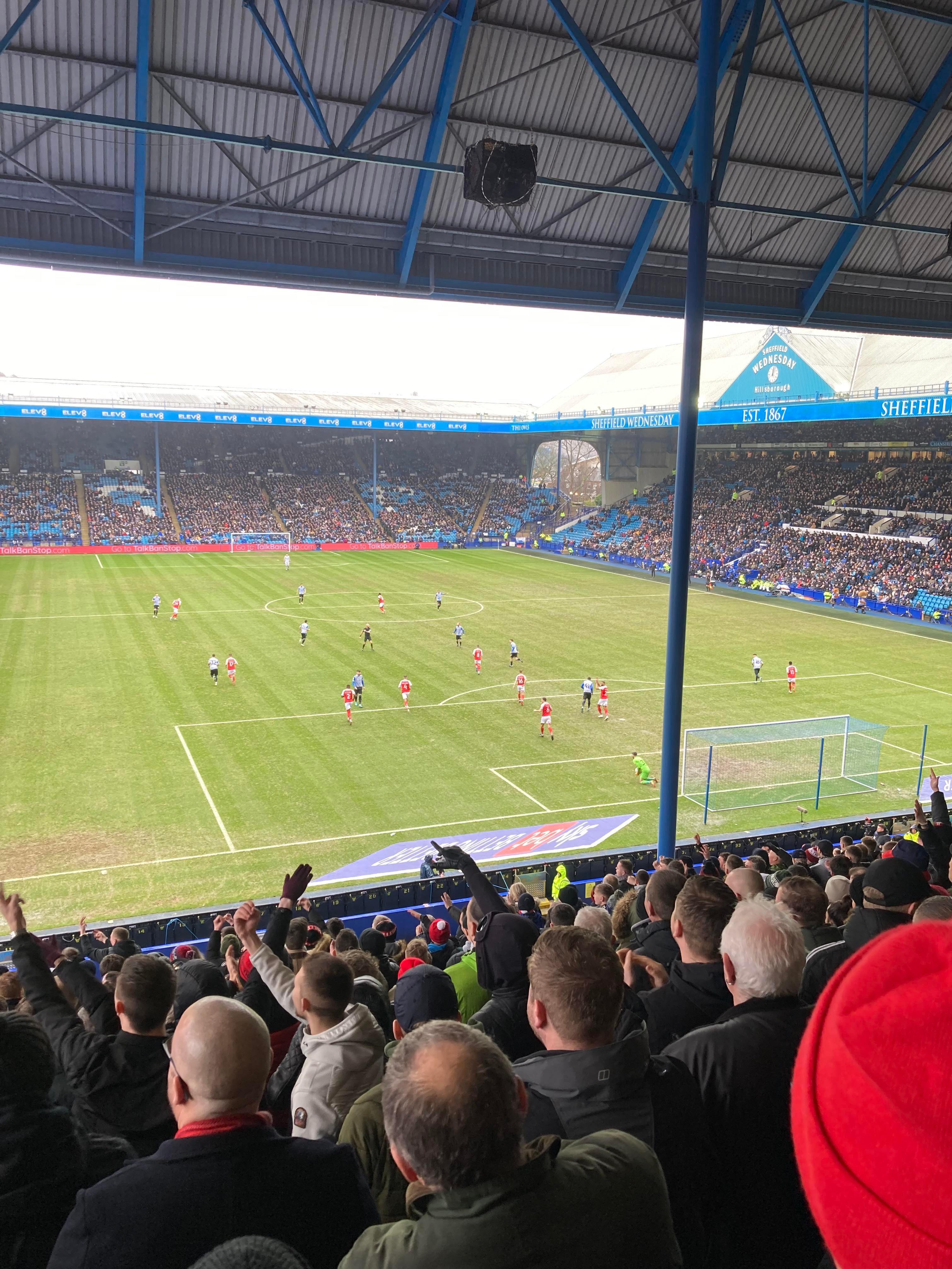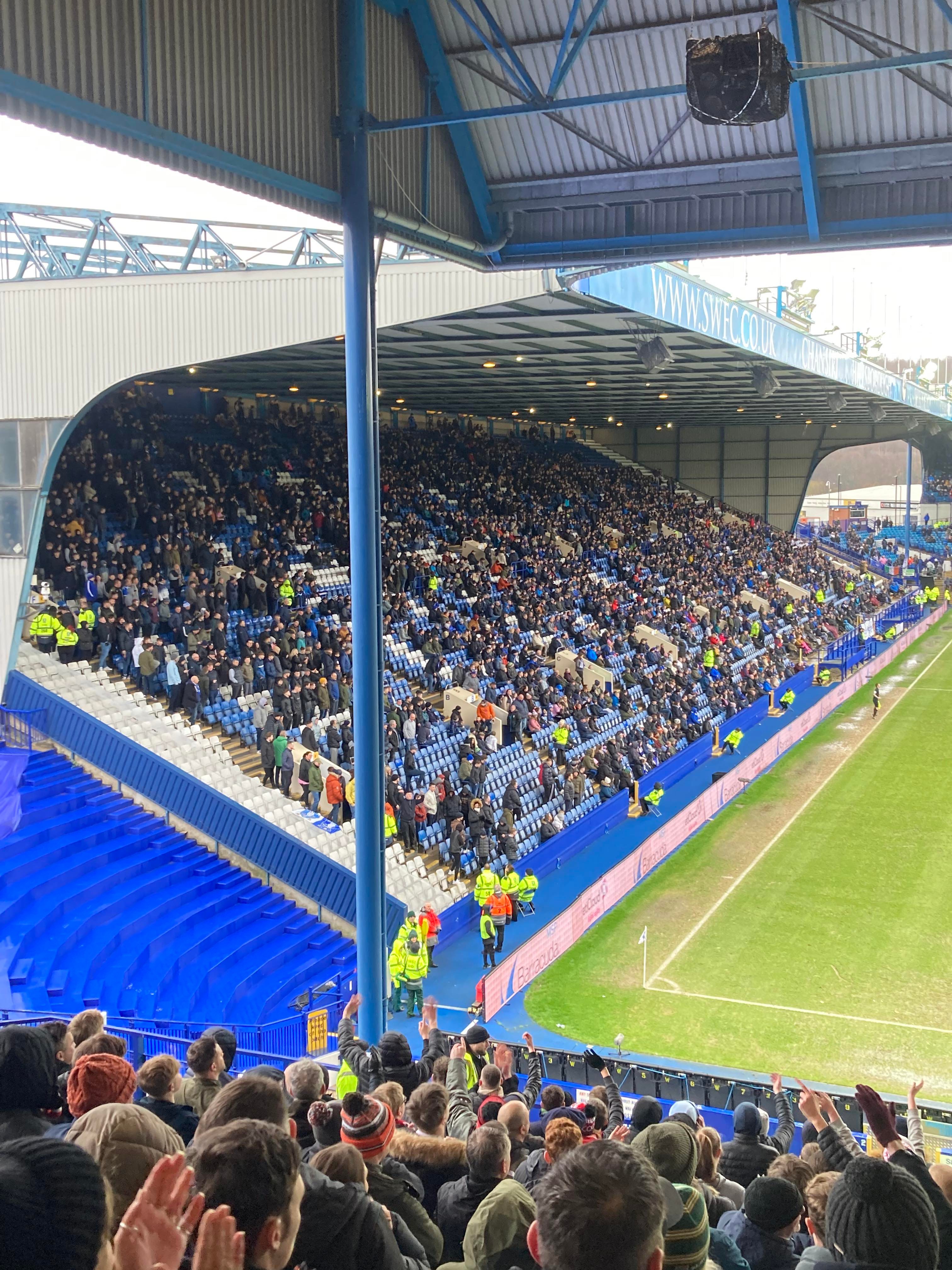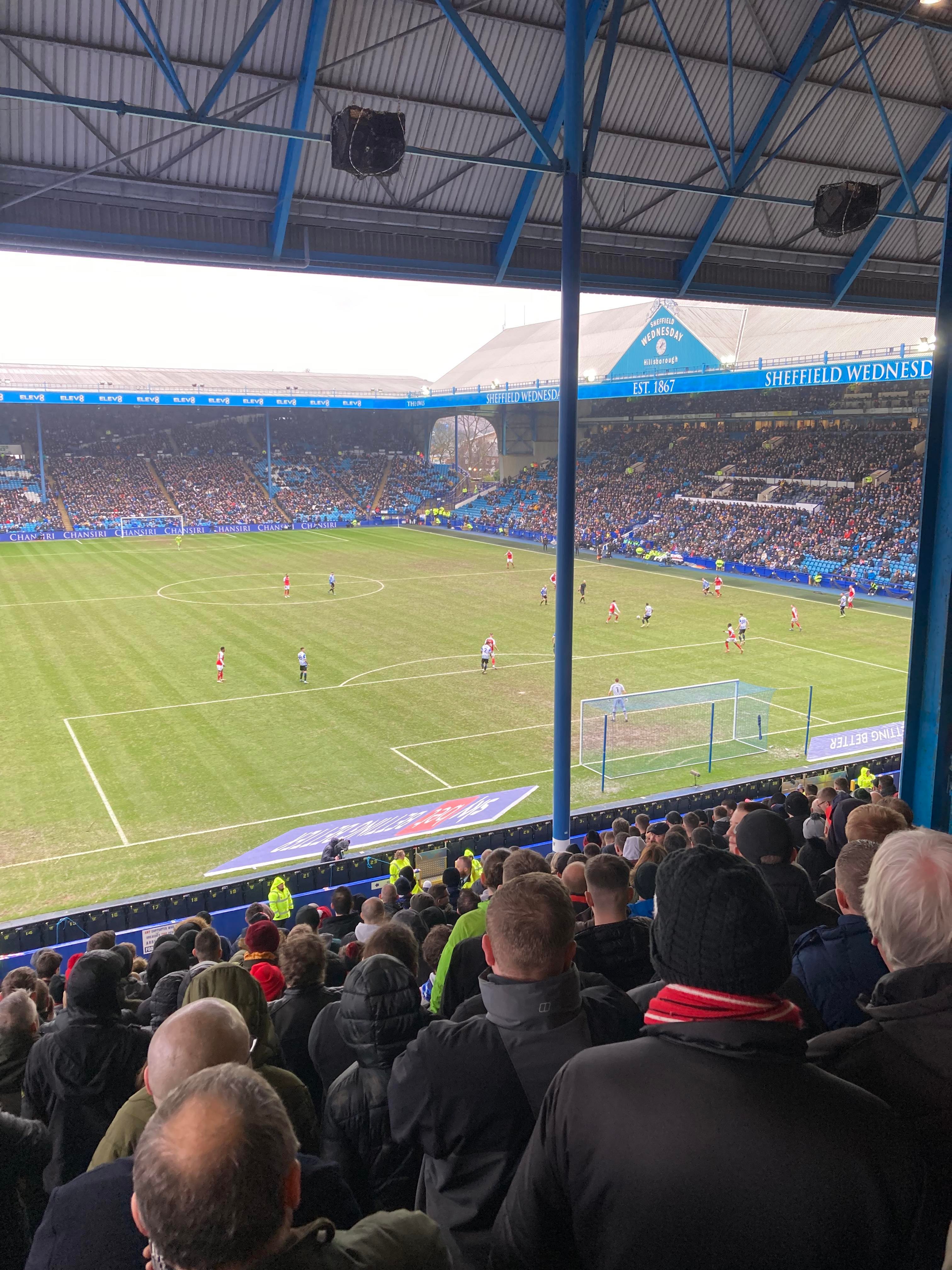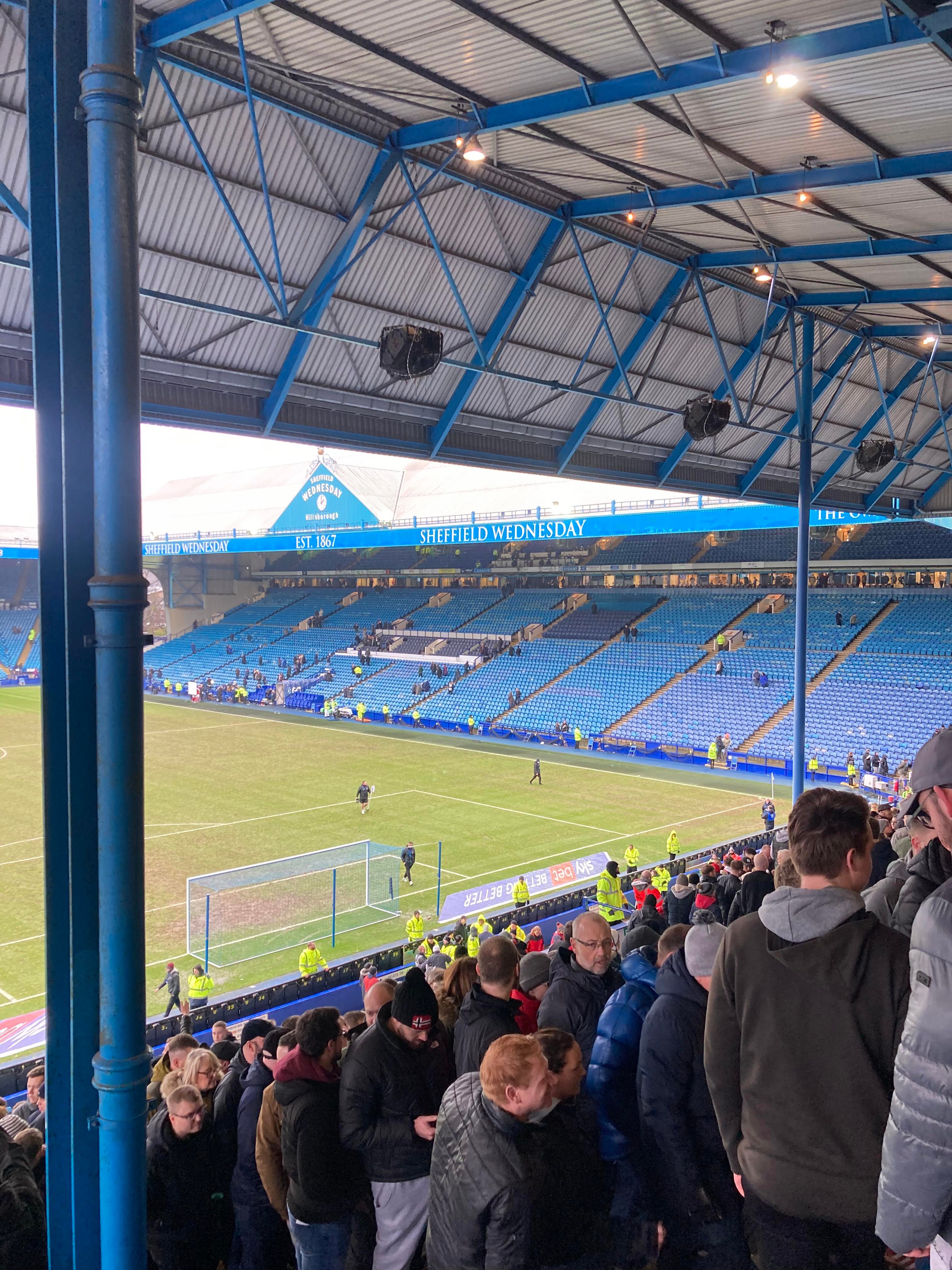 The short walk over to the University of Sheffield tram stop and now the tram to Hillsborough. It’s pretty rammed… Certainly picked a good time! 10 minutes later and here I am in Hillsborough! Now for the short walk over to Hillsborough Park and to the ground! Now we wait for the Merry Miller. It’s filling up fast here at Leppings Lane… Tensions are starting to boil over and the atmosphere is starting to build!!
