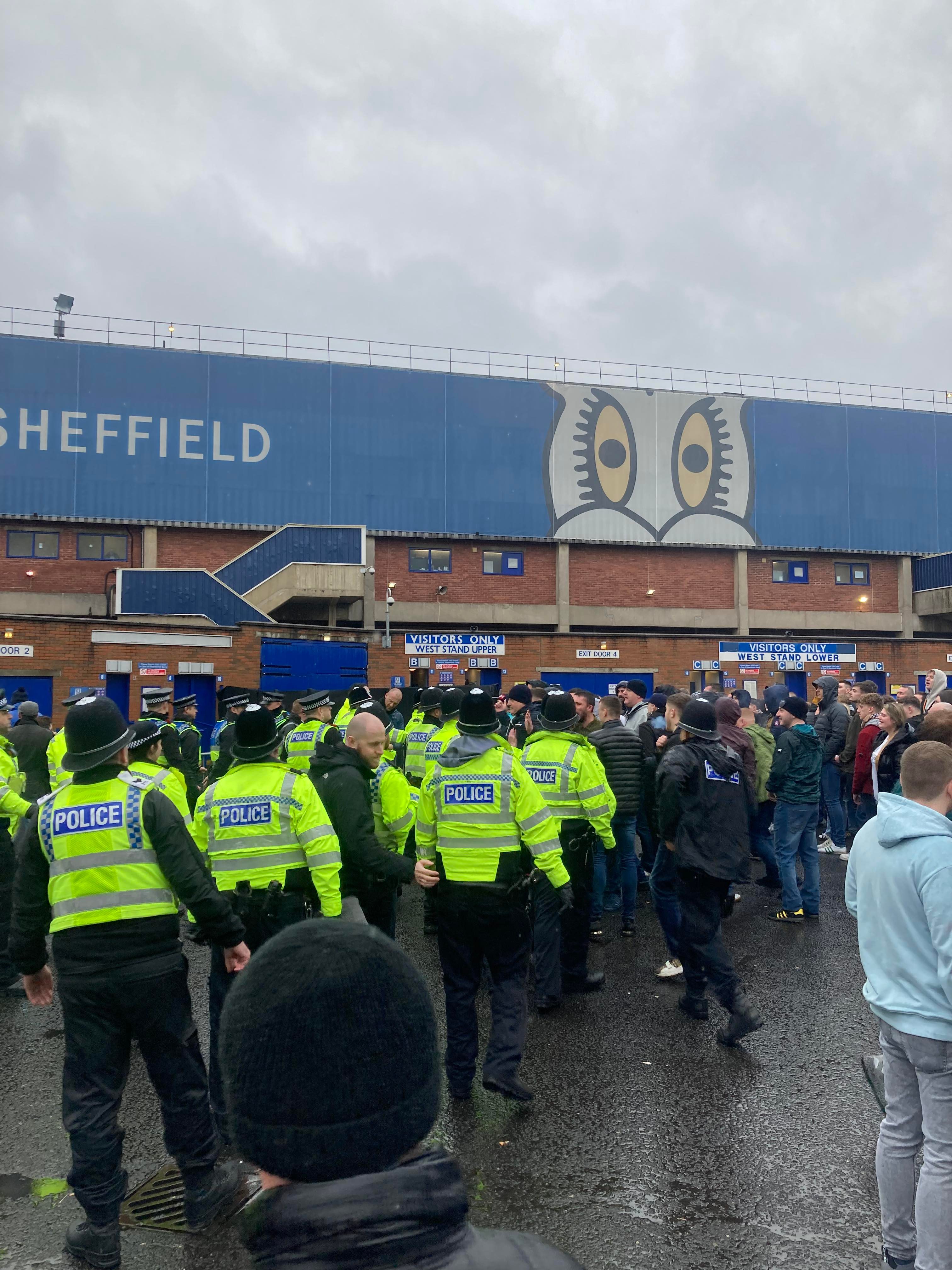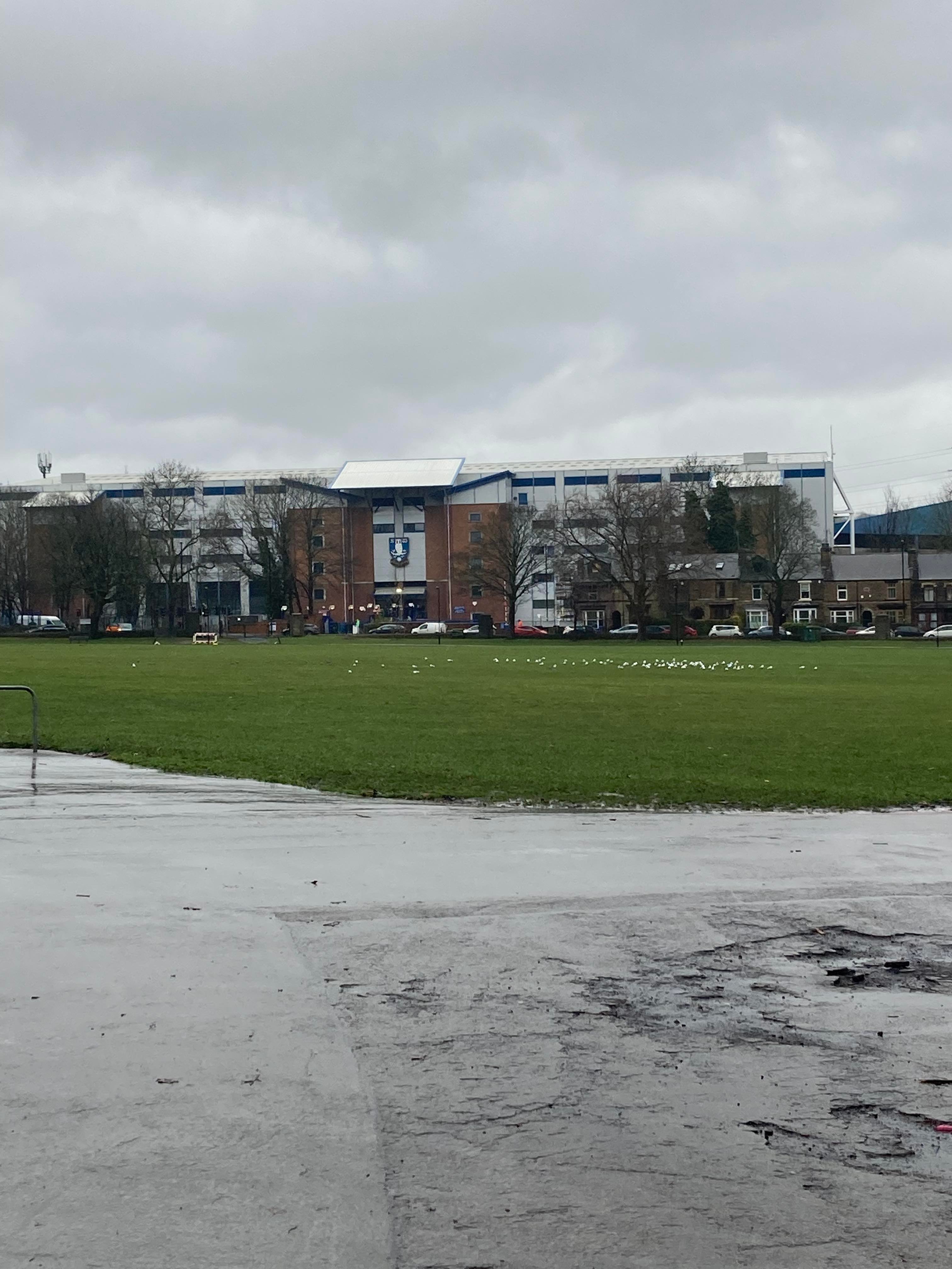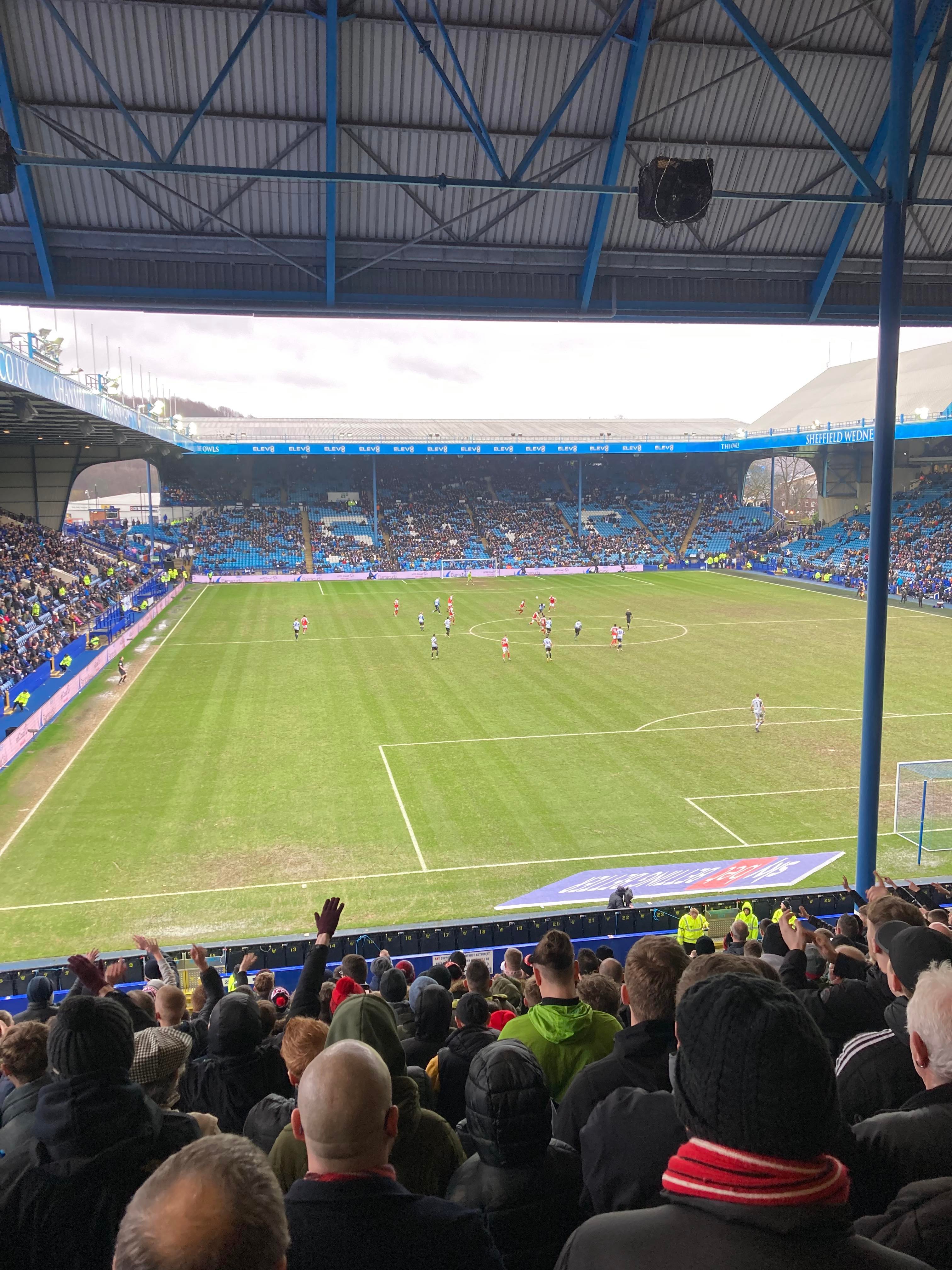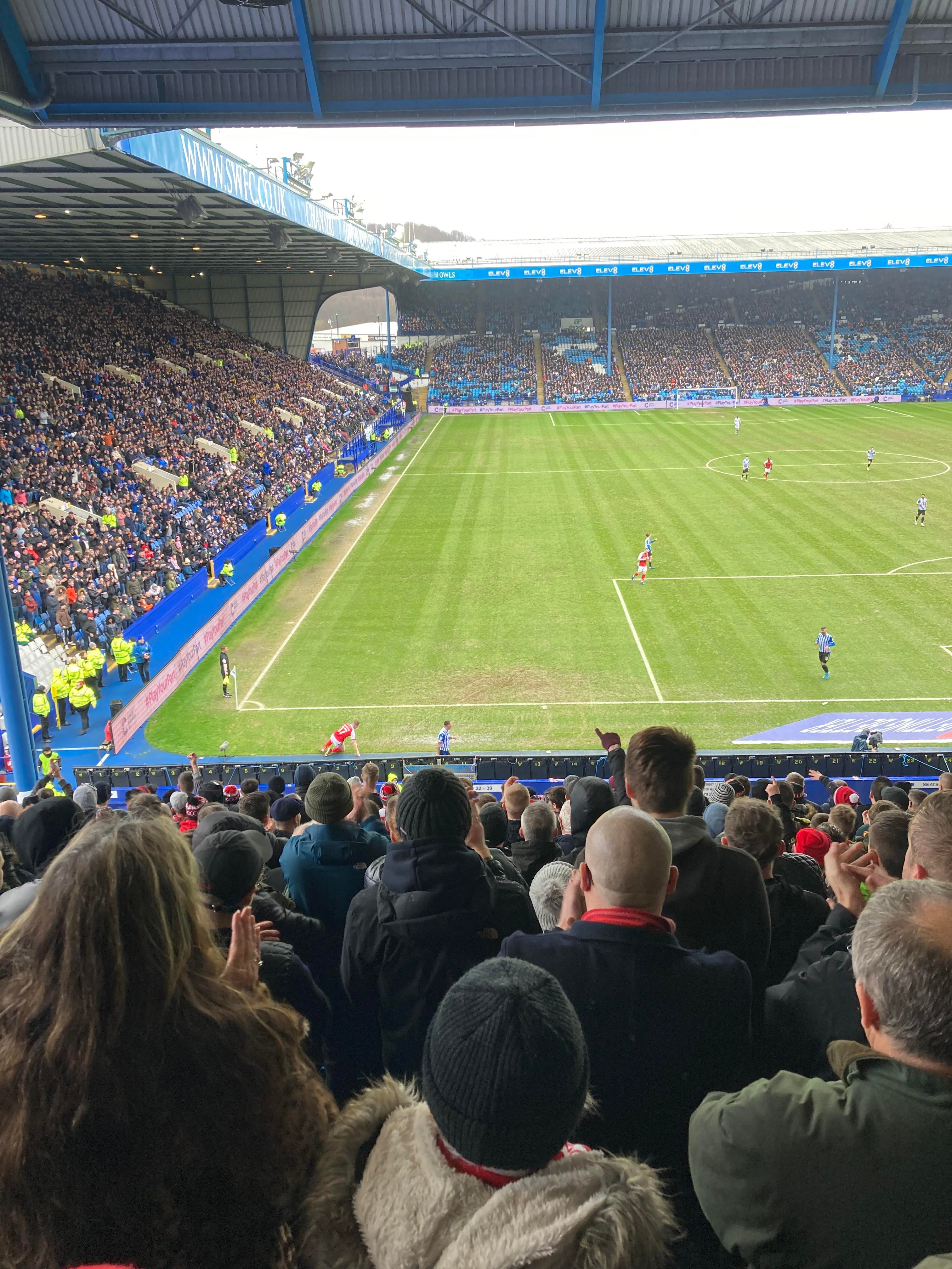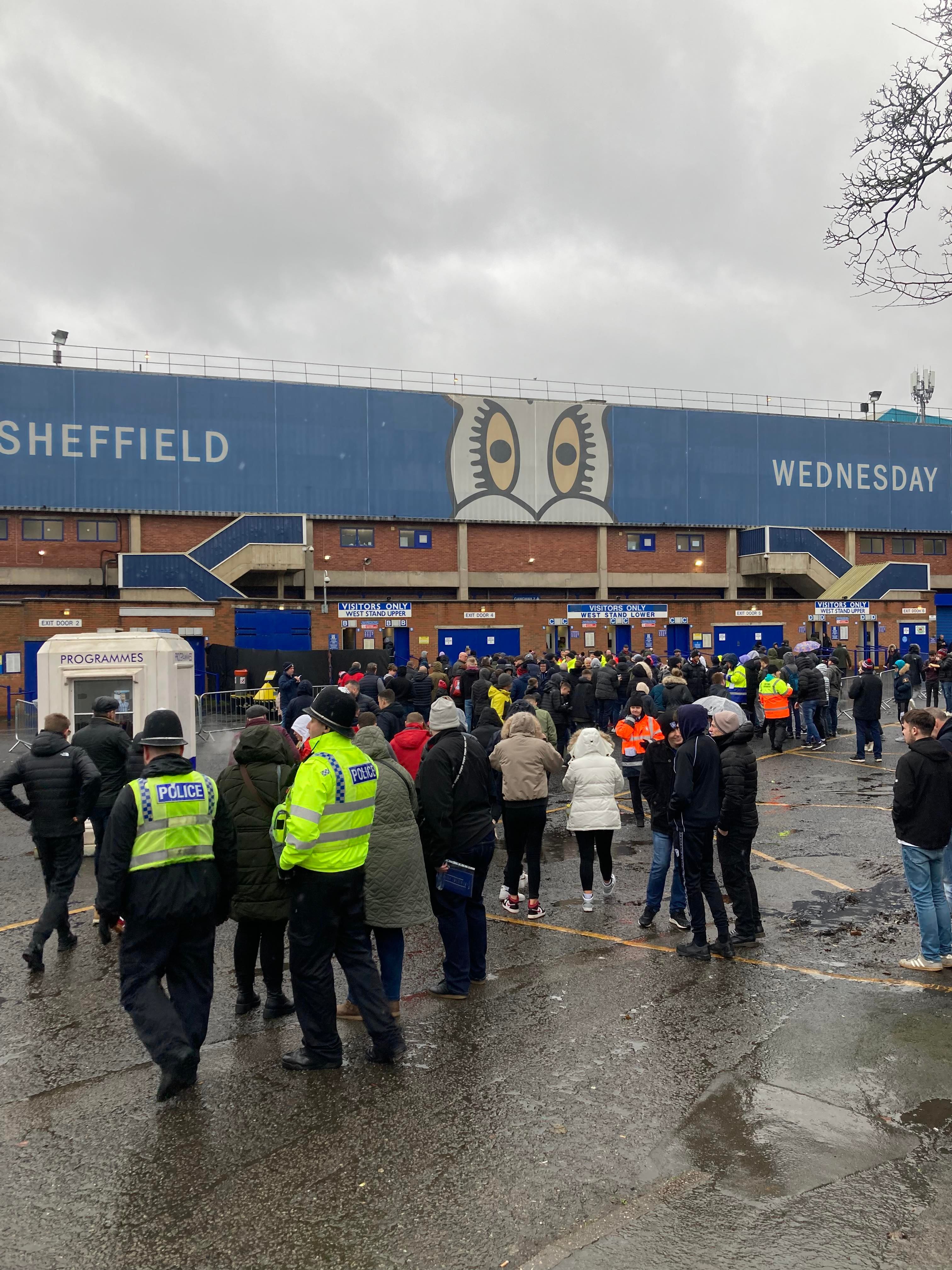 The short walk over to the University of Sheffield tram stop and now the tram to Hillsborough. It’s pretty rammed… Certainly picked a good time! 10 minutes later and here I am in Hillsborough! Now for the short walk over to Hillsborough Park and to the ground! Now we wait for the Merry Miller. It’s filling up fast here at Leppings Lane… Tensions are starting to boil over and the atmosphere is starting to build!!