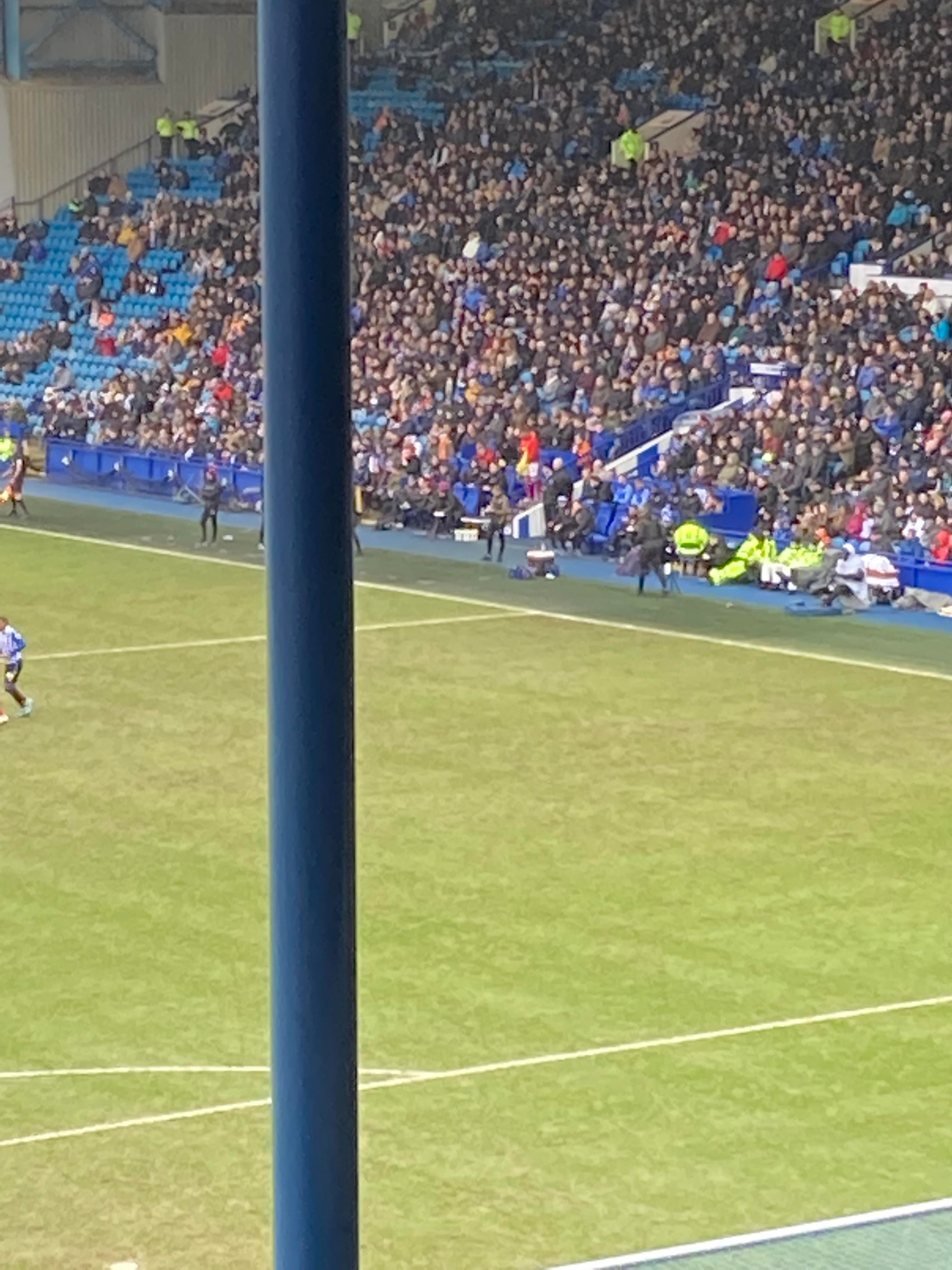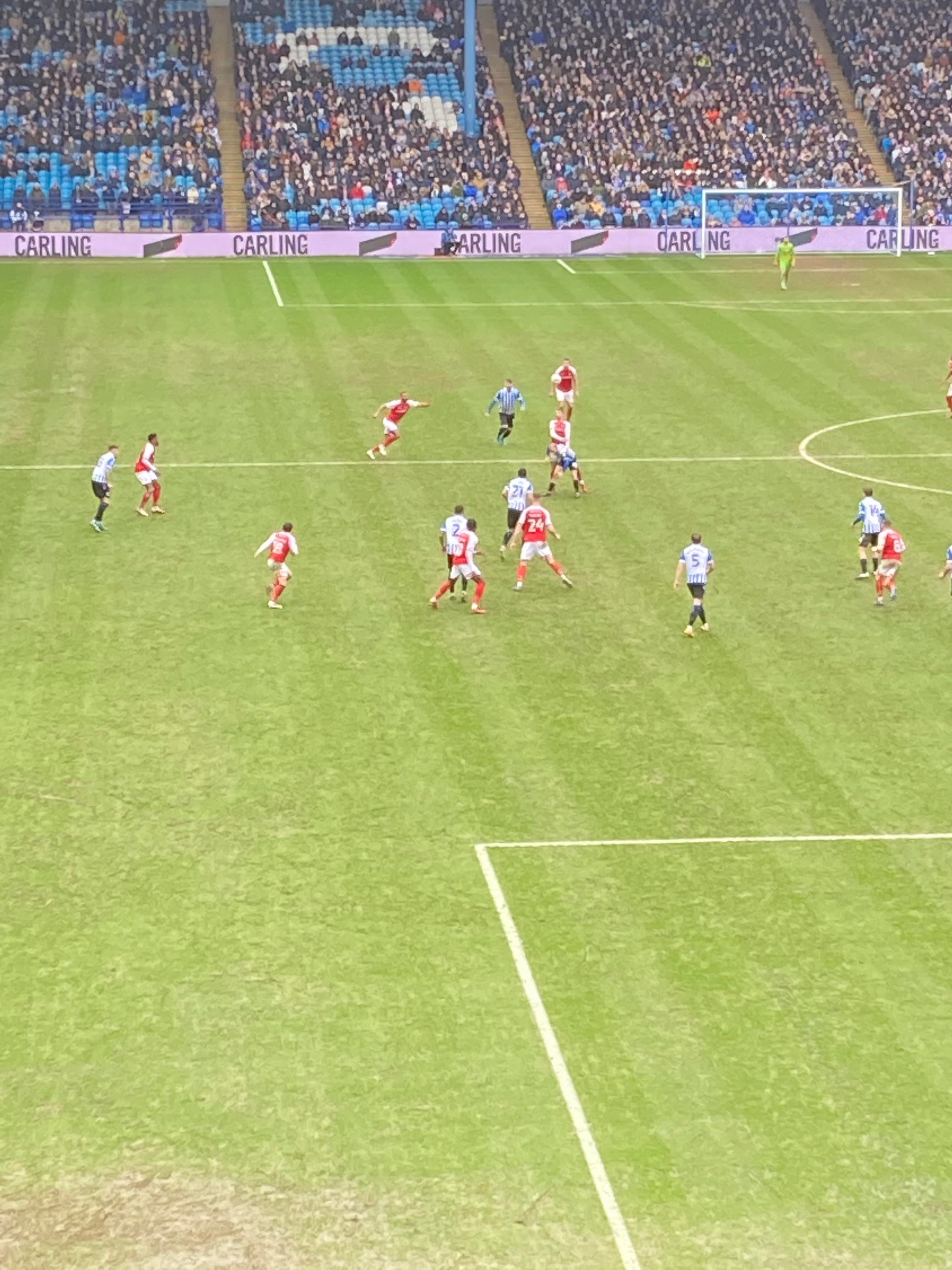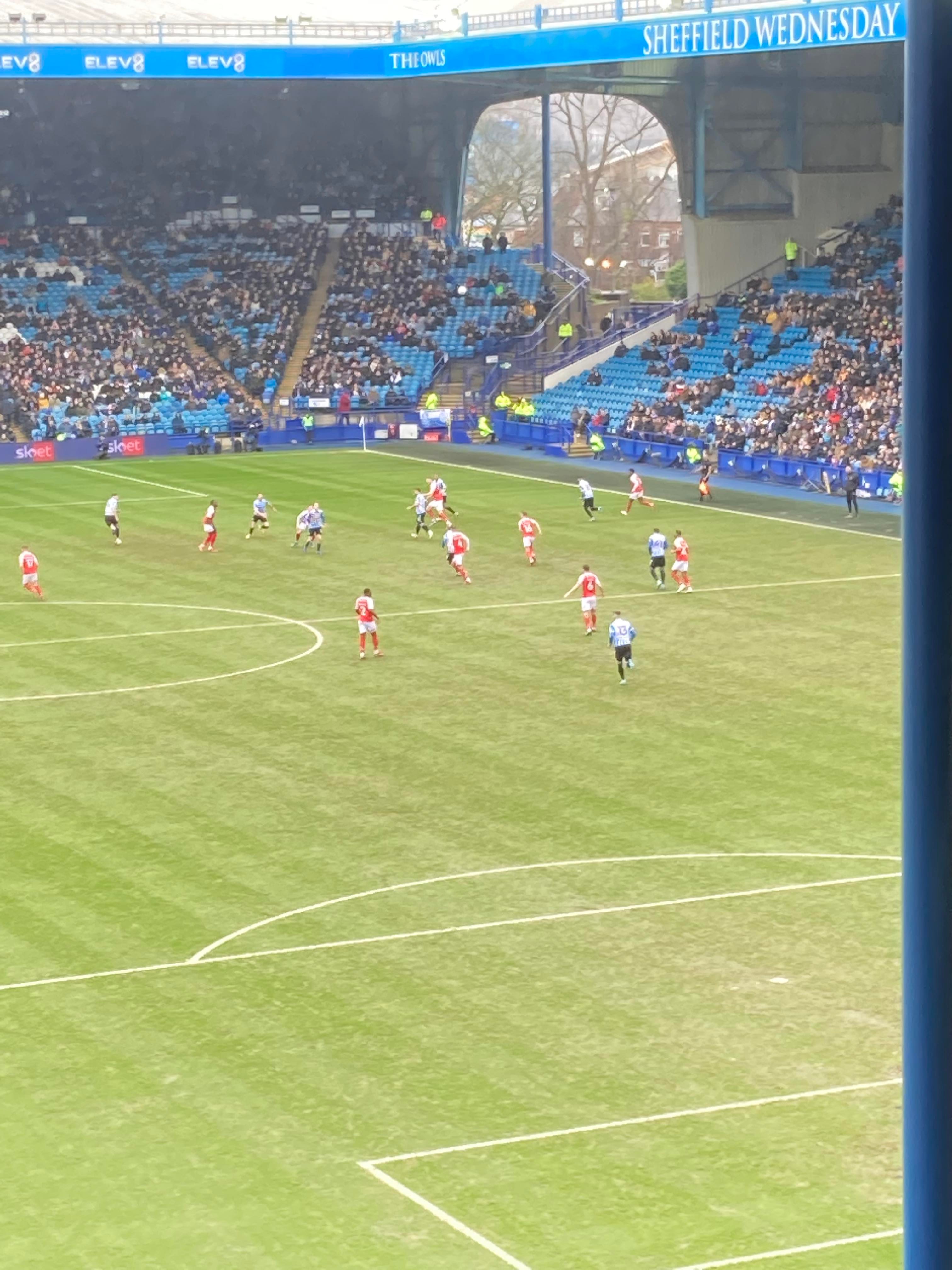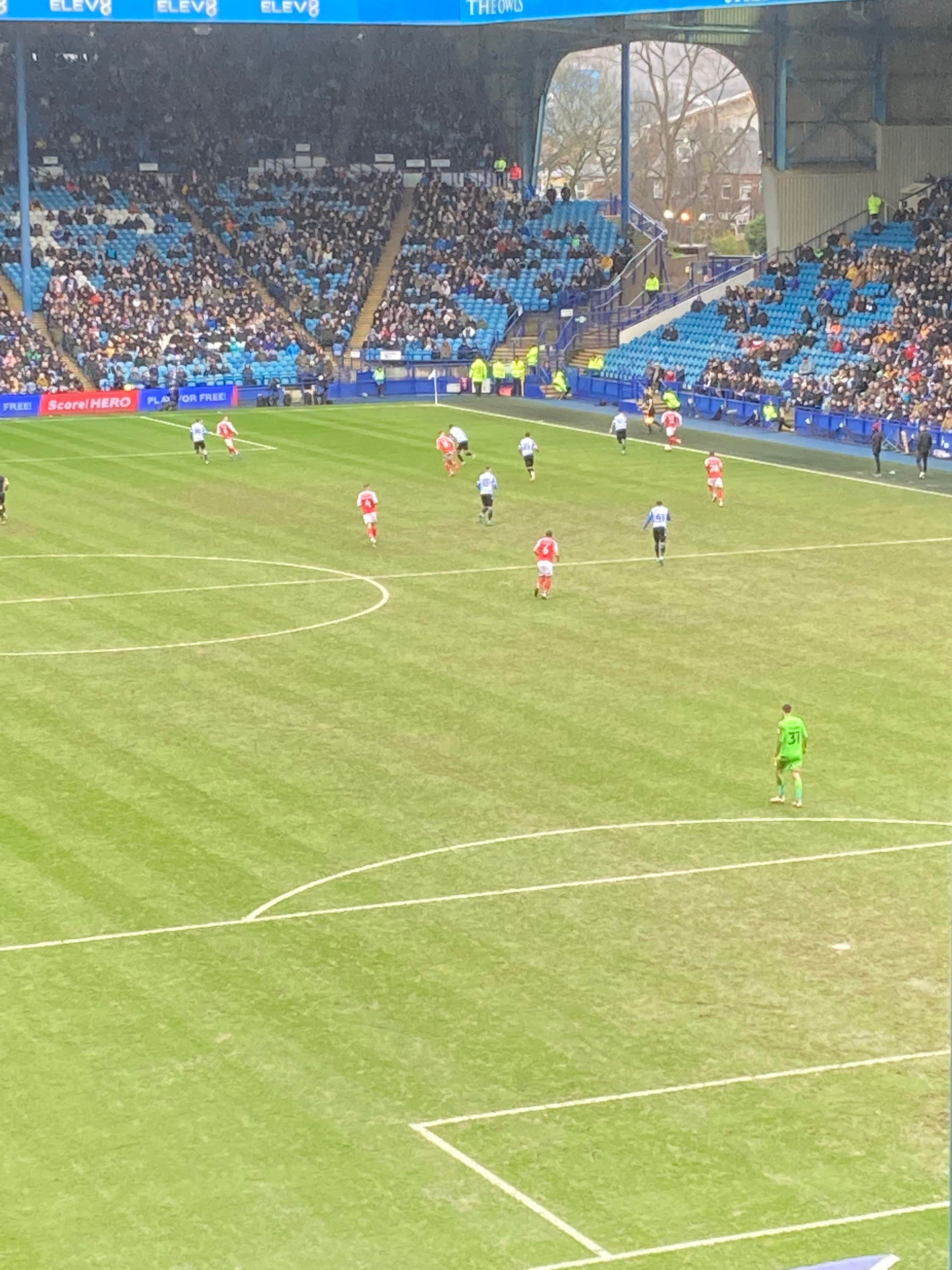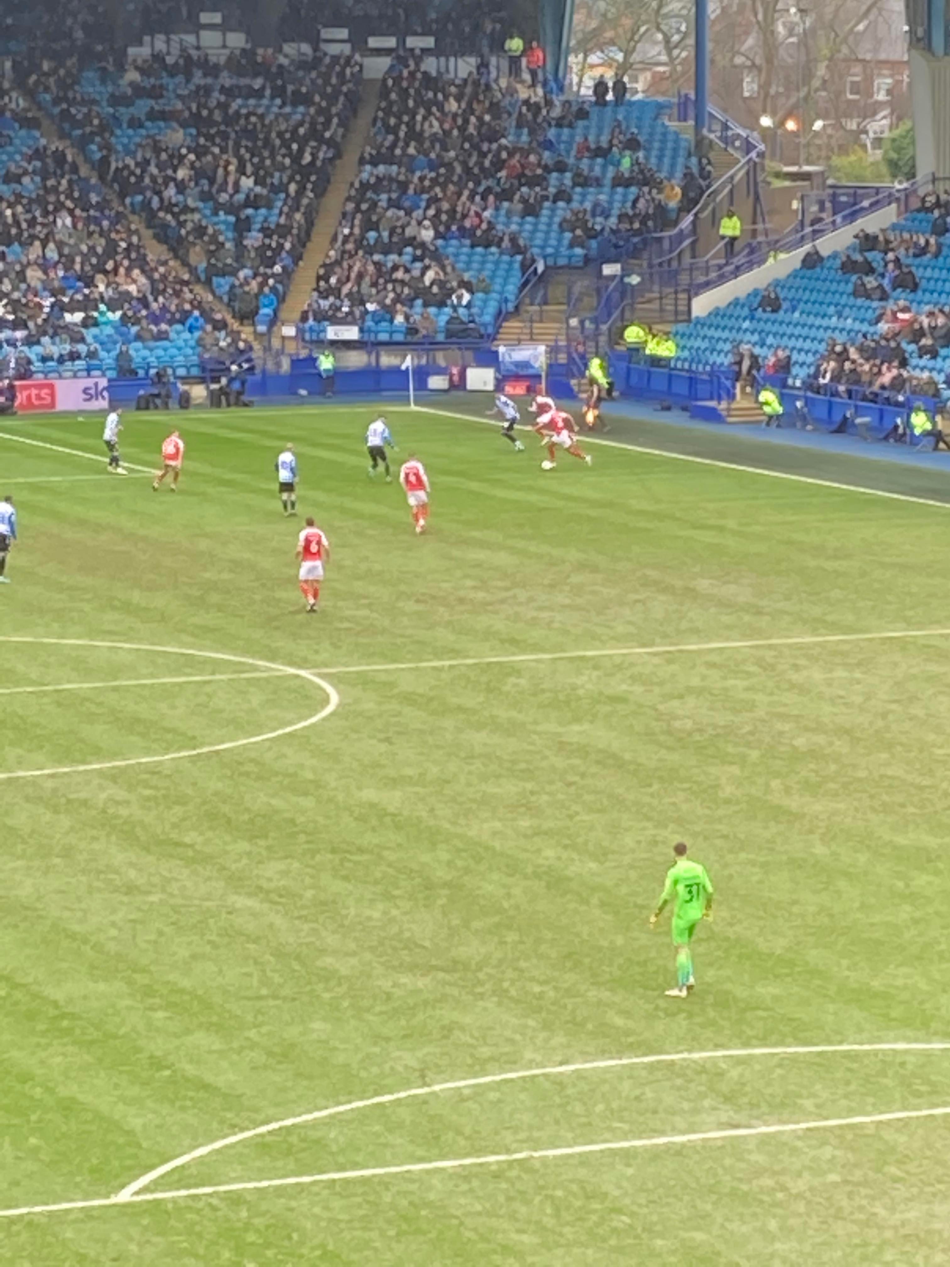 Kick Off! “Ladapooooo! Scoring all the goals Freddie! Make the Millers sing Freddie! Bouncing everywhere we go!” 4 minutes in and Rotherham play forward, it’s worked through to Chiedozie Ogbene, he shoots… Straight at the keeper! He’s Offside so it wouldn’t have counted anyway. “Da da dadada dadadada Wednesday!” The Wednesday drum is banging loud!! Can’t hear the trumpet though…