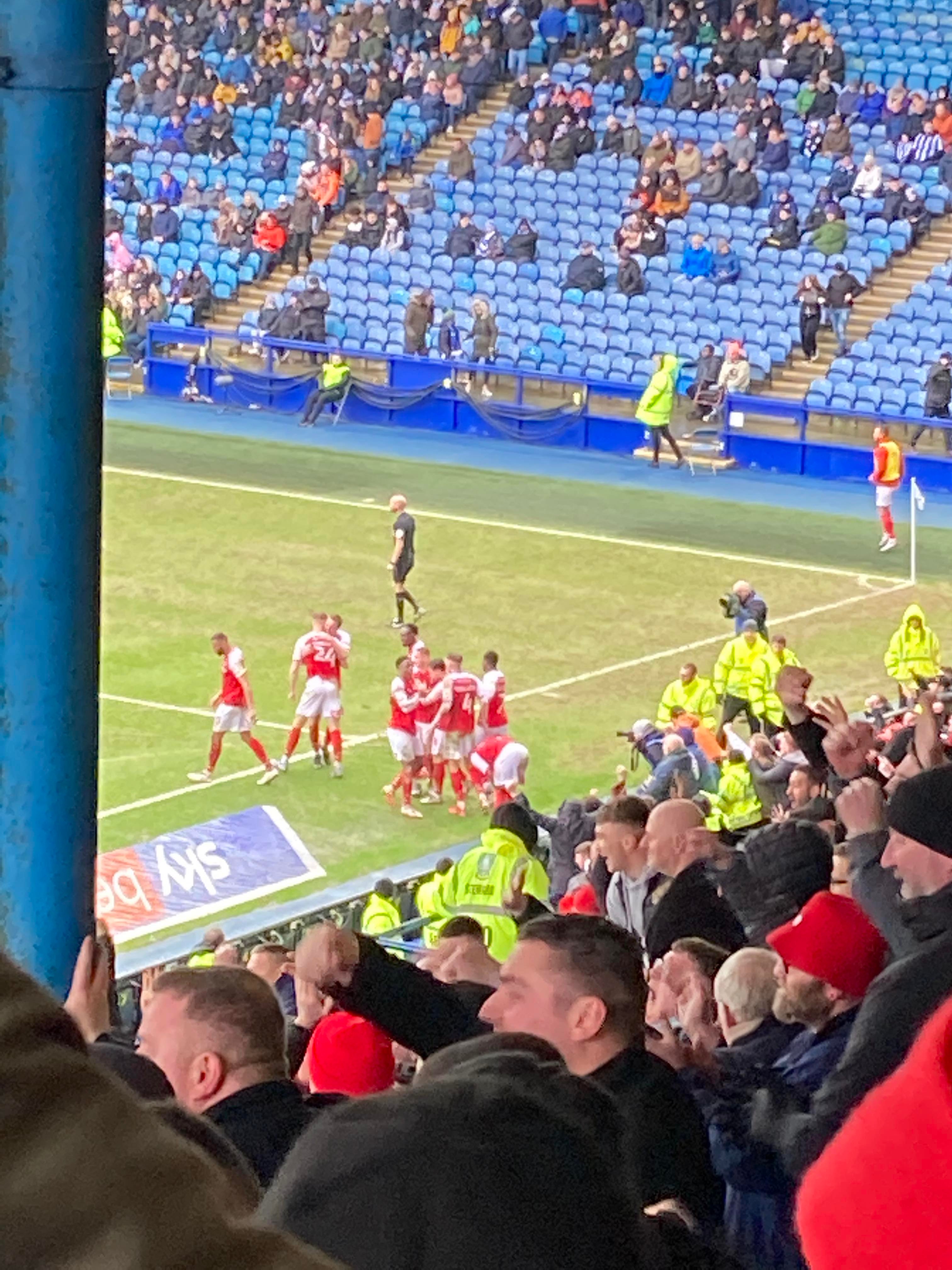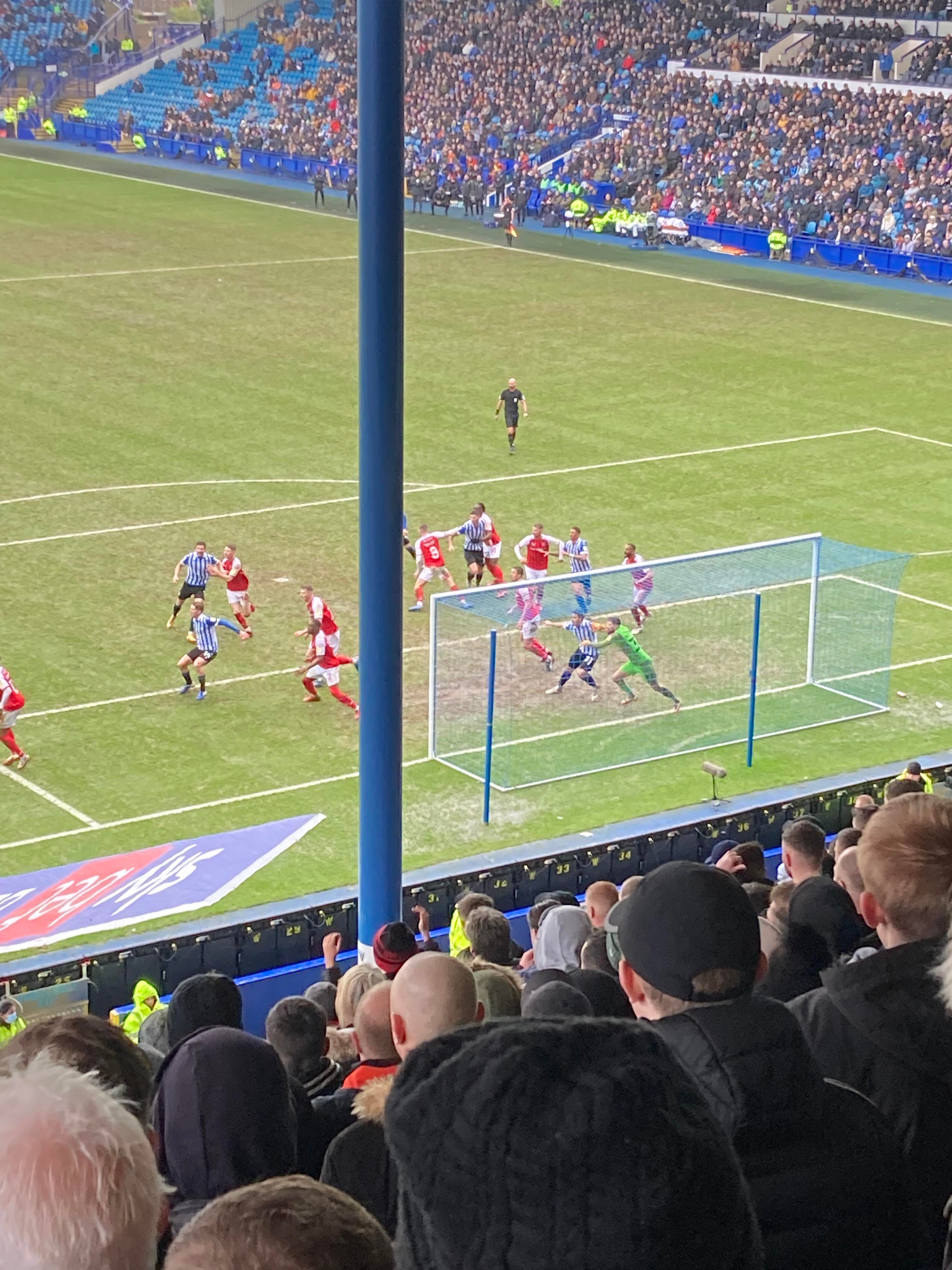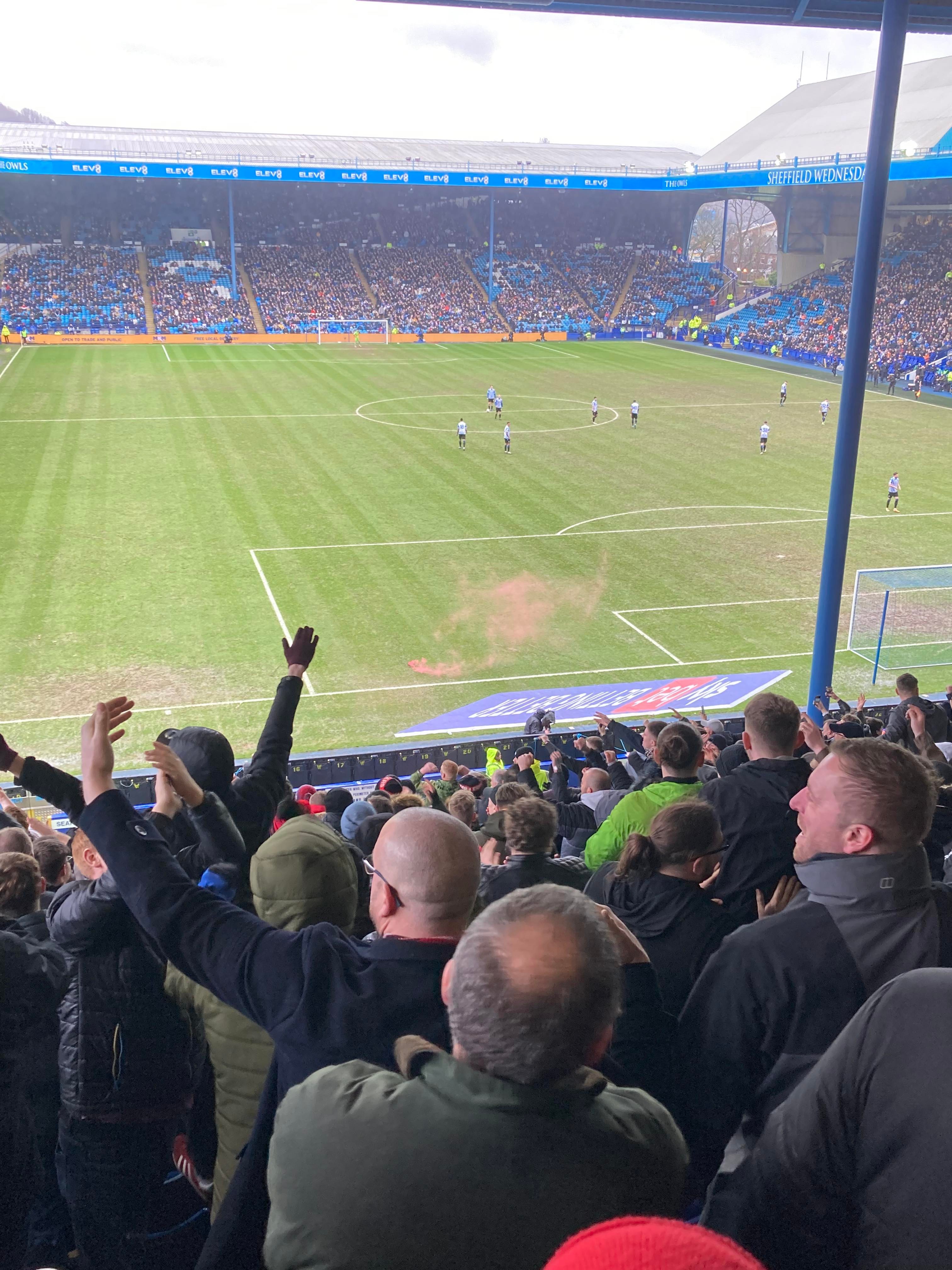 Second half, 50th minute and Rotherham lose the ball in their own half and Callum Paterson runs into the box on the left, he plays it across… Keeper claims. “Richard Wood is magic! He wears a magic hat!” 58 minutes now and Rotherham have a corner, “COME ON YOU REDS!!” In it comes… It’s set up for Ben Wiles who runs in with the header, Freddie Ladapo is there… GOOOOOOAAAAAAAAAAALLLLLLLLLL!!!!!! Right place, right time! And Rotherham lead at Hillsborough!! The Leppings Lane end goes CRAAAAZZZZZYYY!! Pyros galore here! 0-1!! “EIEIEIO! Up the Football League we go!”