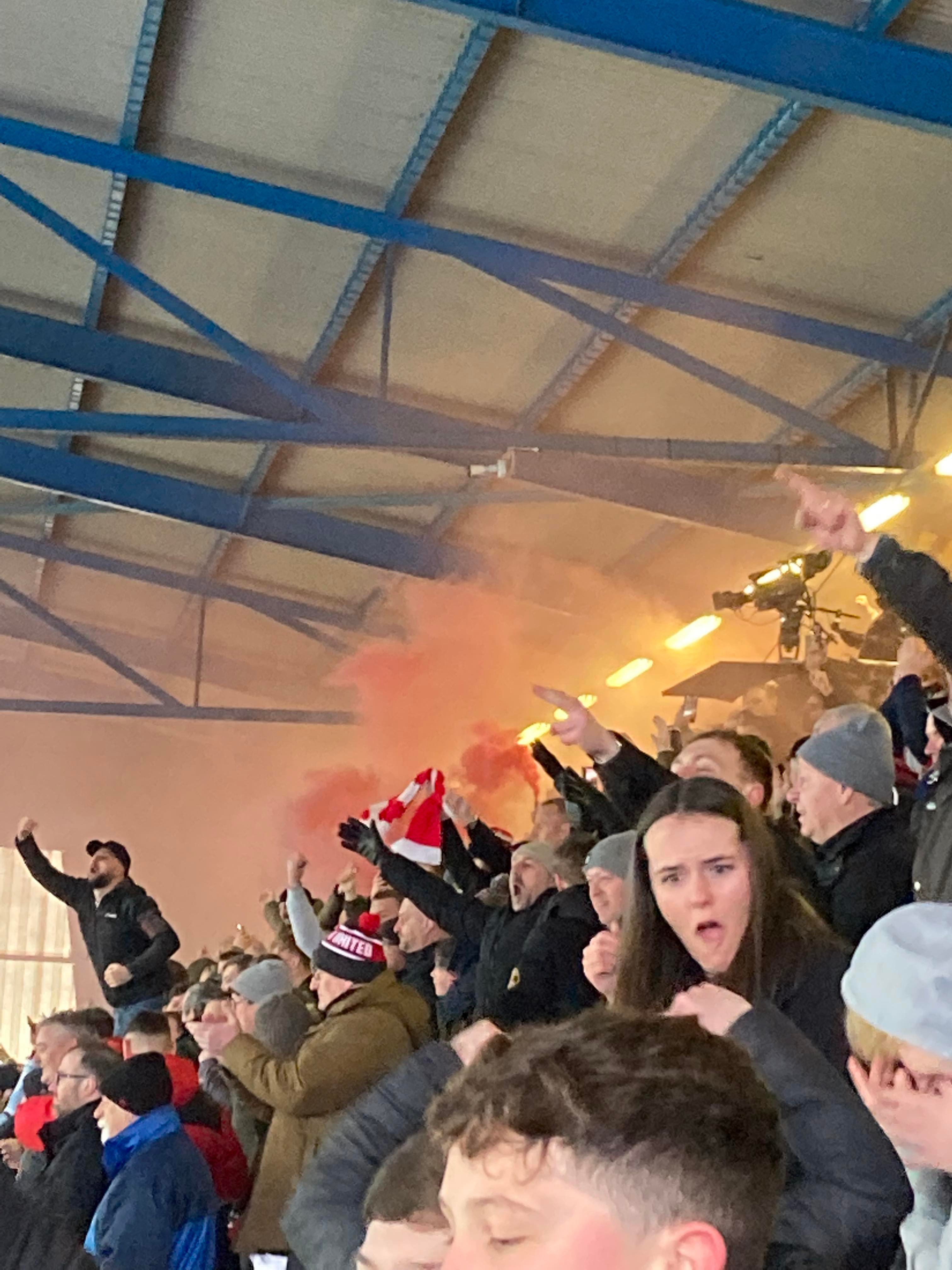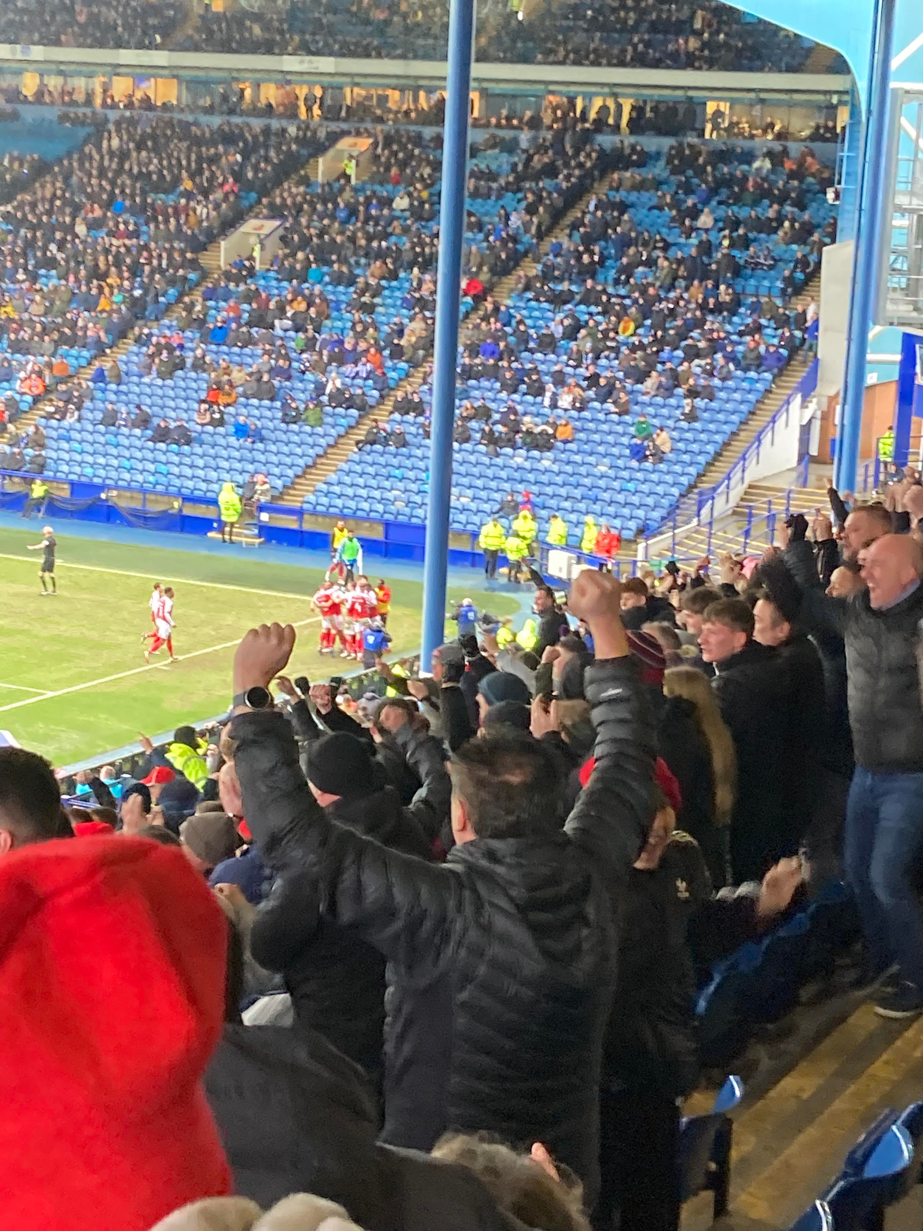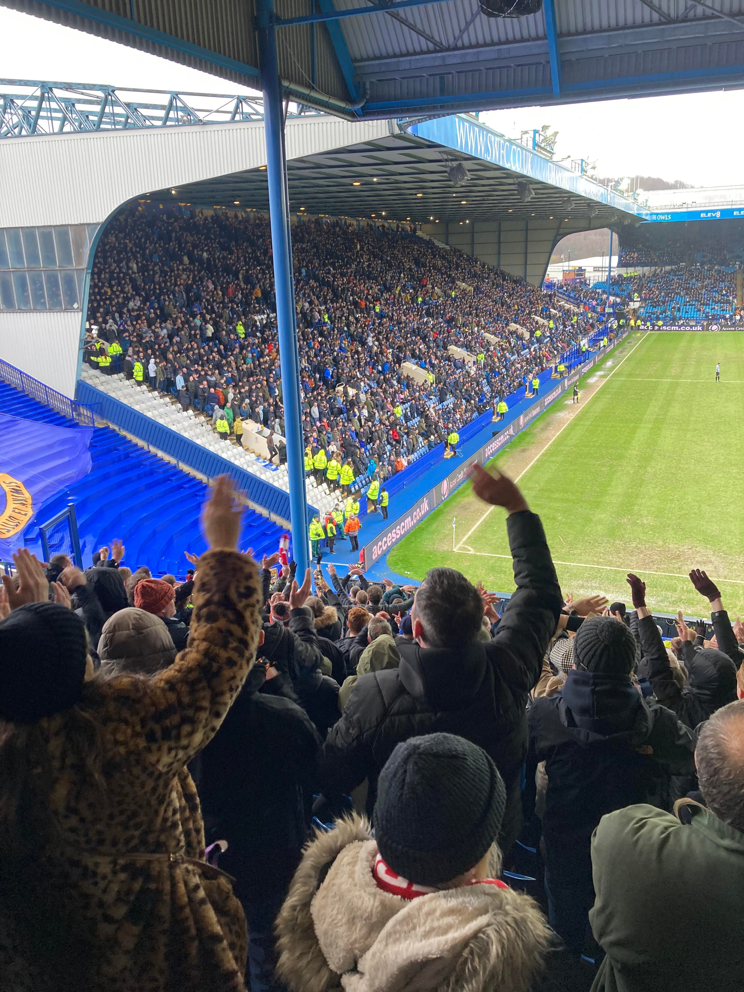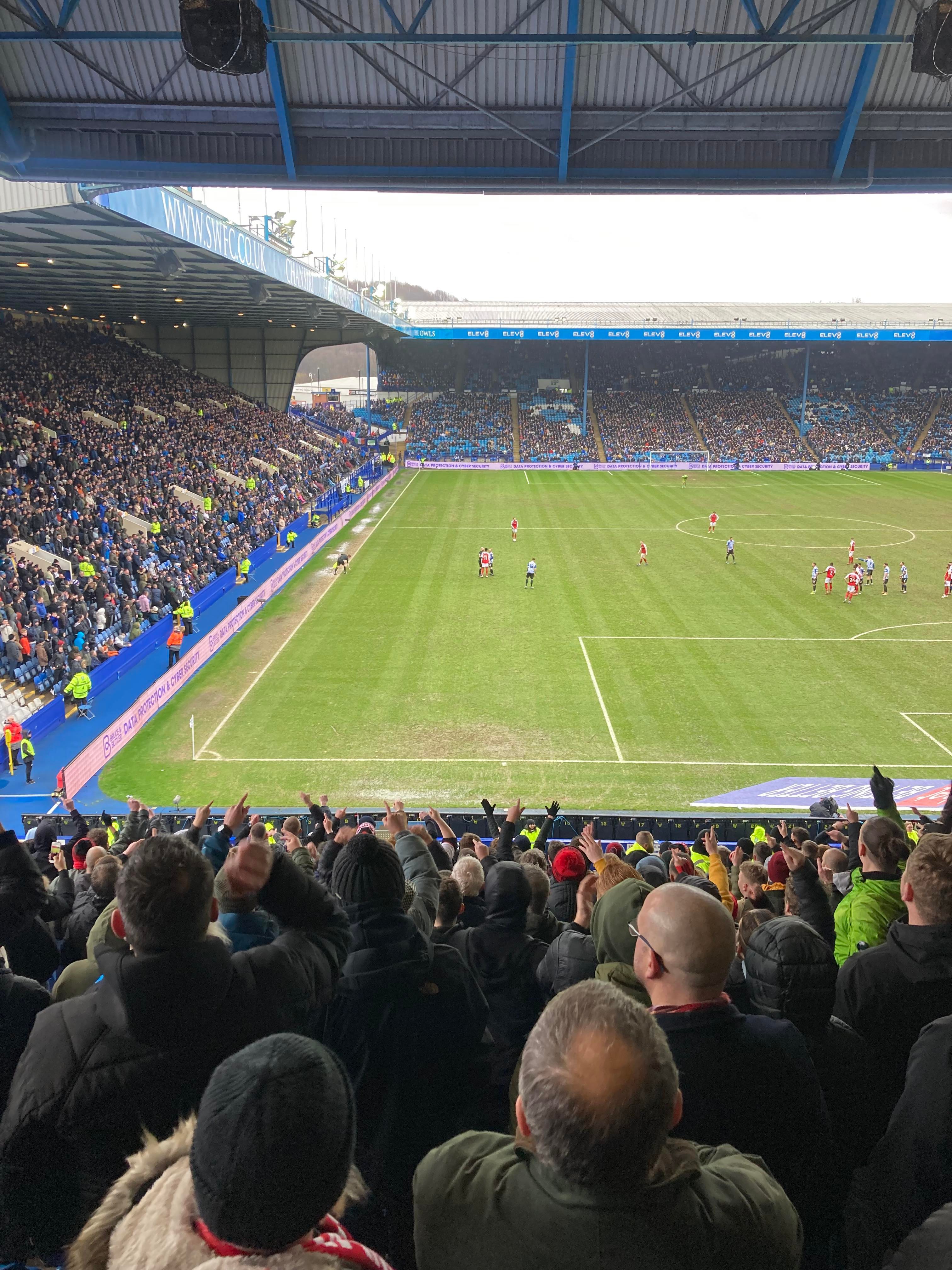 Second half, 50th minute and Rotherham lose the ball in their own half and Callum Paterson runs into the box on the left, he plays it across… Keeper claims. “Richard Wood is magic! He wears a magic hat!” 58 minutes now and Rotherham have a corner, “COME ON YOU REDS!!” In it comes… It’s set up for Ben Wiles who runs in with the header, Freddie Ladapo is there… GOOOOOOAAAAAAAAAAALLLLLLLLLL!!!!!! Right place, right time! And Rotherham lead at Hillsborough!! The Leppings Lane end goes CRAAAAZZZZZYYY!! Pyros galore here! 0-1!! “EIEIEIO! Up the Football League we go!”