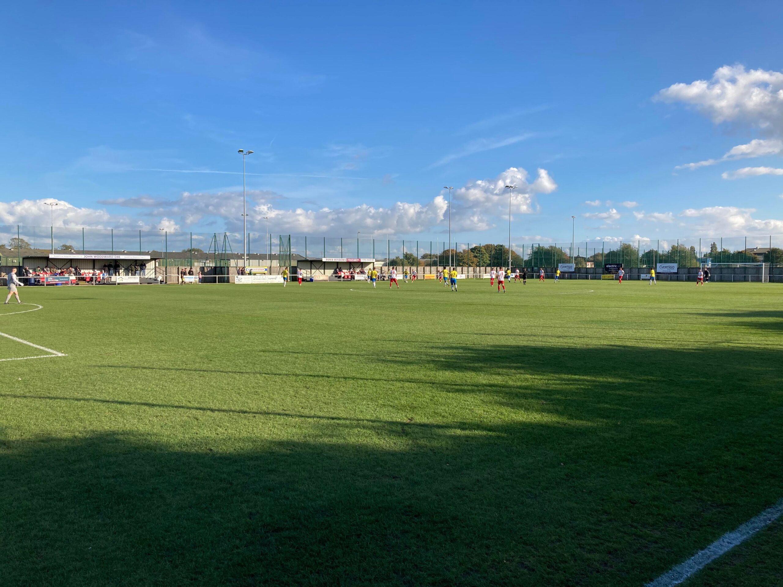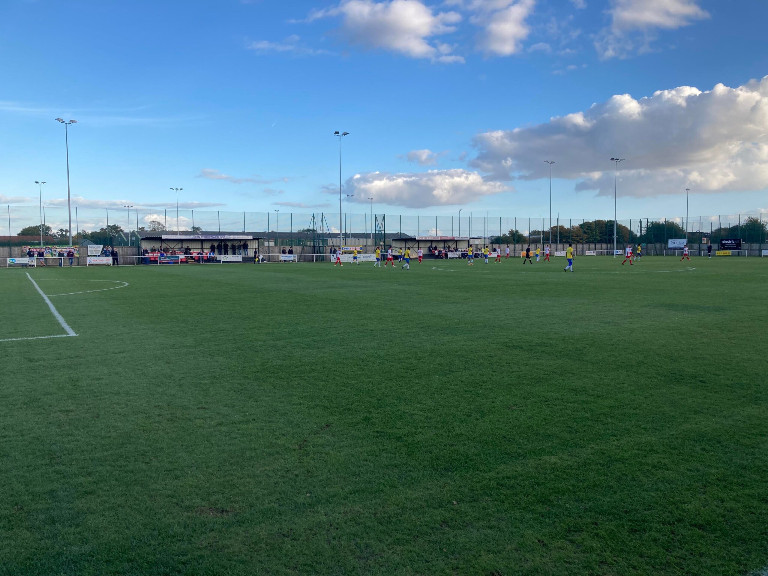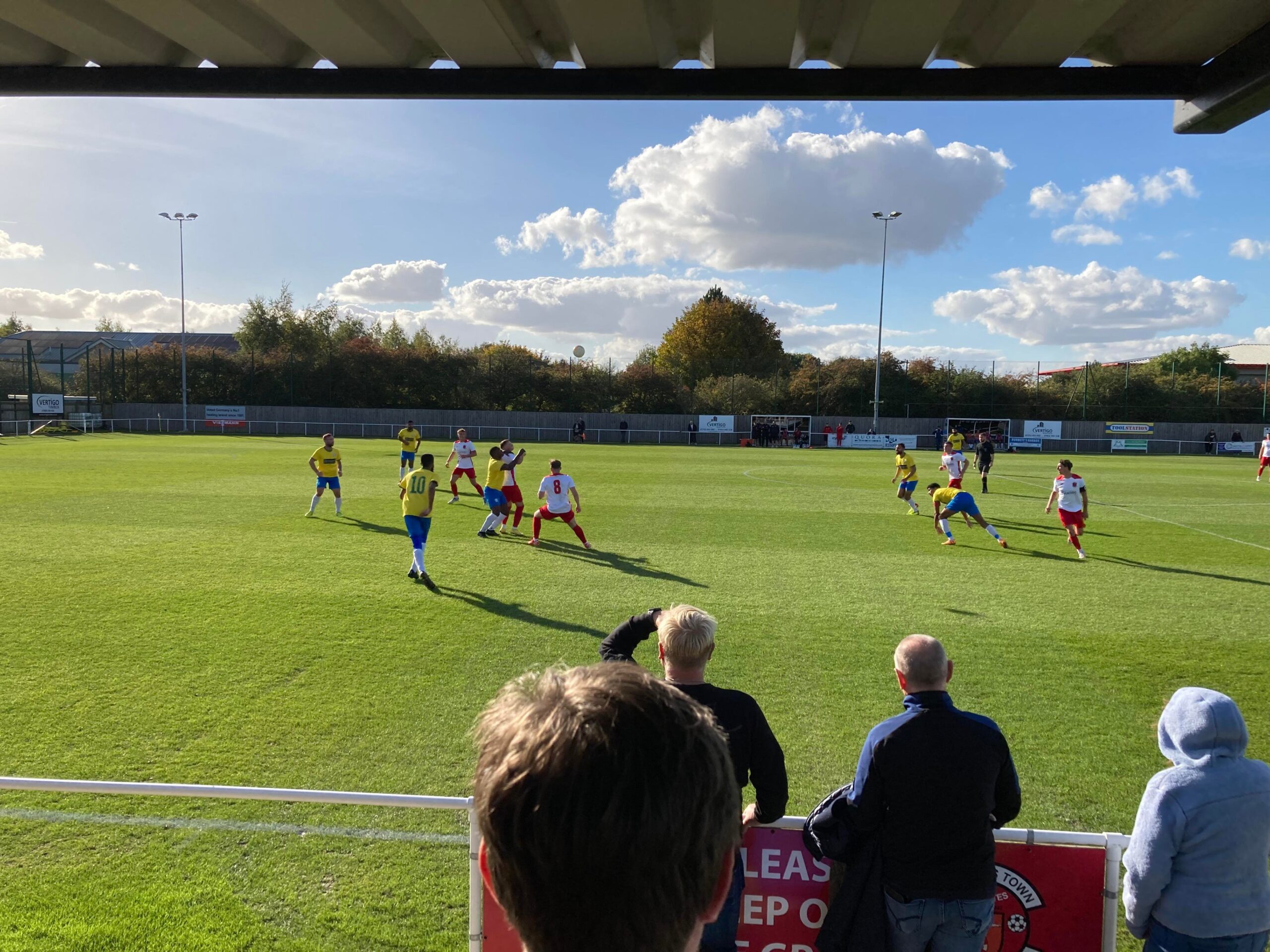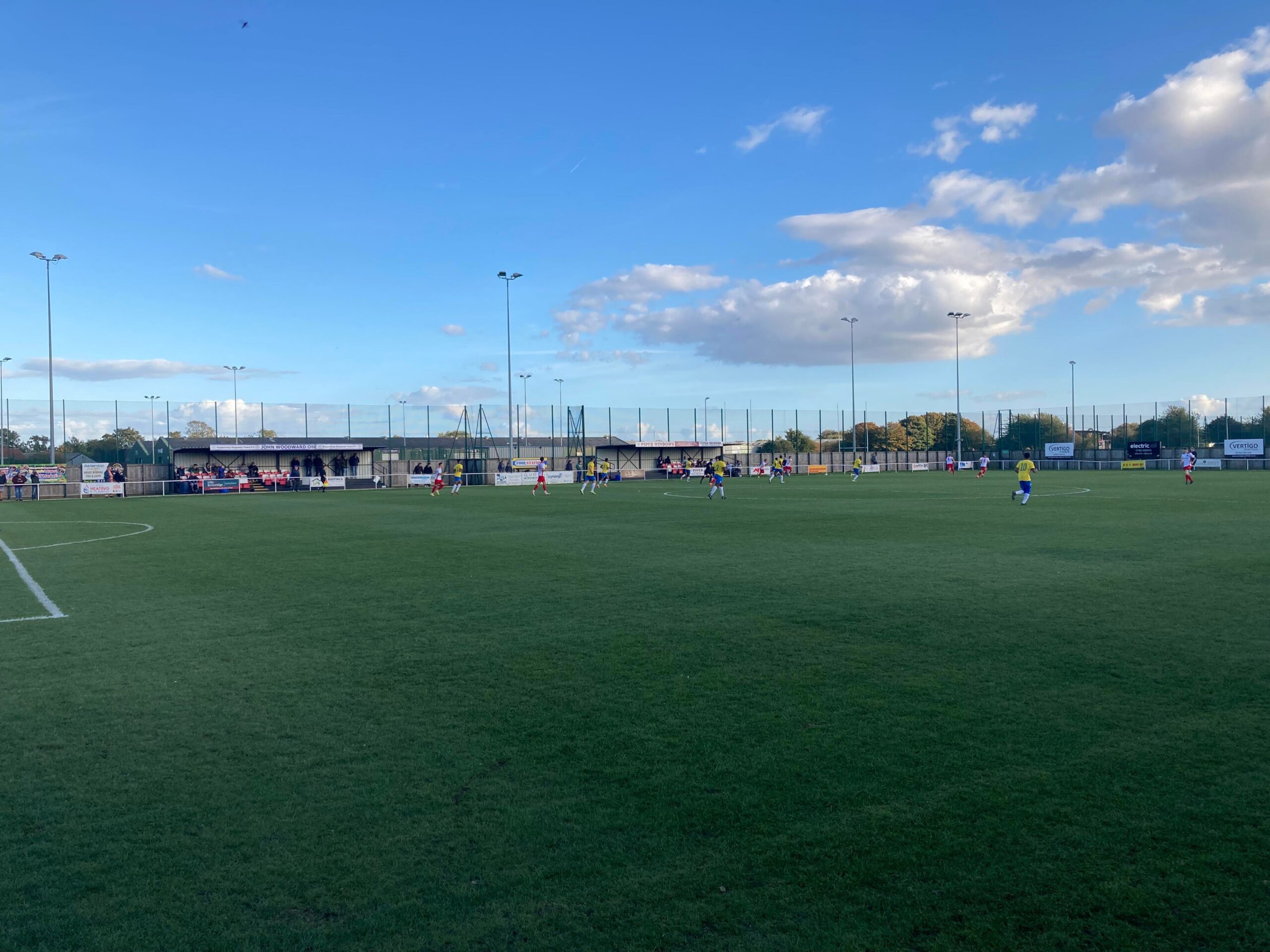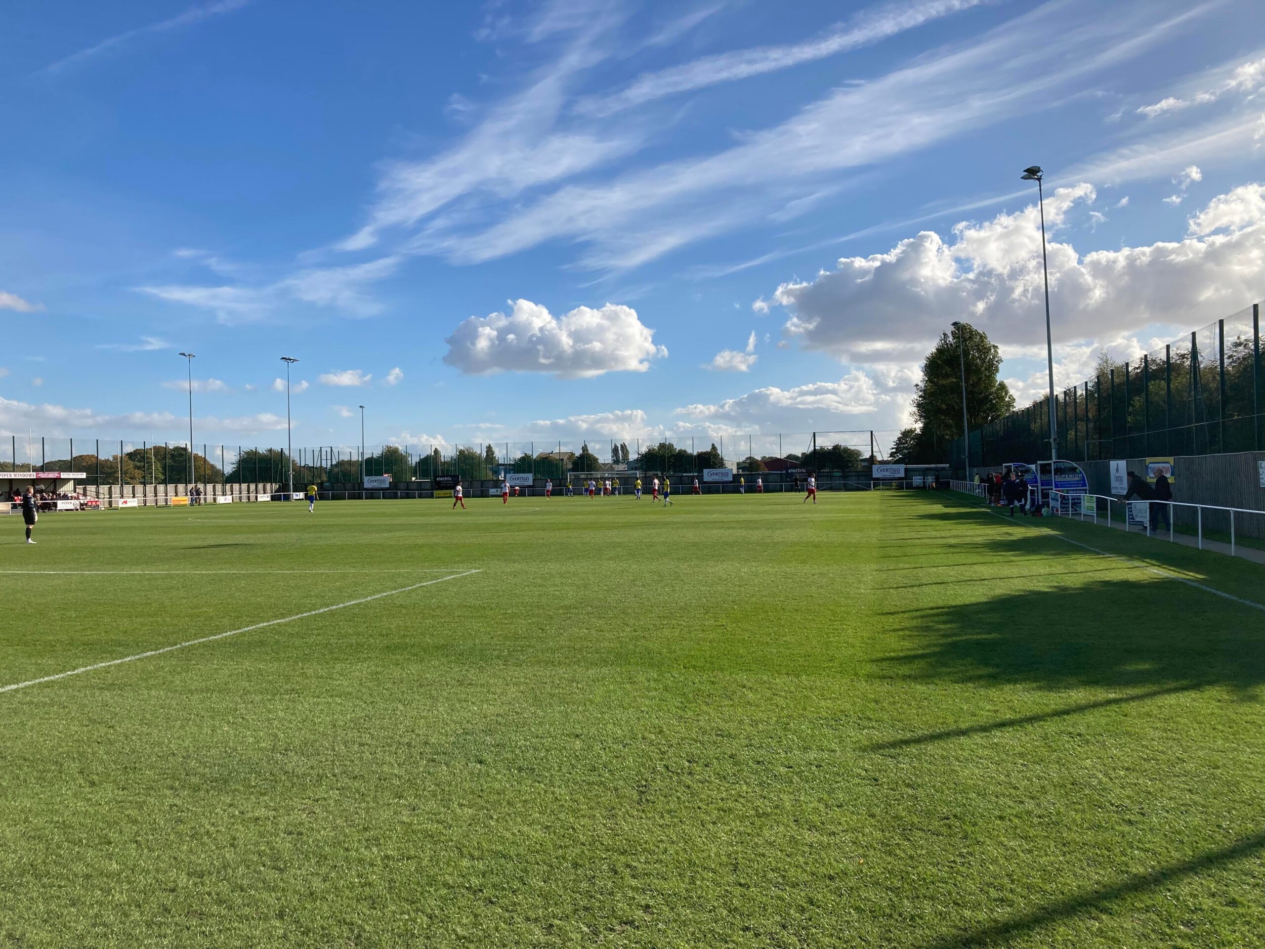 Now for the short journey across to the Vertigo Stadium and here we are with around 20 minutes to go before kick off. £6 to watch this United Counties League Cup tie against GNG Oadby Town! Splendid! Sketz could have been at Wednesday today… Non League for the win! Pin badge for £3! A quick look around and out come the players! Let’s hope the goal count doesn’t suffer from Vertigo today!!