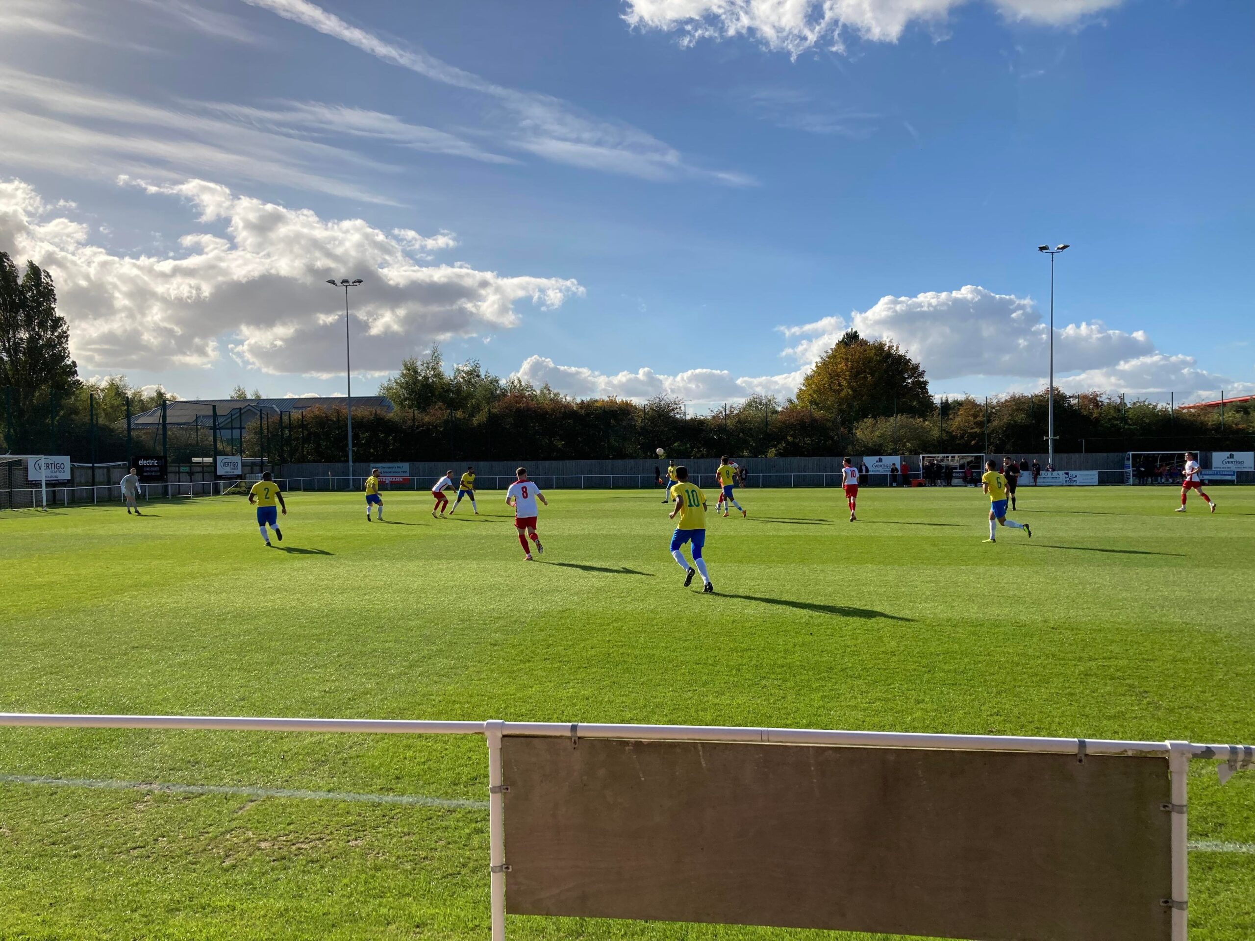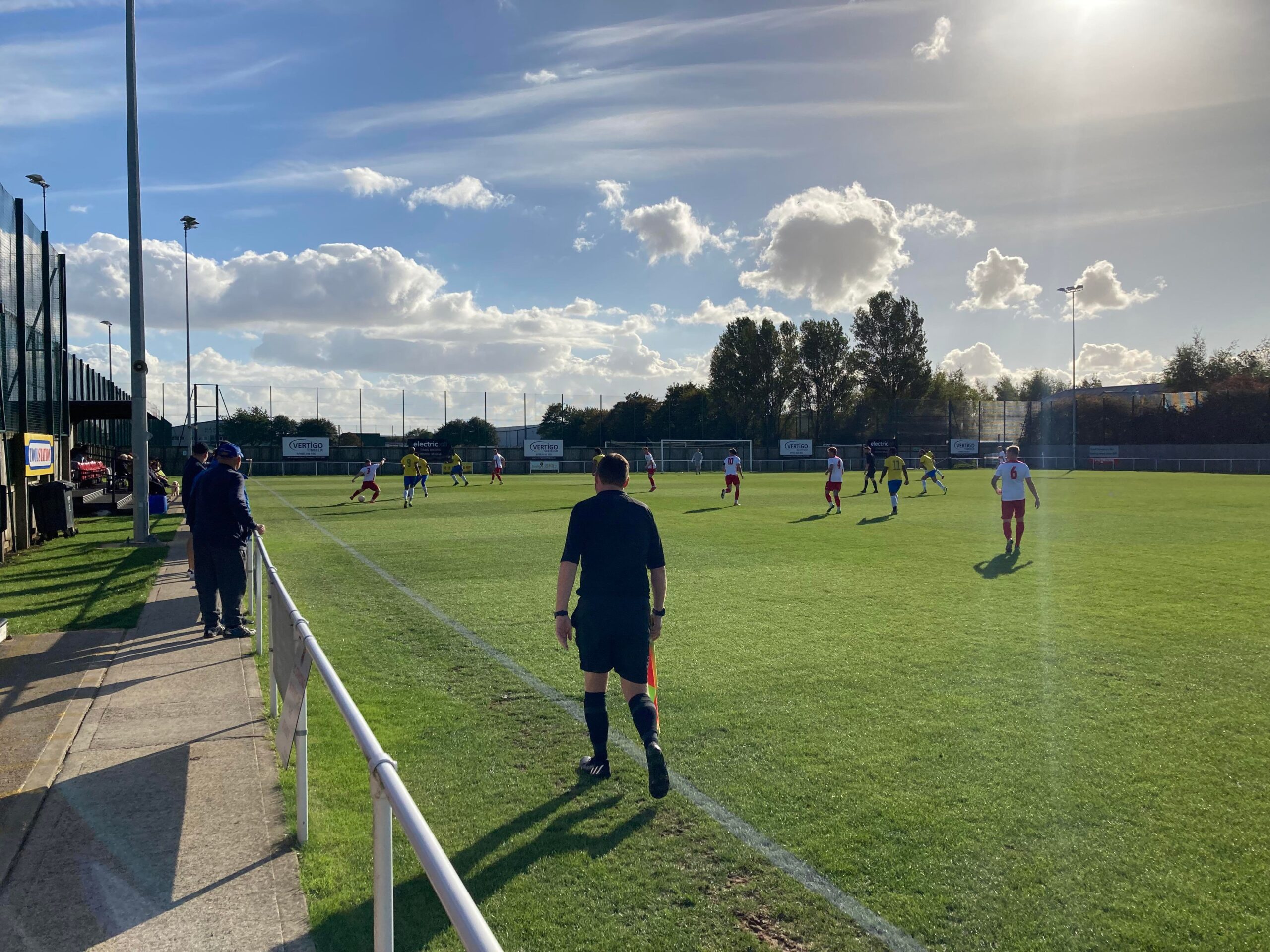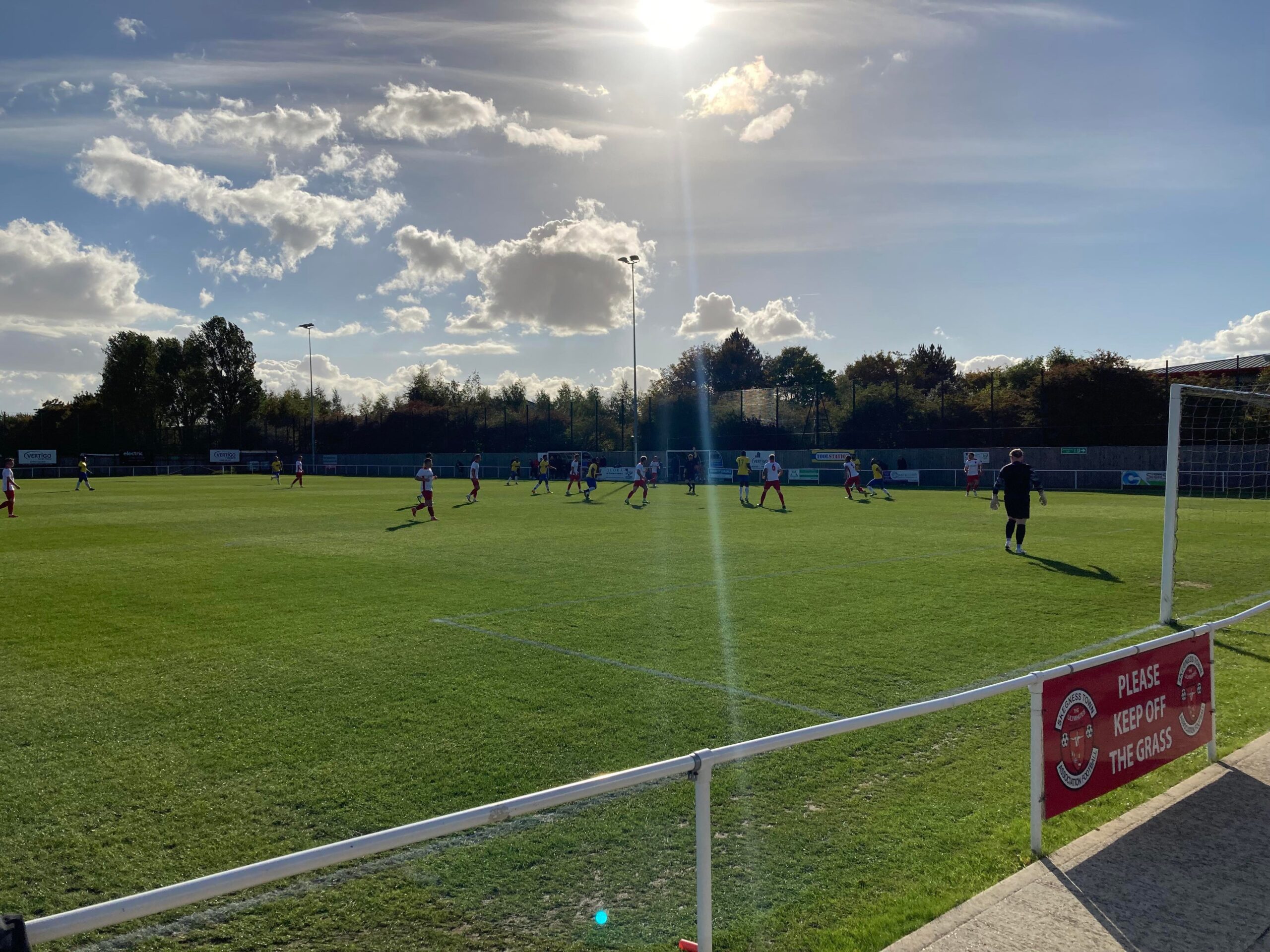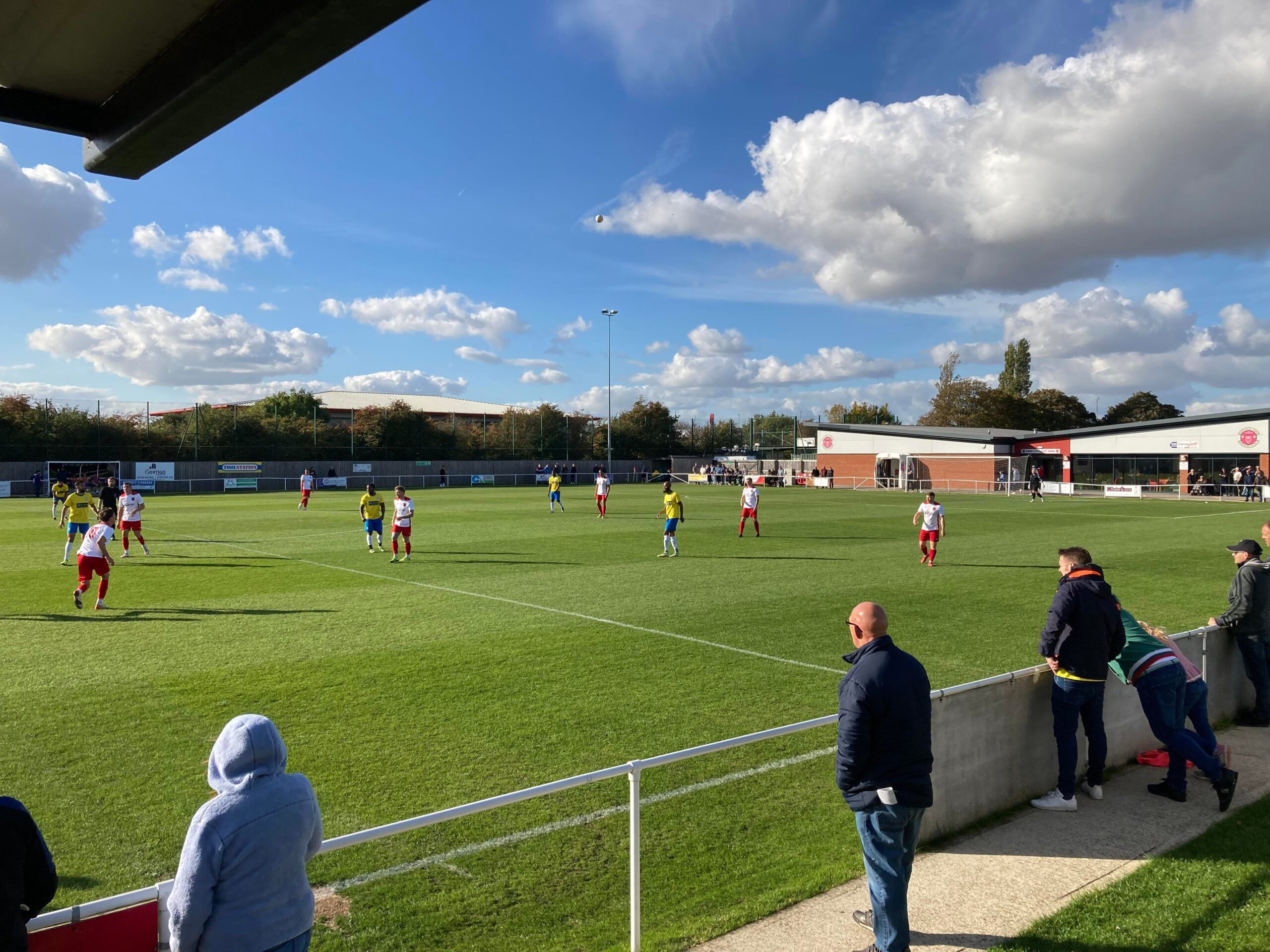 Now for the short journey across to the Vertigo Stadium and here we are with around 20 minutes to go before kick off. £6 to watch this United Counties League Cup tie against GNG Oadby Town! Splendid! Sketz could have been at Wednesday today… Non League for the win! Pin badge for £3! A quick look around and out come the players! Let’s hope the goal count doesn’t suffer from Vertigo today!!
