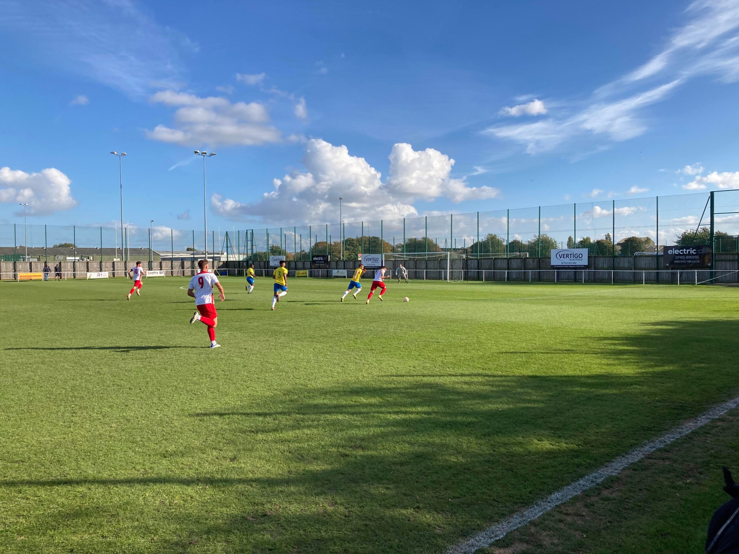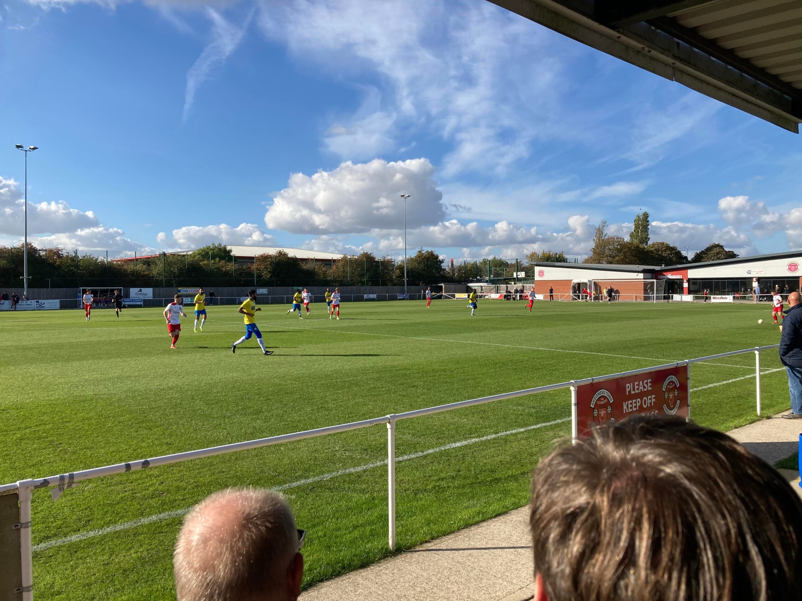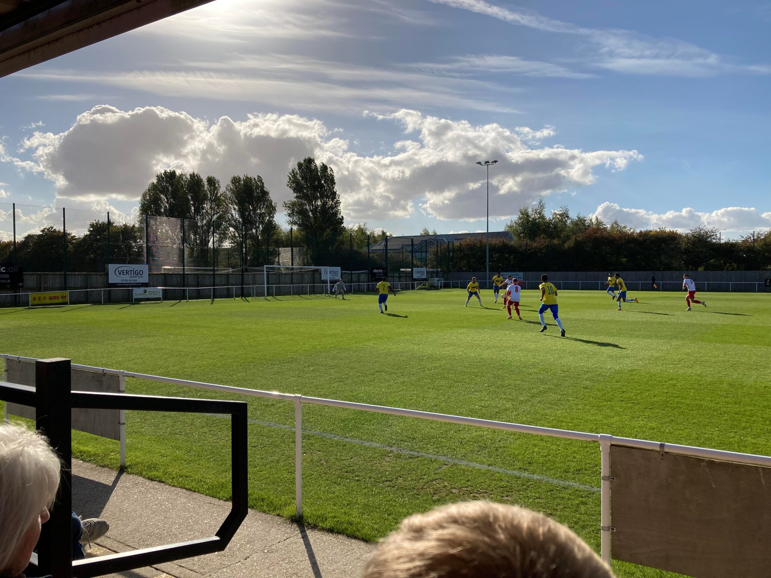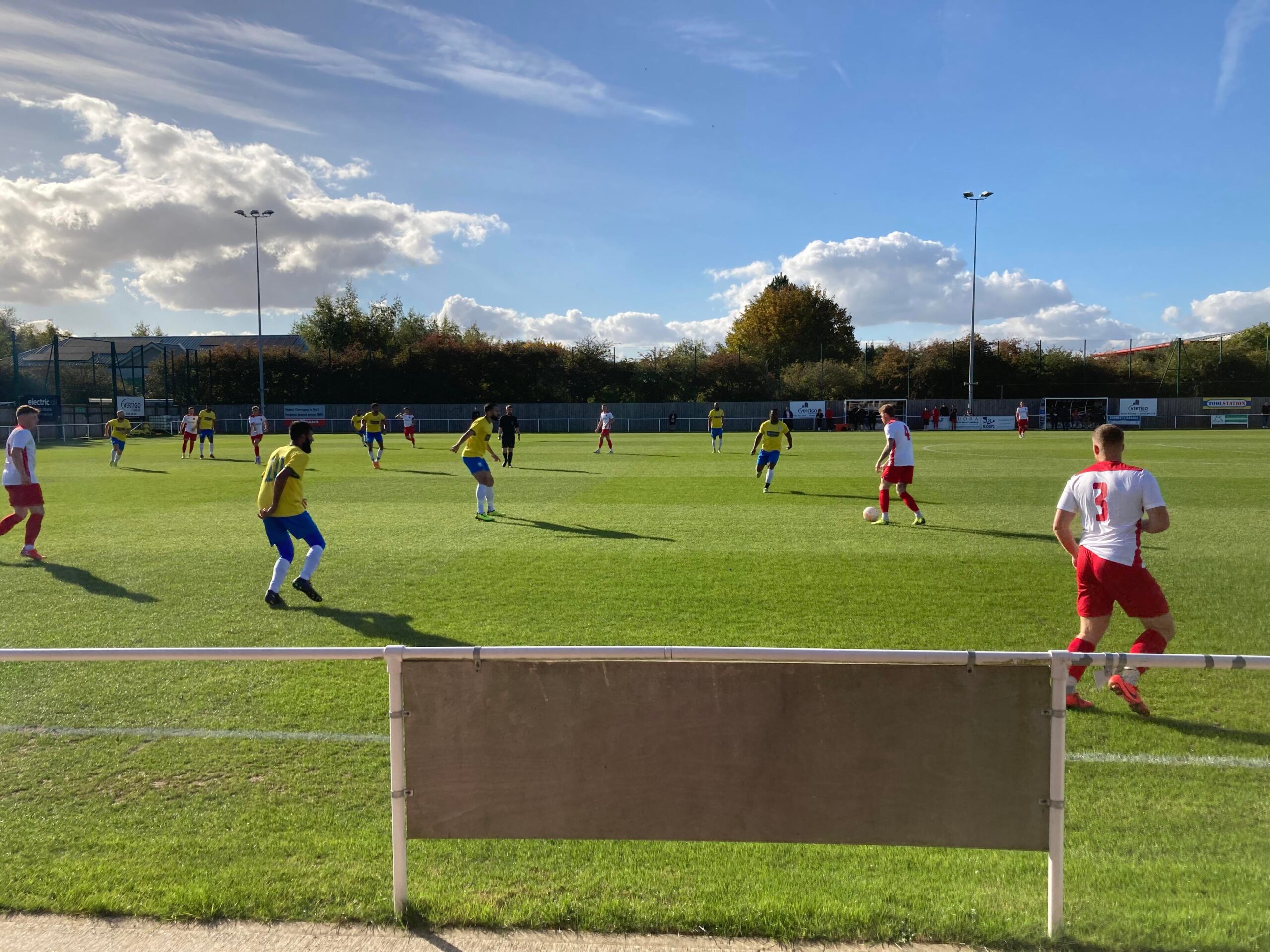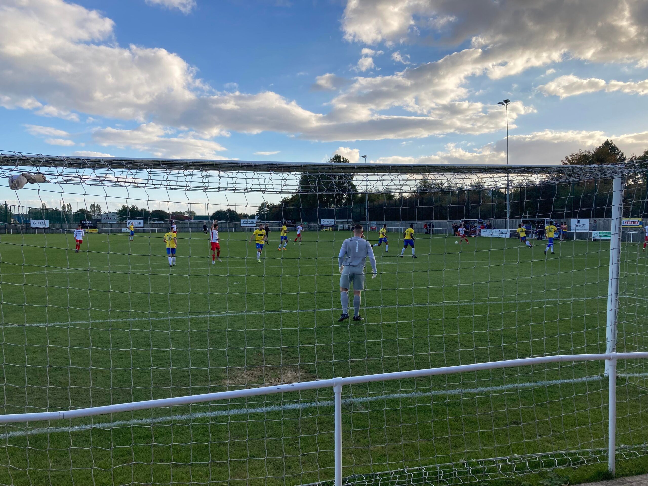 Now for the short journey across to the Vertigo Stadium and here we are with around 20 minutes to go before kick off. £6 to watch this United Counties League Cup tie against GNG Oadby Town! Splendid! Sketz could have been at Wednesday today… Non League for the win! Pin badge for £3! A quick look around and out come the players! Let’s hope the goal count doesn’t suffer from Vertigo today!!
