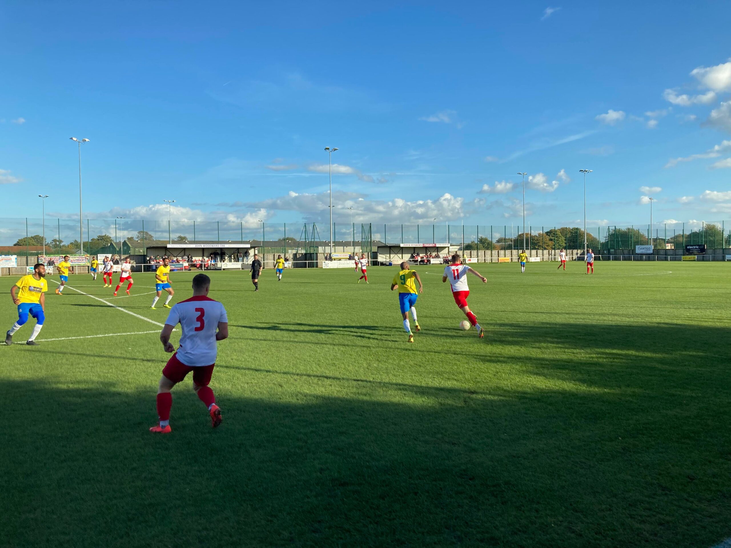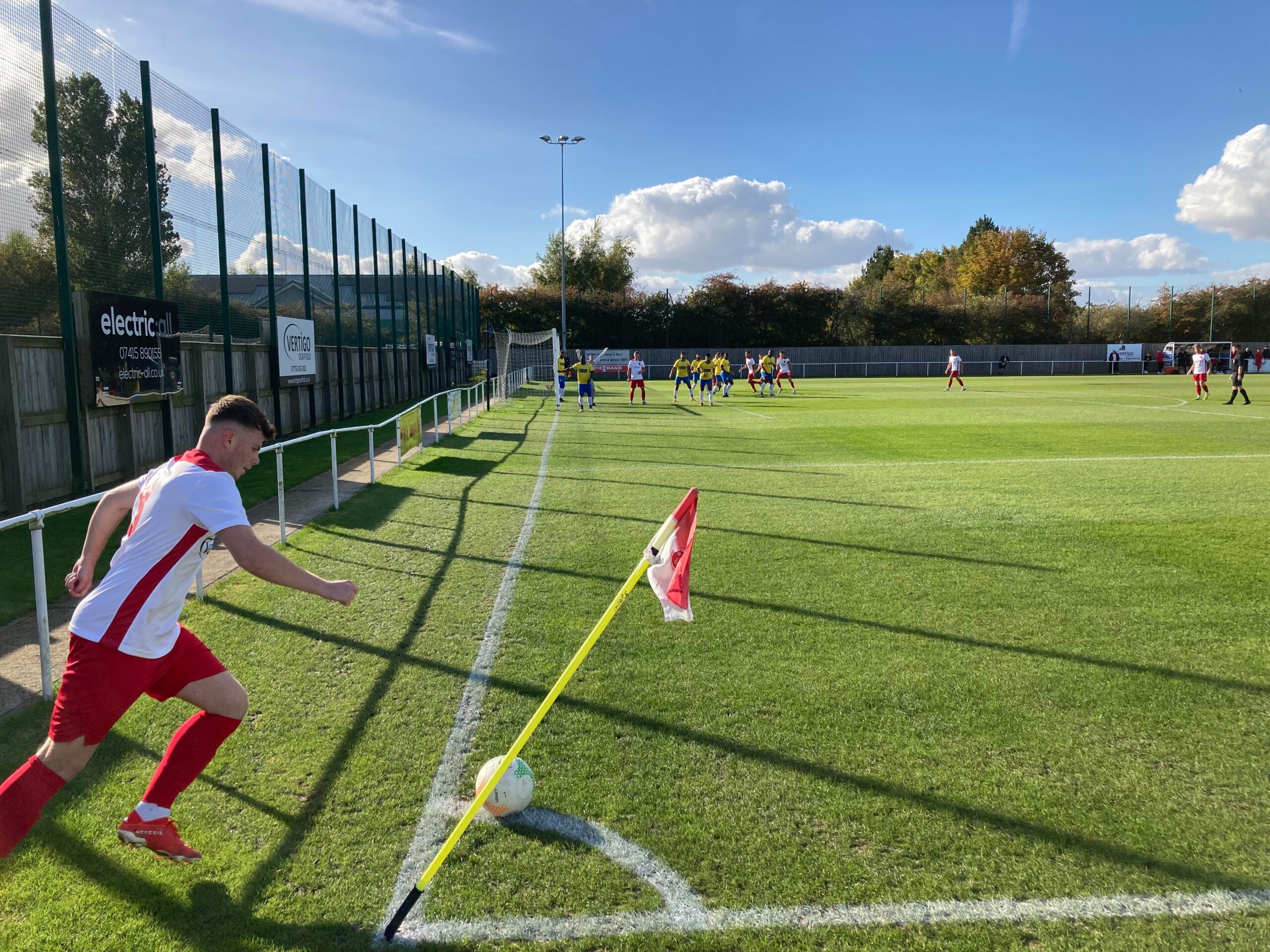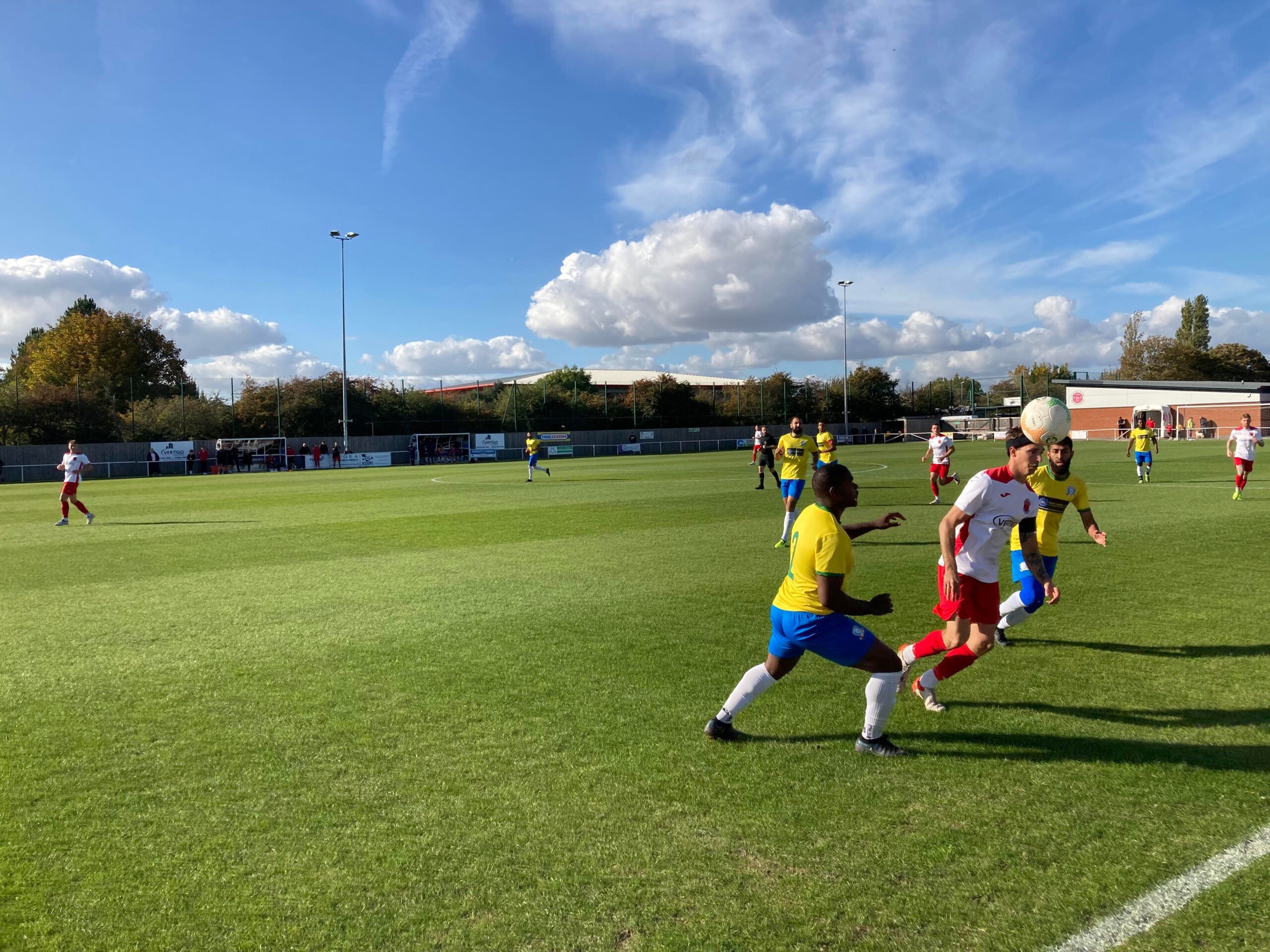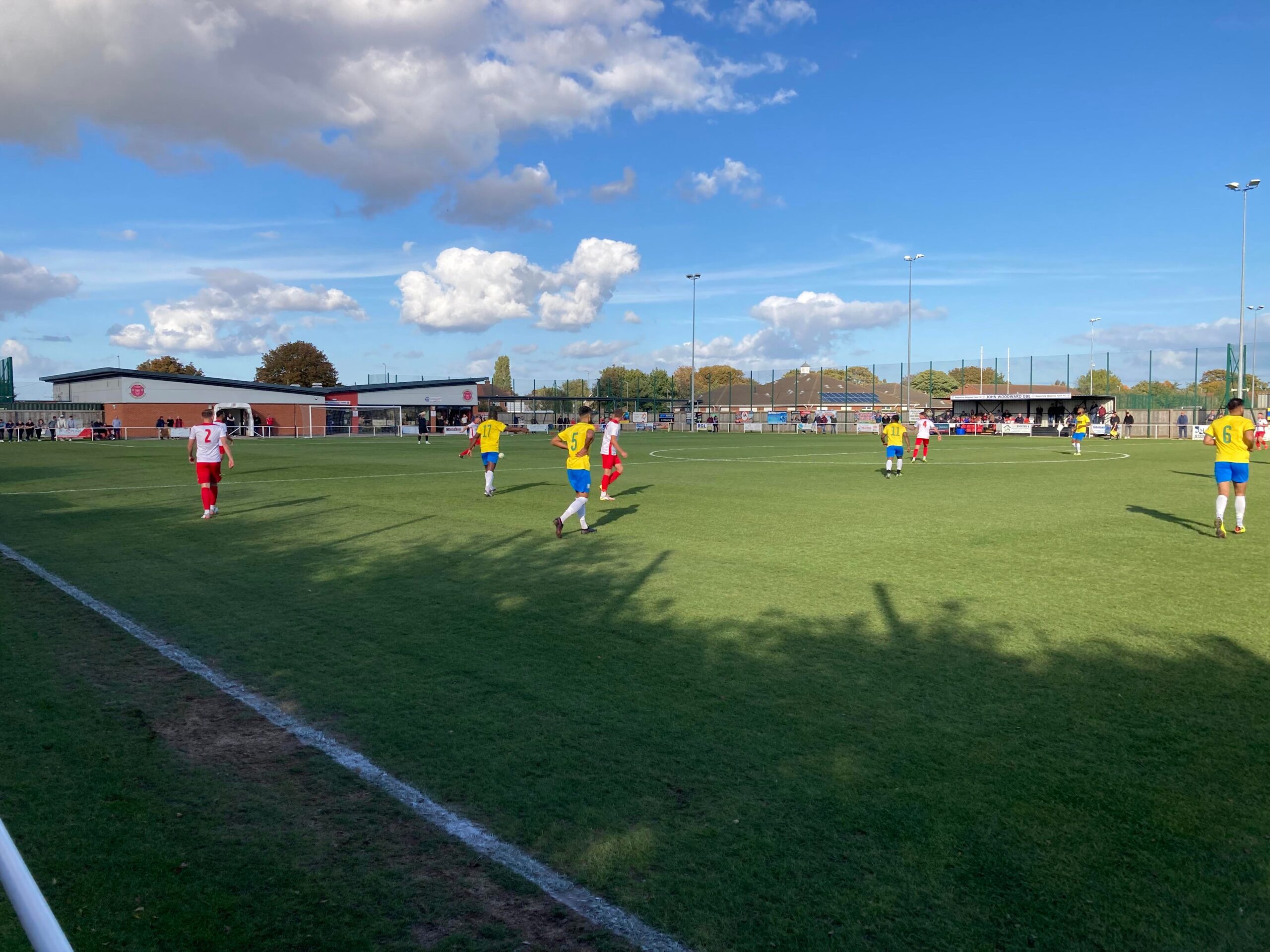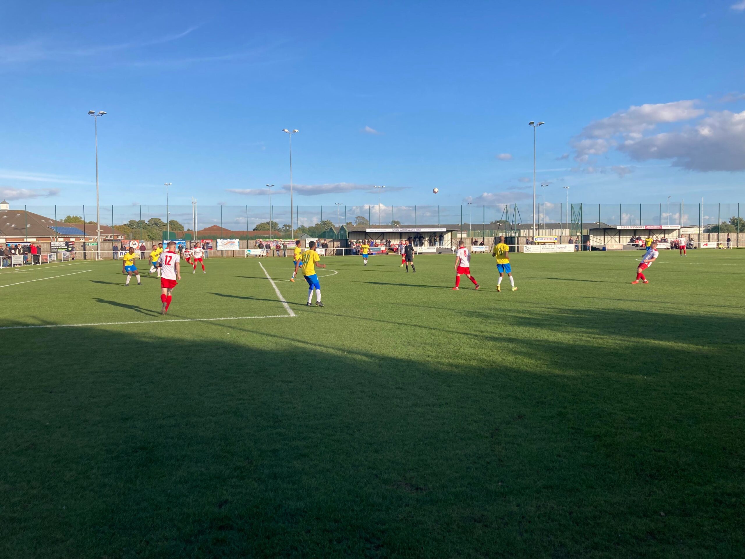 Now for the short journey across to the Vertigo Stadium and here we are with around 20 minutes to go before kick off. £6 to watch this United Counties League Cup tie against GNG Oadby Town! Splendid! Sketz could have been at Wednesday today… Non League for the win! Pin badge for £3! A quick look around and out come the players! Let’s hope the goal count doesn’t suffer from Vertigo today!!