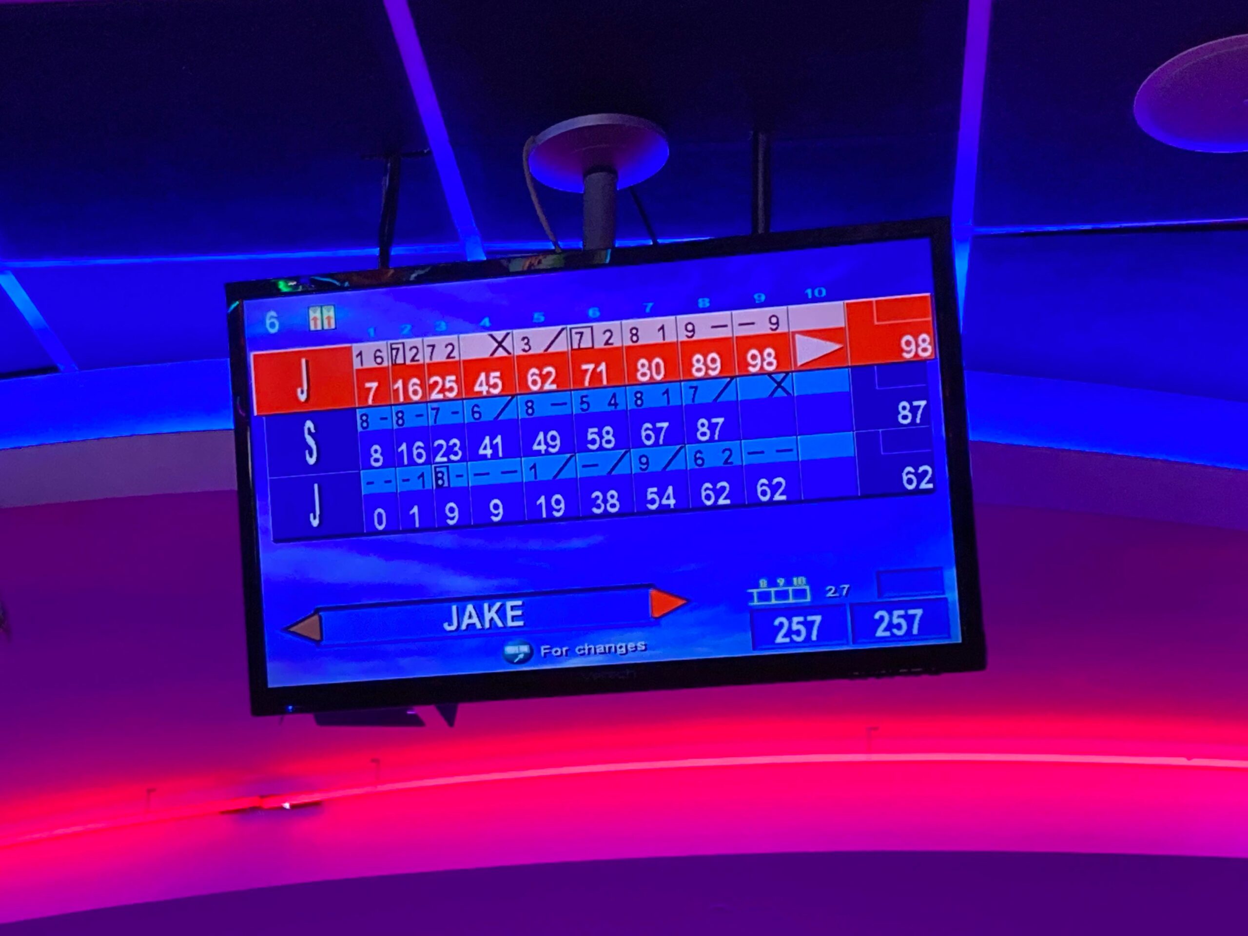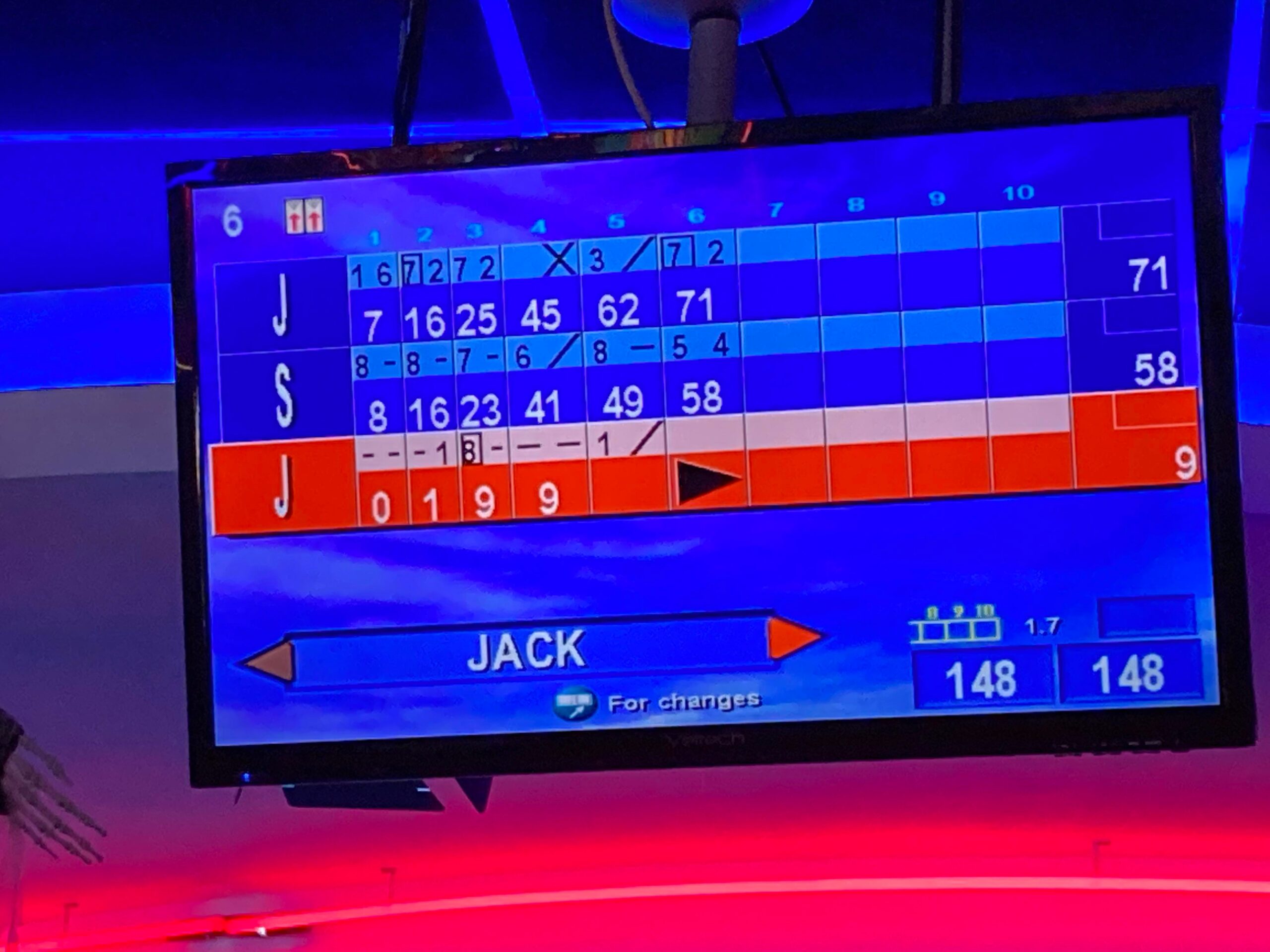 2 frames later the scores are at 71 for me, 58 for Sam and Sketz on… 19! Well I did say we could have the barriers up if we wanted!? The game goes on and I just can’t quite get the spare after so many nines. The 9th frame… It’s a strike for Sam… Oh no! With me on 98 and him on 87 with a strike to follow up from… This is going to be close as we head into the final frame.