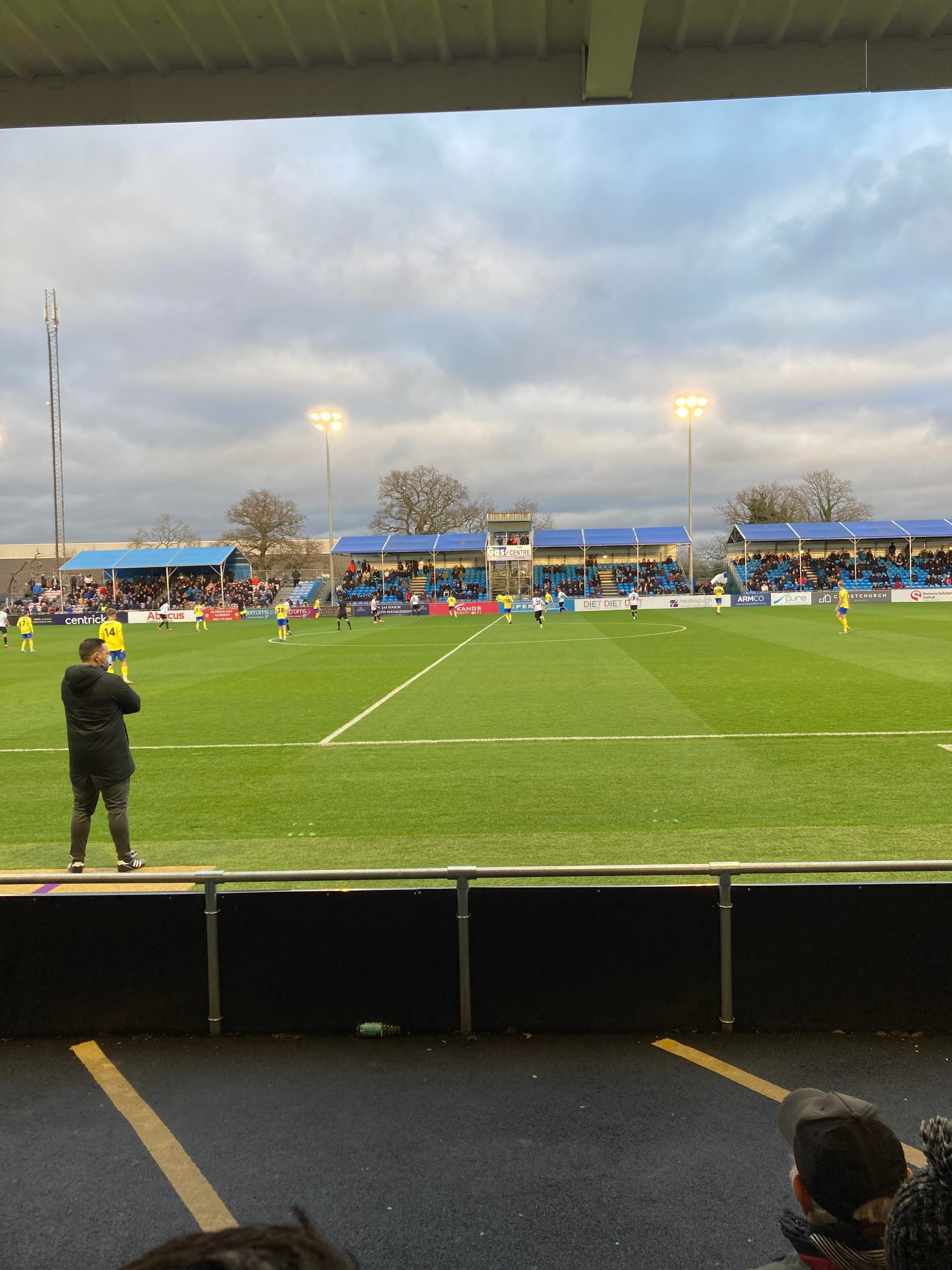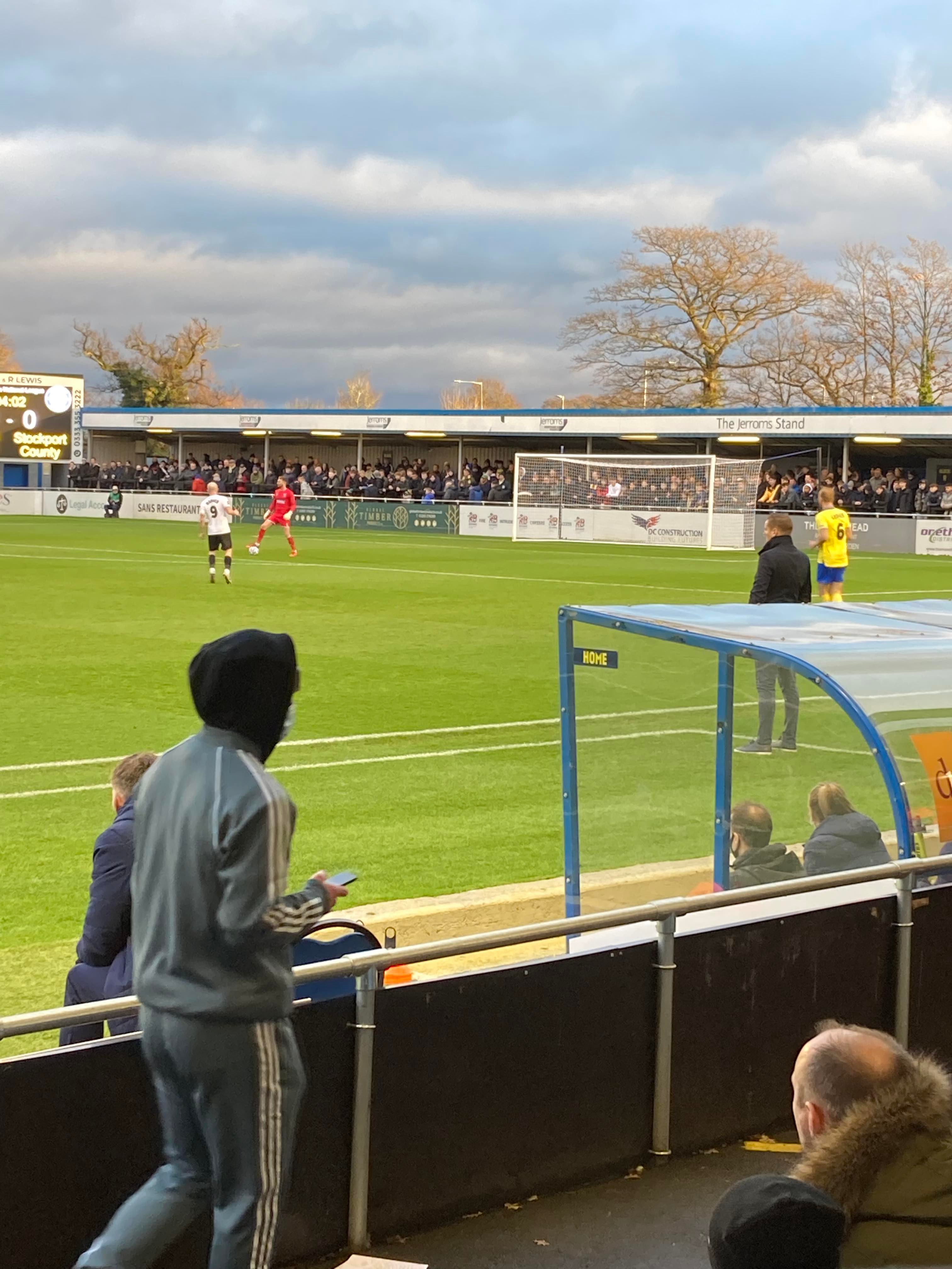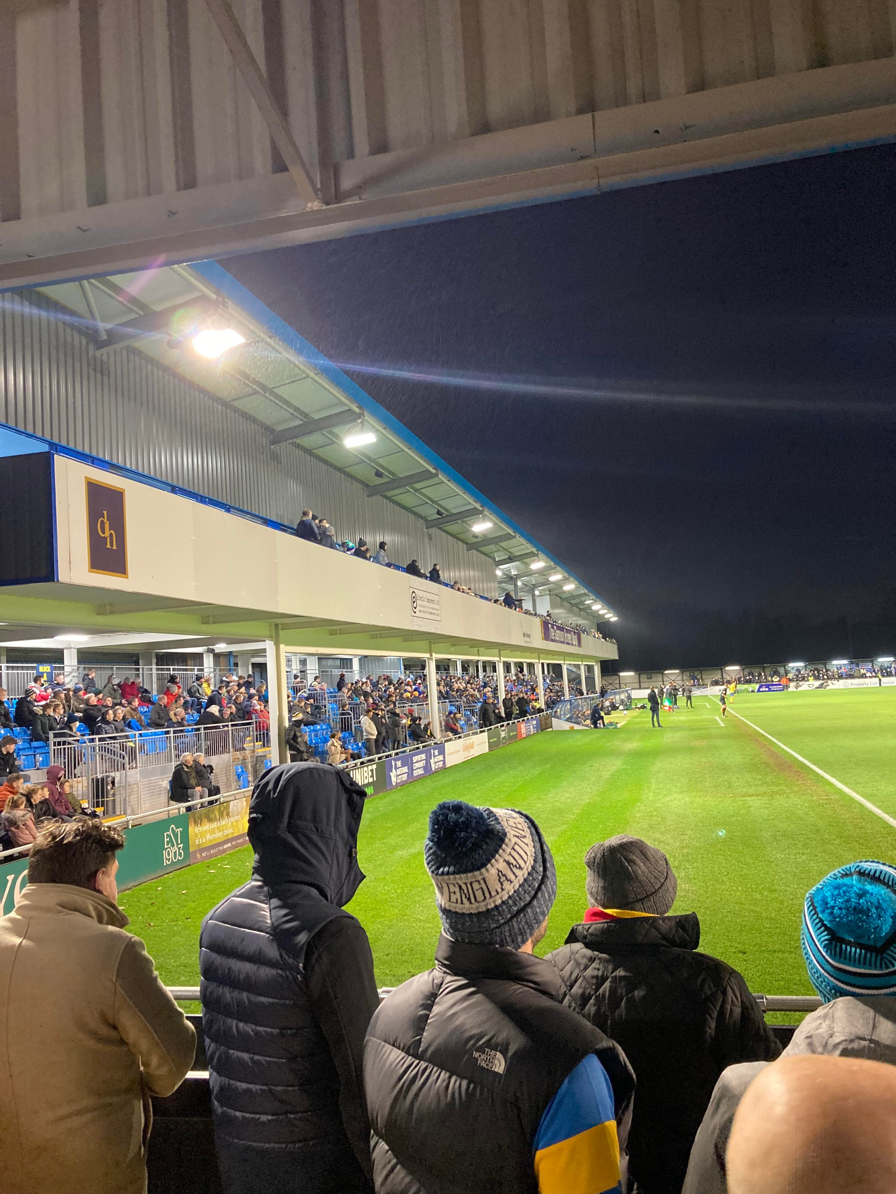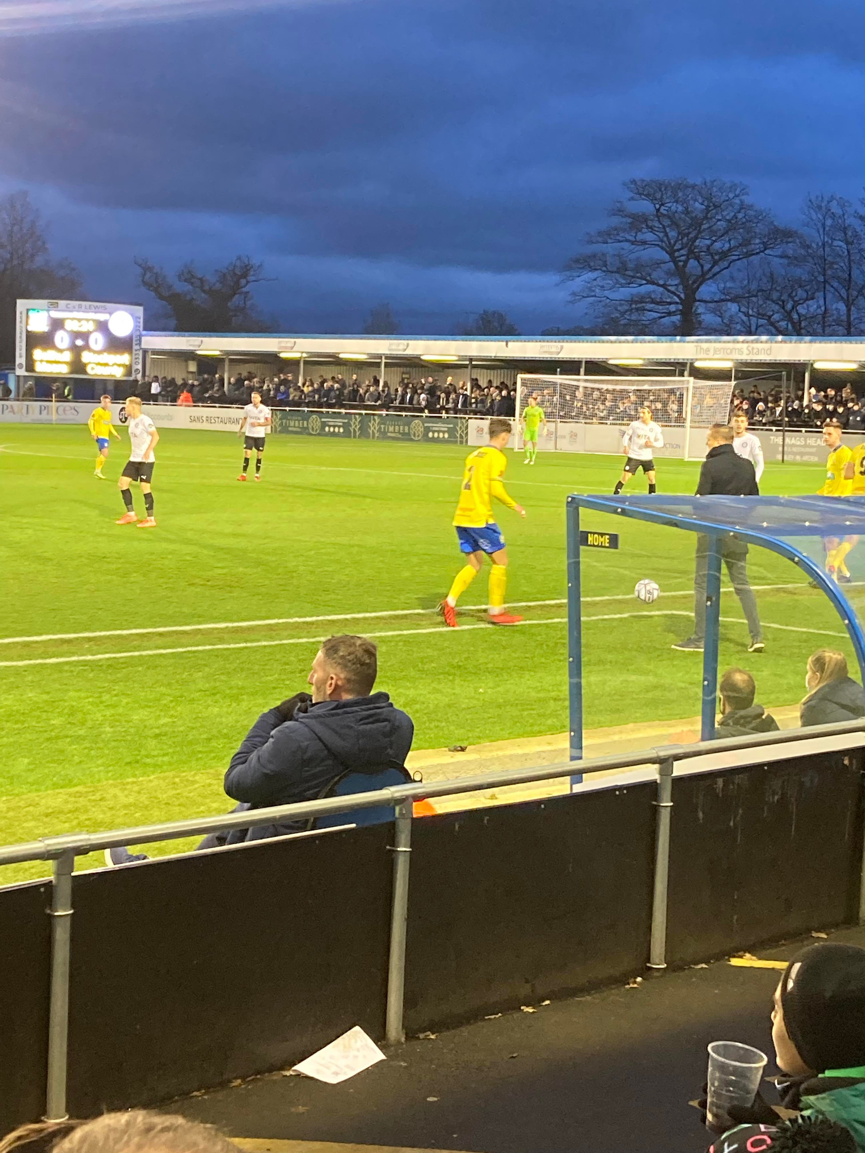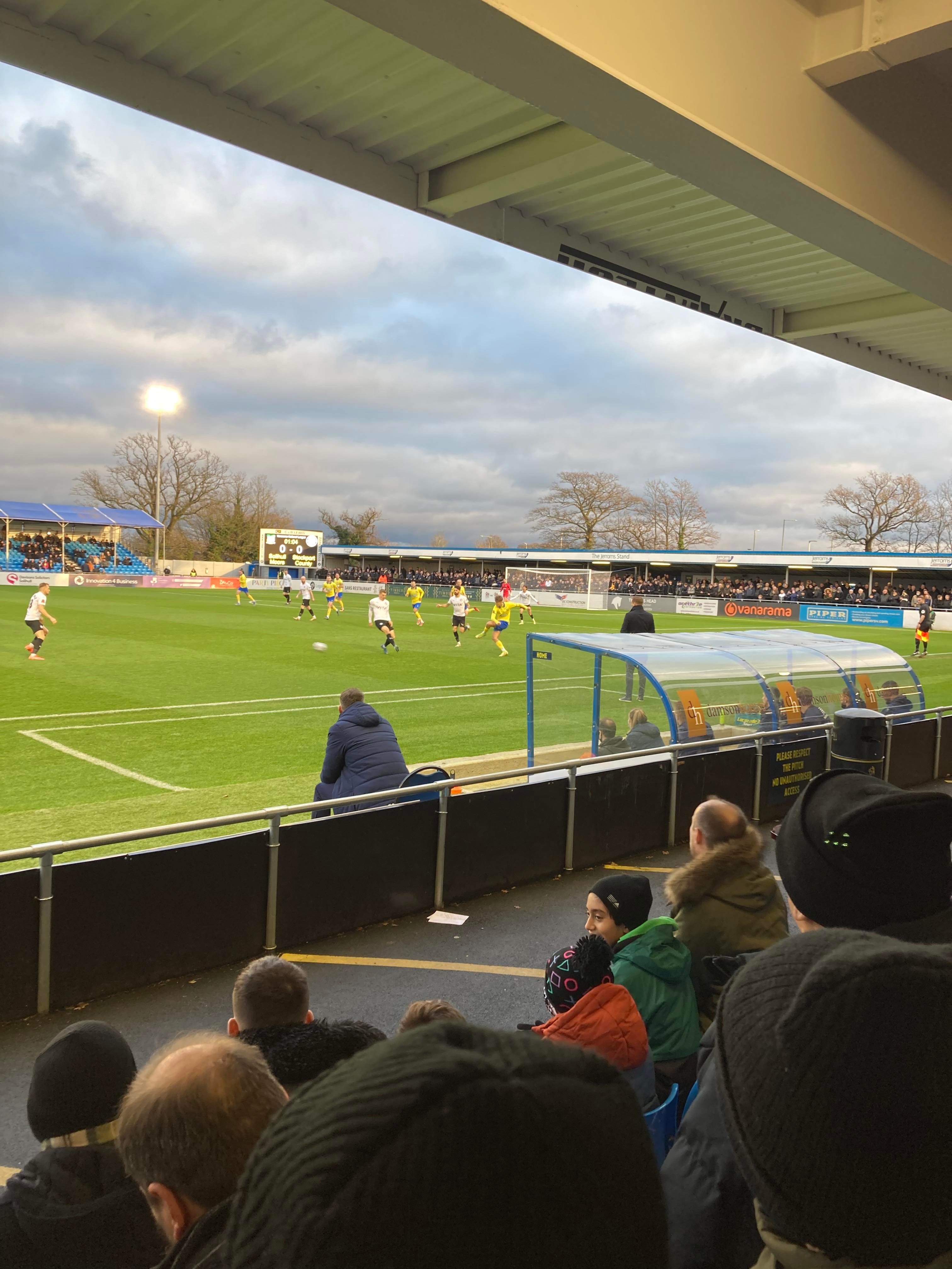 But first, it’s a trip into Birmingham City Centre and… What’s this here? Winterlandia!! A lovely little Christmas market bar here!! Don’t mind if I do! 1 Helles later and now for Solihull. A 30 minute drive later and here I am! £15 to watch this National League promotion battle! Class! Kick off looms closer and then… YouTube Groundhopper Will is here along with his dad who I met at Chasetown earlier this year!! Fantastic!! “BLUE ARMY!” Stockport fans are going for it already!