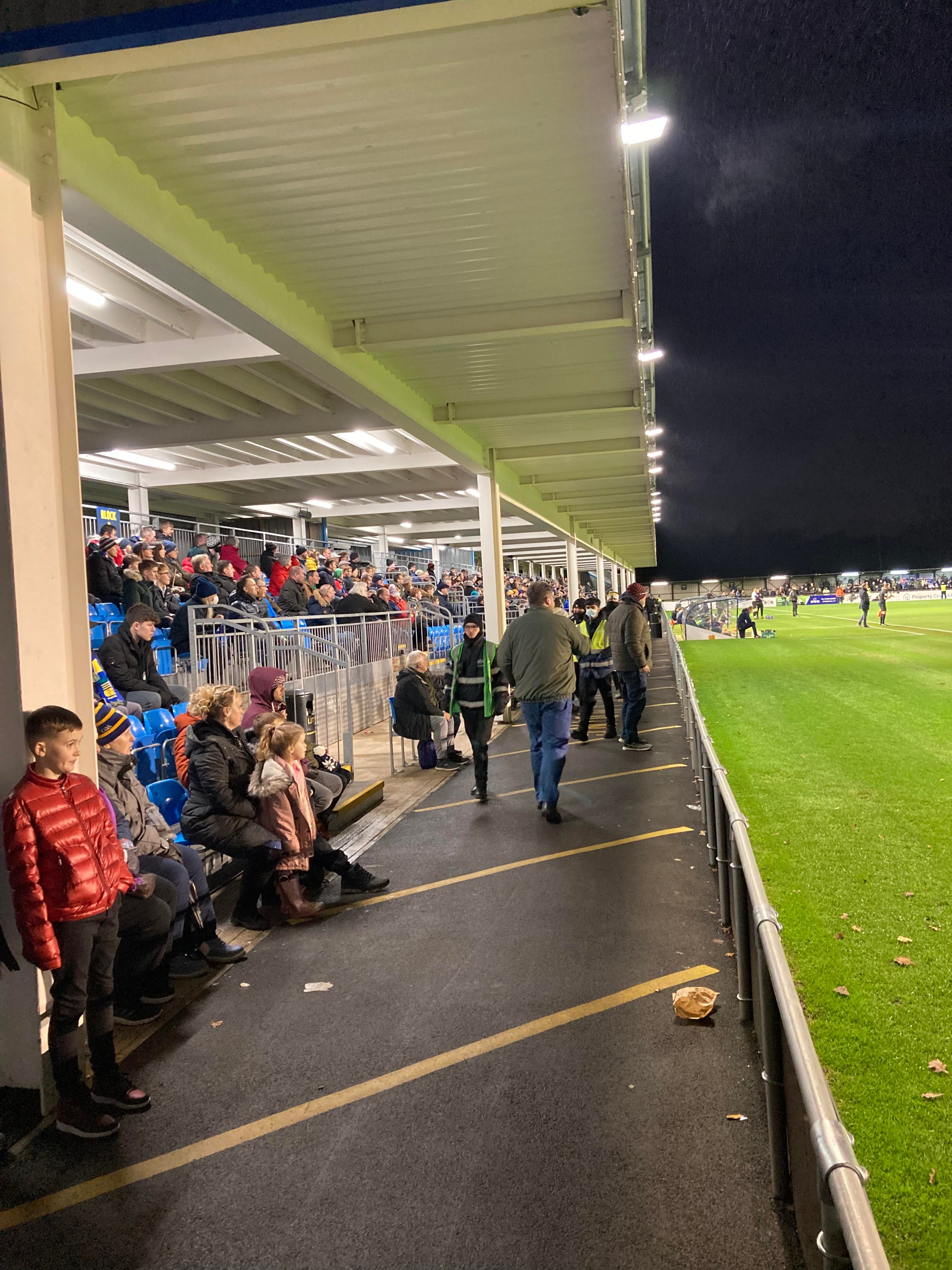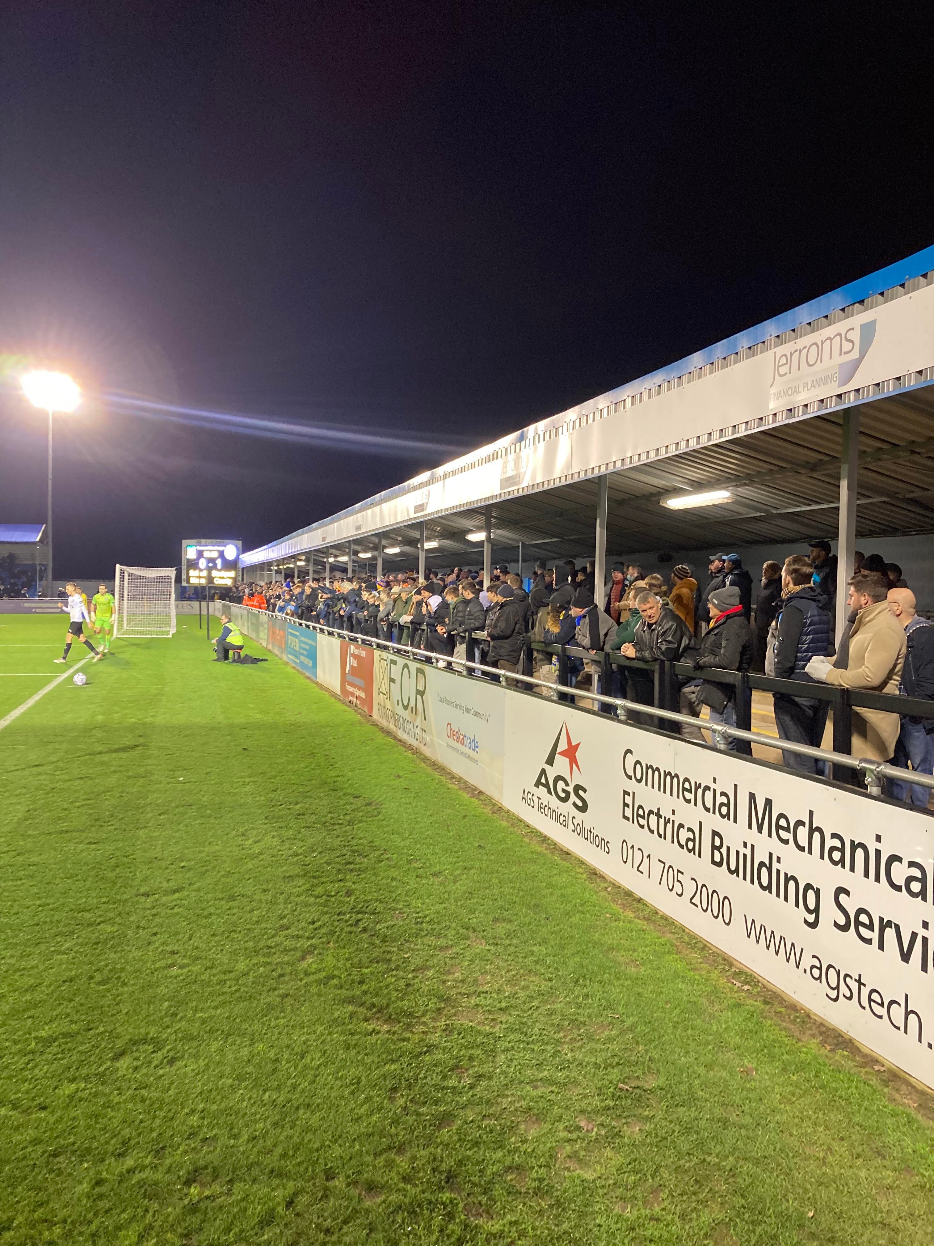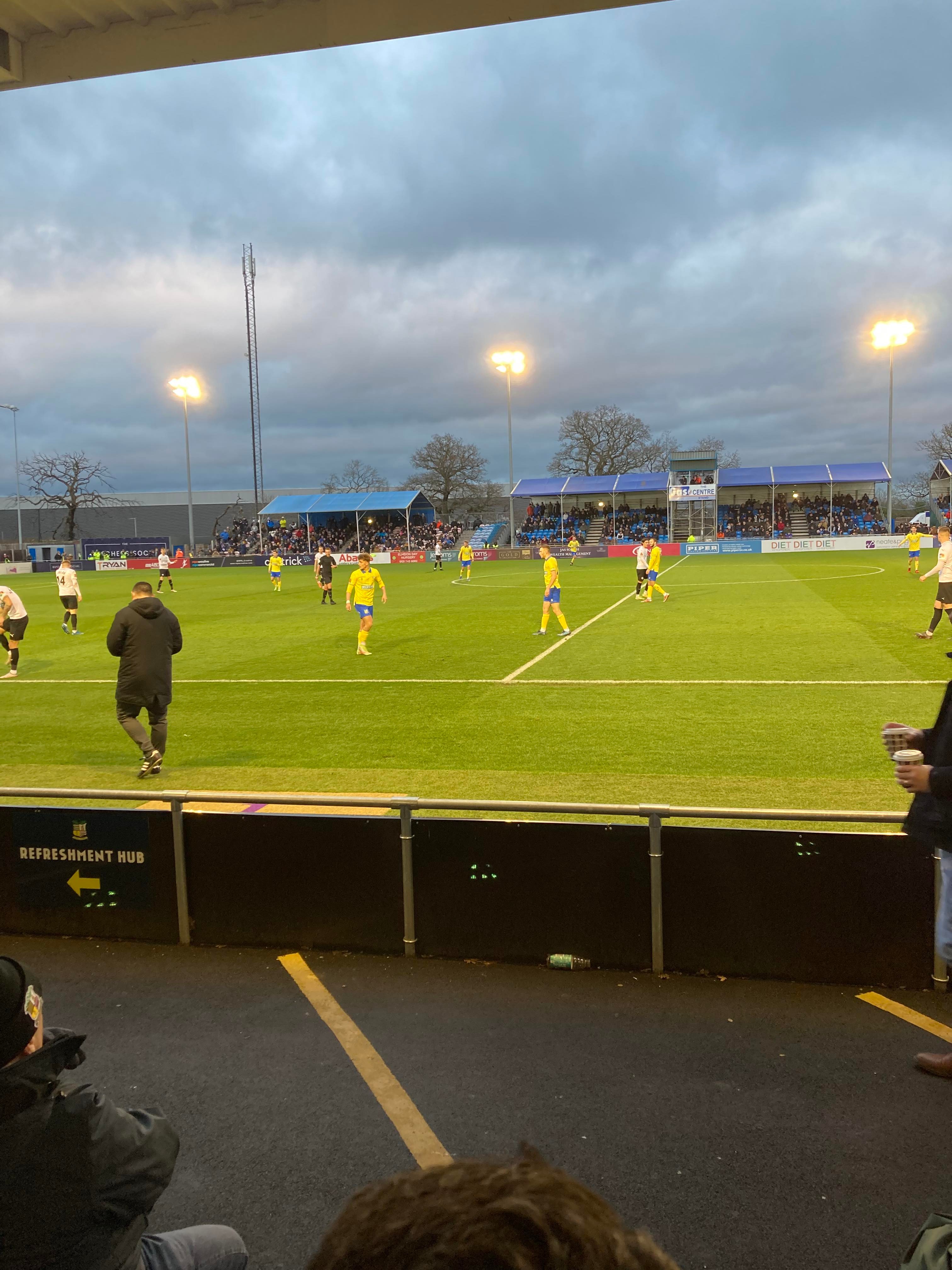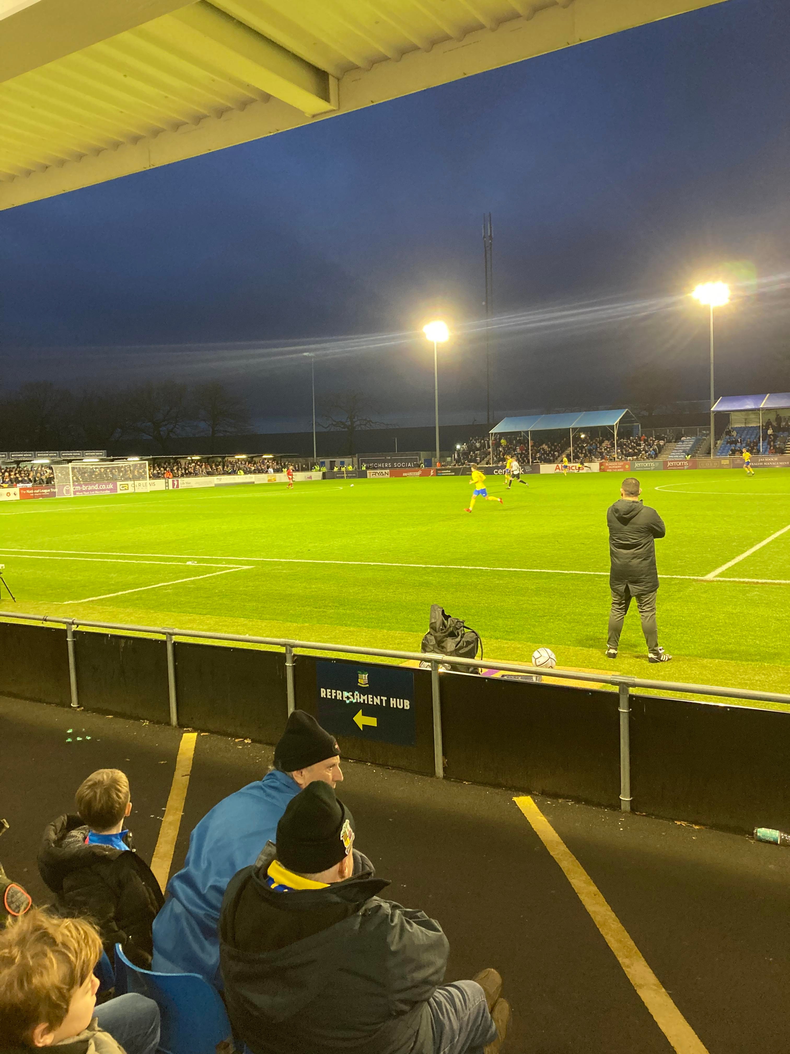 But first, it’s a trip into Birmingham City Centre and… What’s this here? Winterlandia!! A lovely little Christmas market bar here!! Don’t mind if I do! 1 Helles later and now for Solihull. A 30 minute drive later and here I am! £15 to watch this National League promotion battle! Class! Kick off looms closer and then… YouTube Groundhopper Will is here along with his dad who I met at Chasetown earlier this year!! Fantastic!! “BLUE ARMY!” Stockport fans are going for it already!