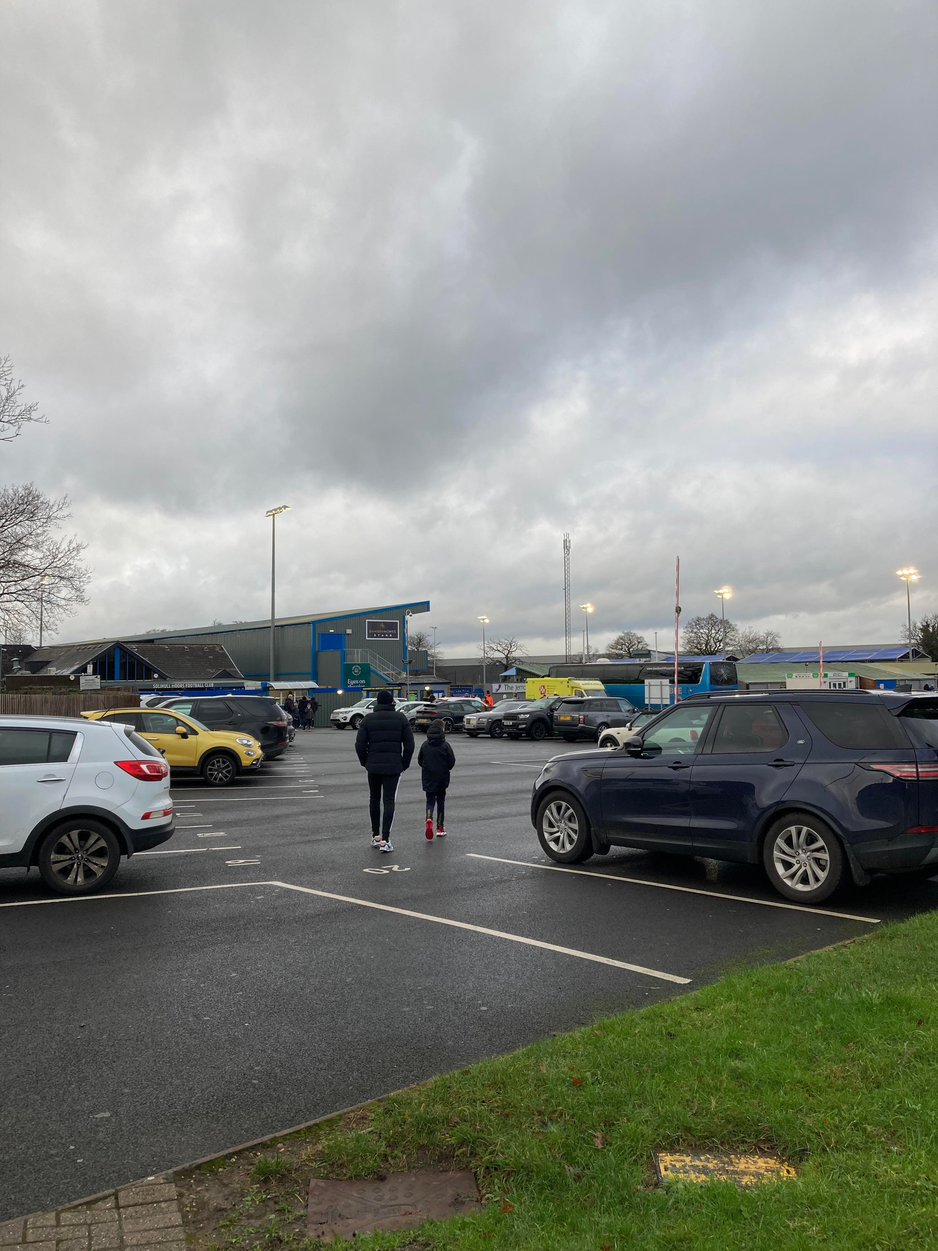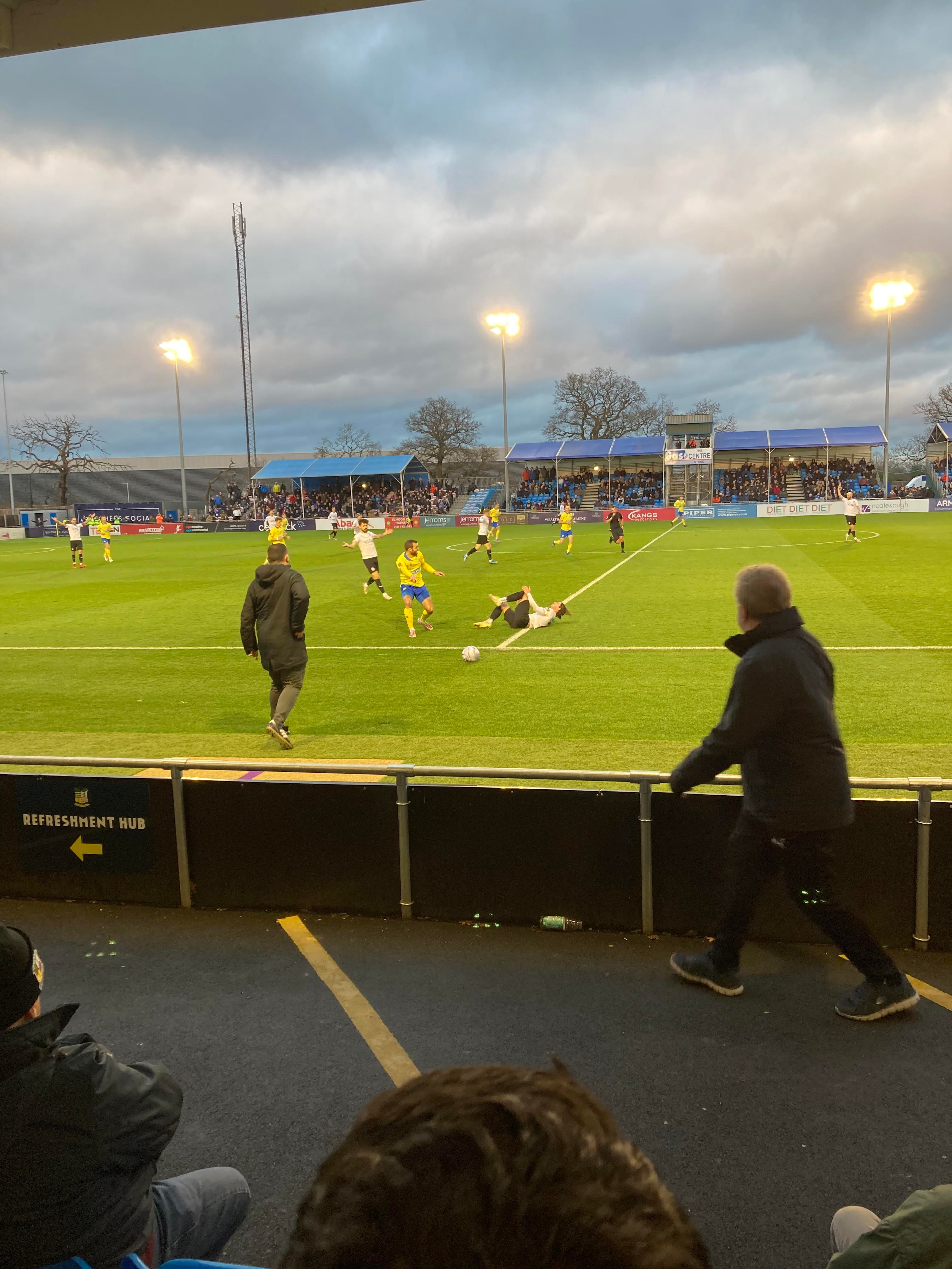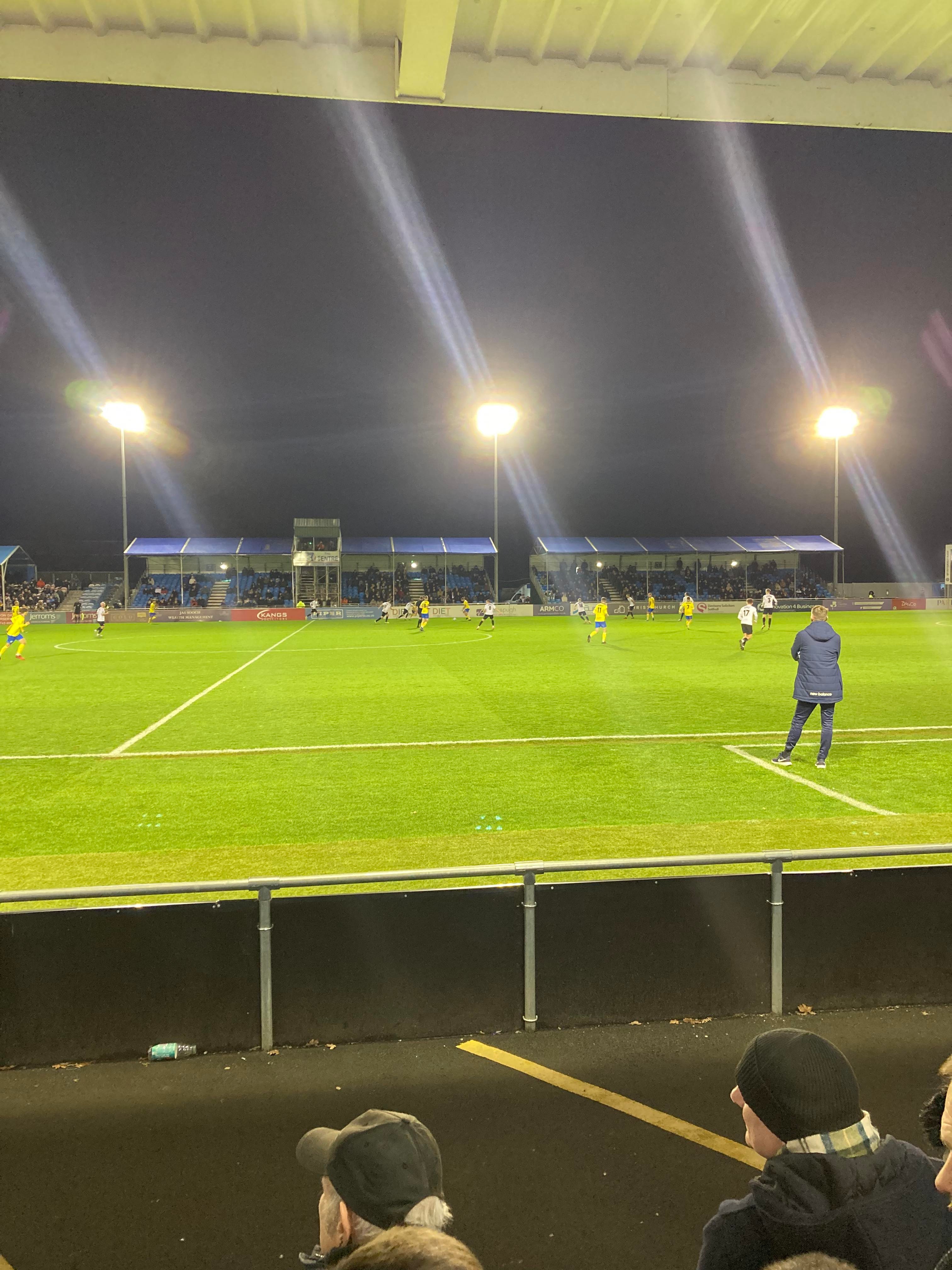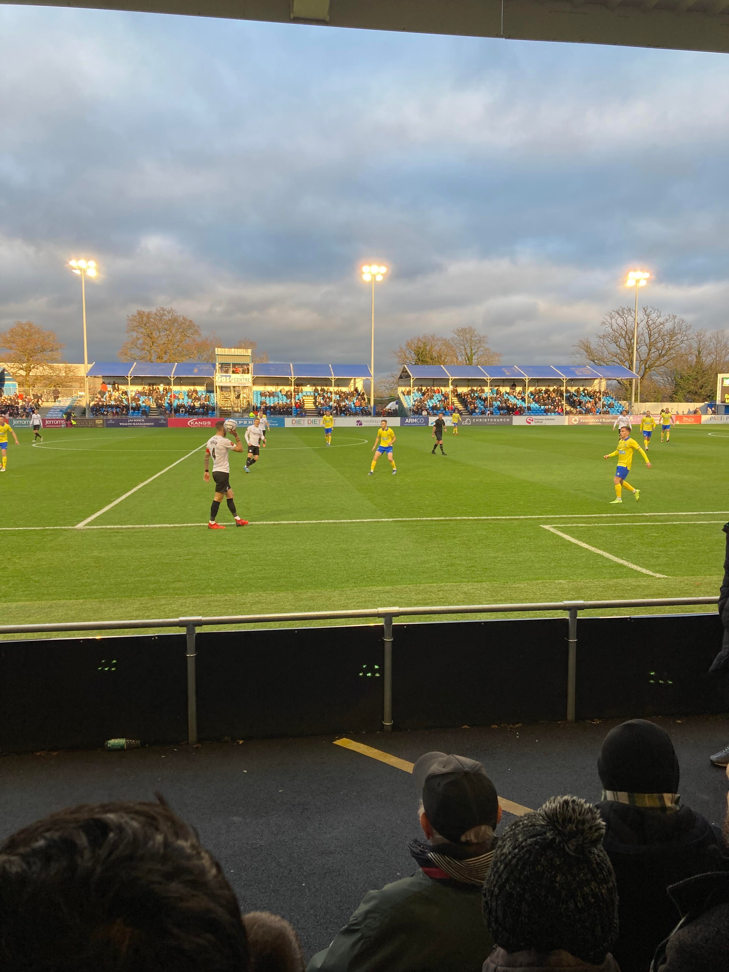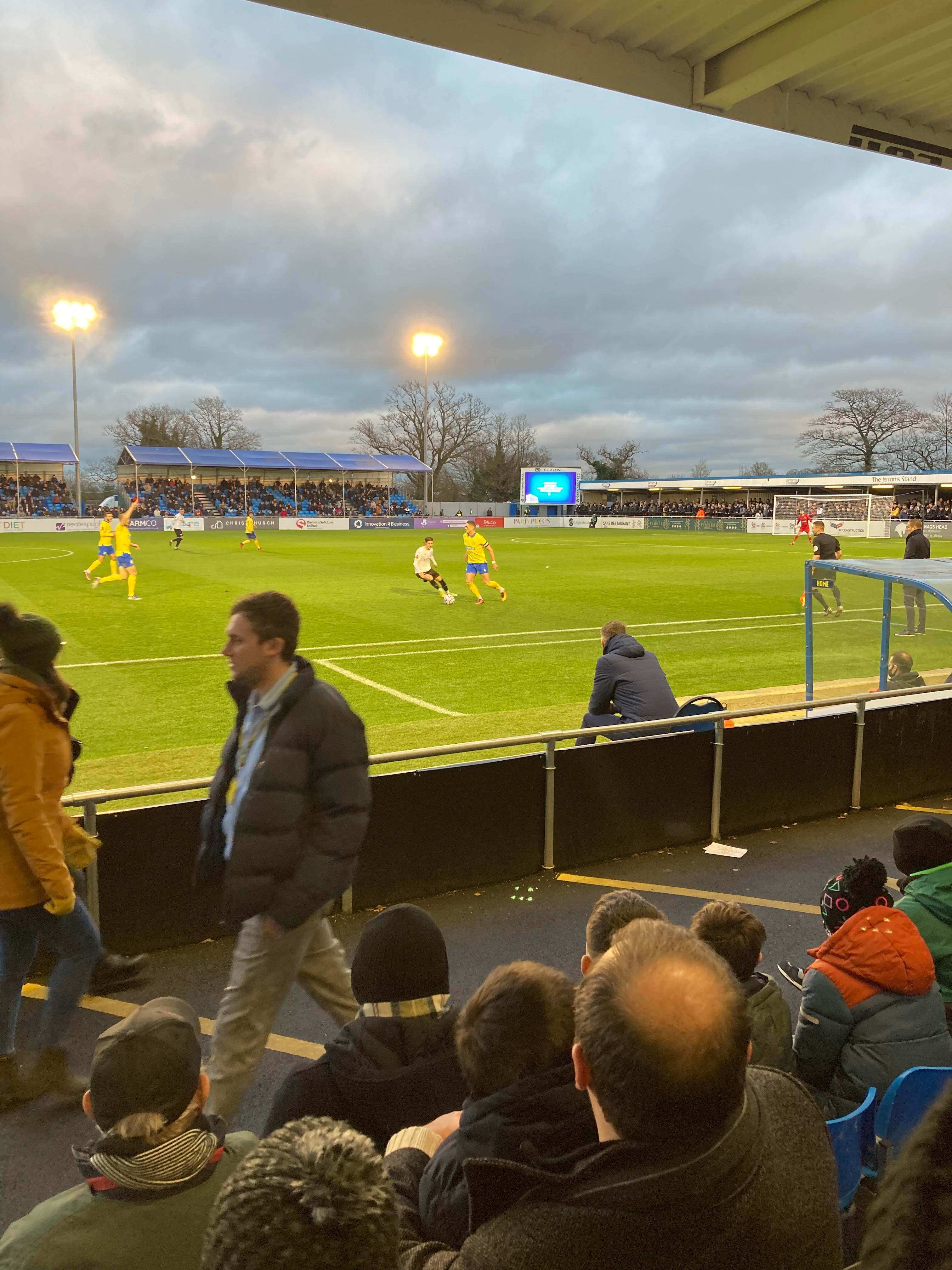 But first, it’s a trip into Birmingham City Centre and… What’s this here? Winterlandia!! A lovely little Christmas market bar here!! Don’t mind if I do! 1 Helles later and now for Solihull. A 30 minute drive later and here I am! £15 to watch this National League promotion battle! Class! Kick off looms closer and then… YouTube Groundhopper Will is here along with his dad who I met at Chasetown earlier this year!! Fantastic!! “BLUE ARMY!” Stockport fans are going for it already!