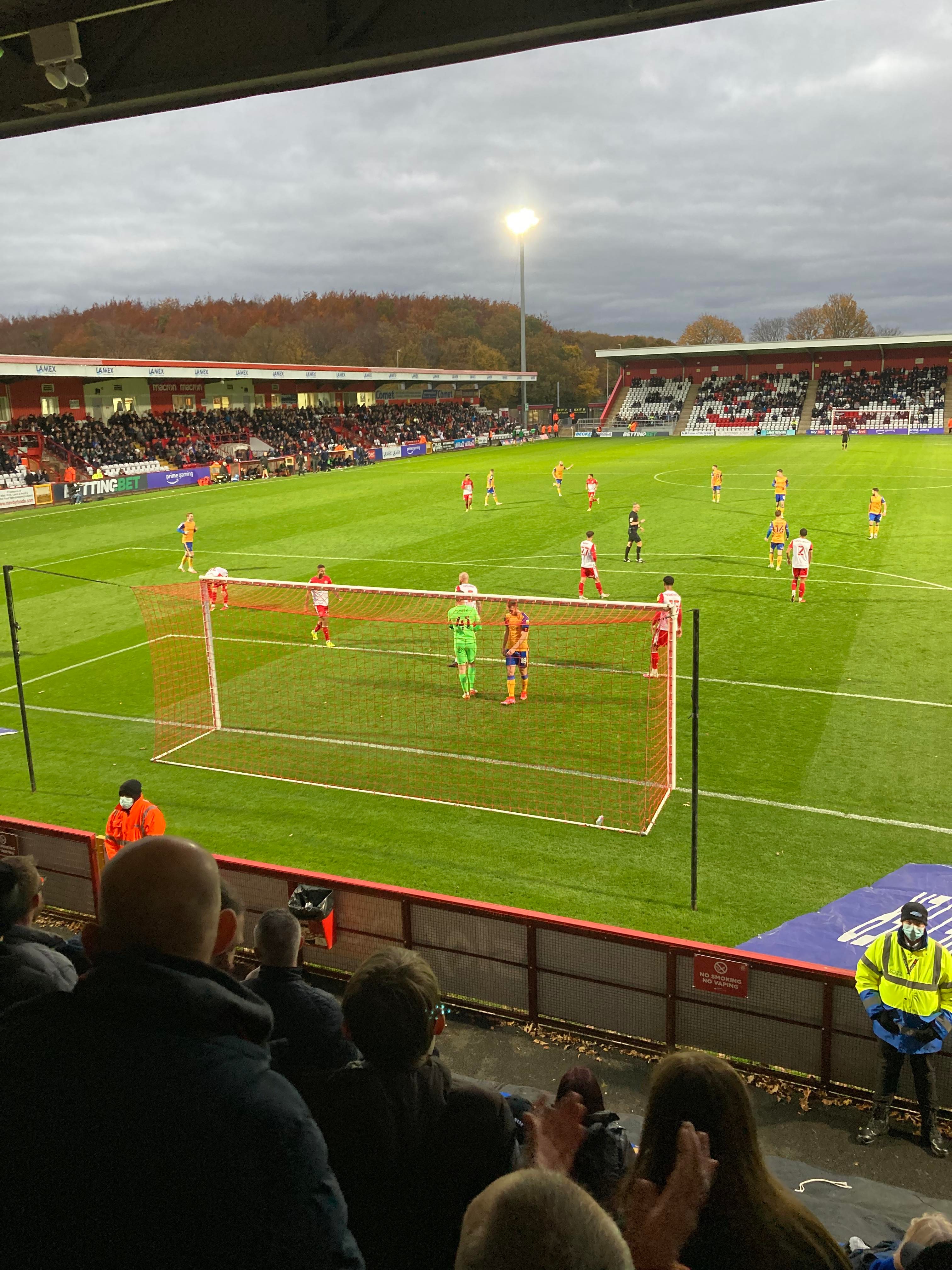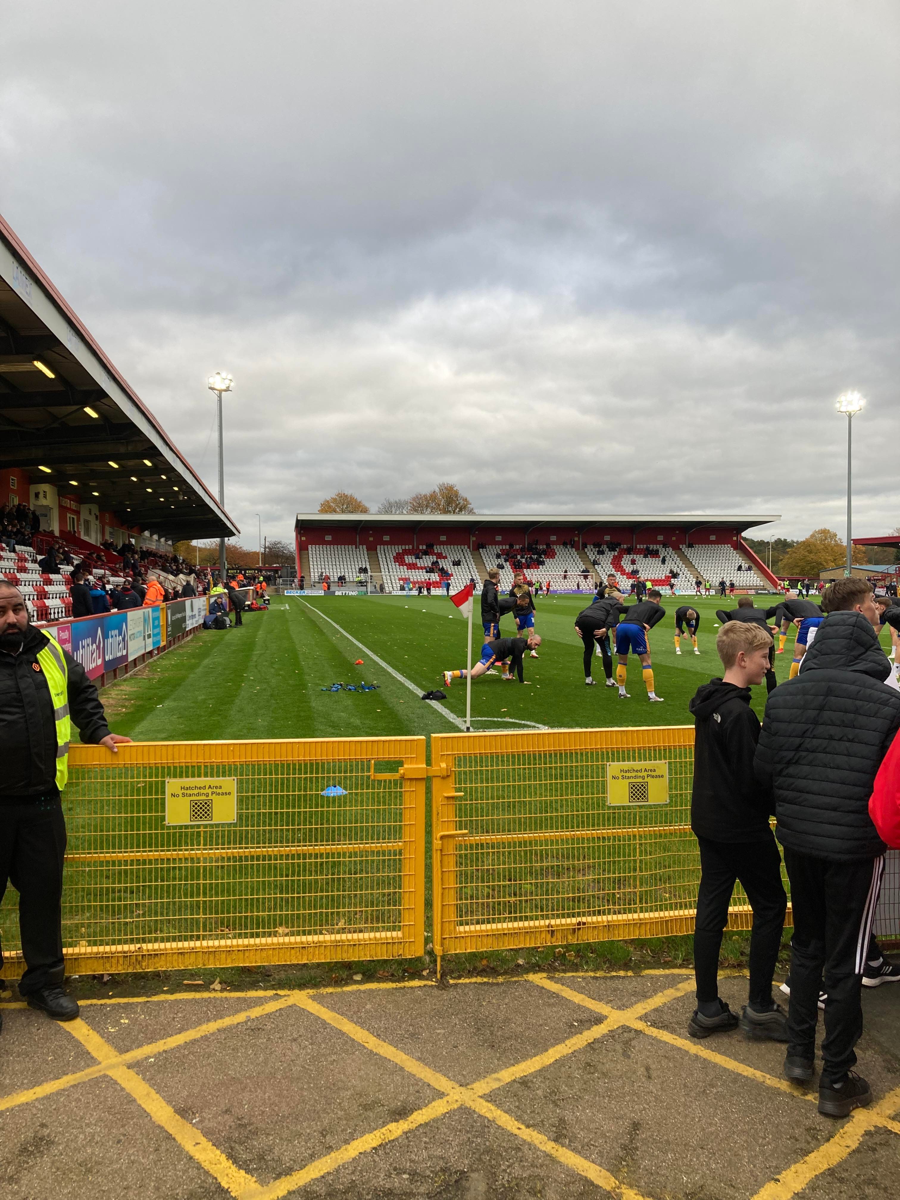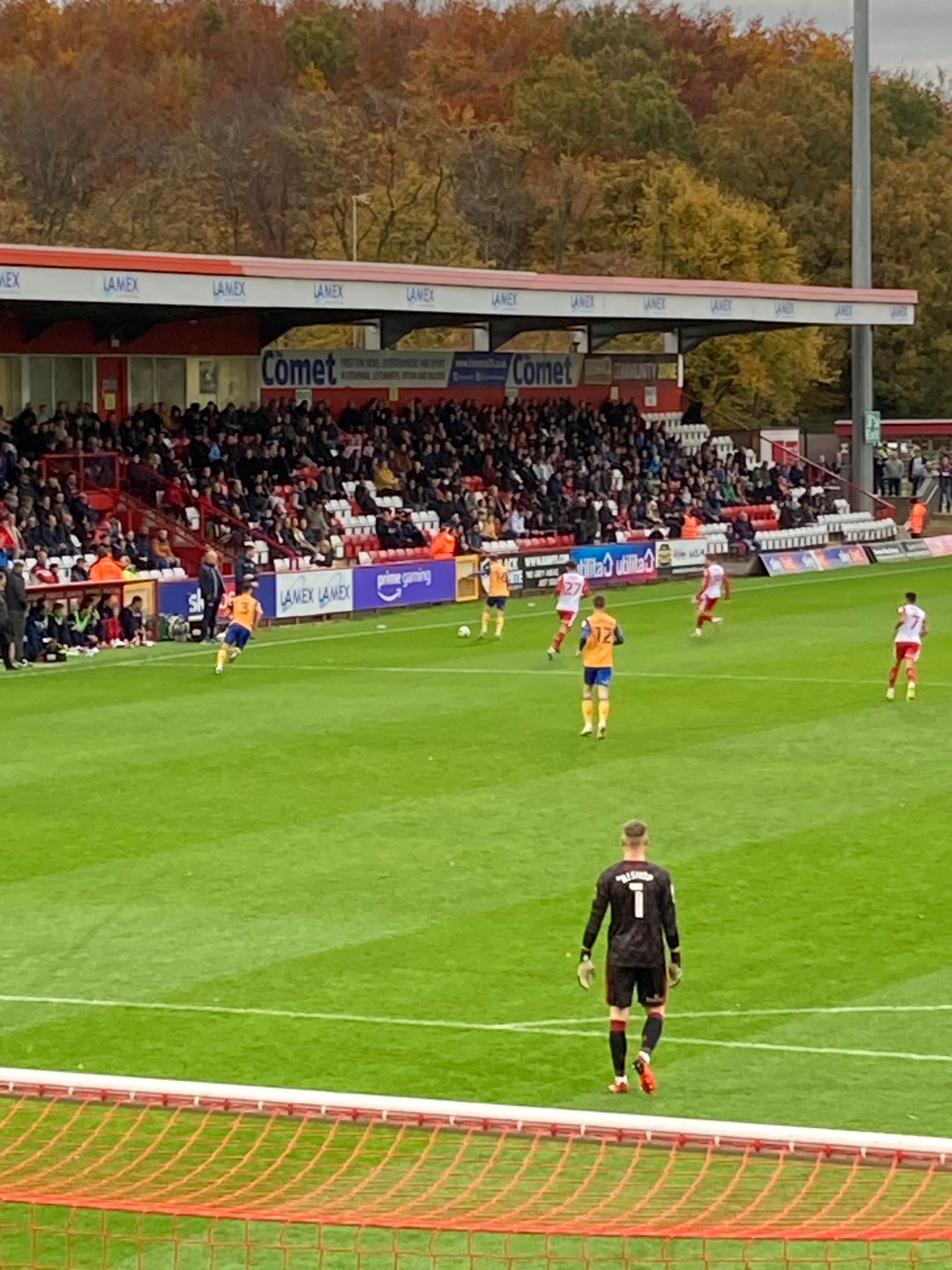 2pm and here I am in Hertfordshire! Now for the walk to the ground. 1 mile later and here we are! £14 to watch this League 2 tie! Tasty indeed! The atmosphere is building in our end already! “Yellows Yellows!” along with a new one of: “Oates Oates! Rhysy Rhysy Oates! He gets the ball and scores a goal Rhysy Rhysy Oates!” And the other new one of: “WAHEEEEEEY WAHOAAAAAH! Super Mansfield!