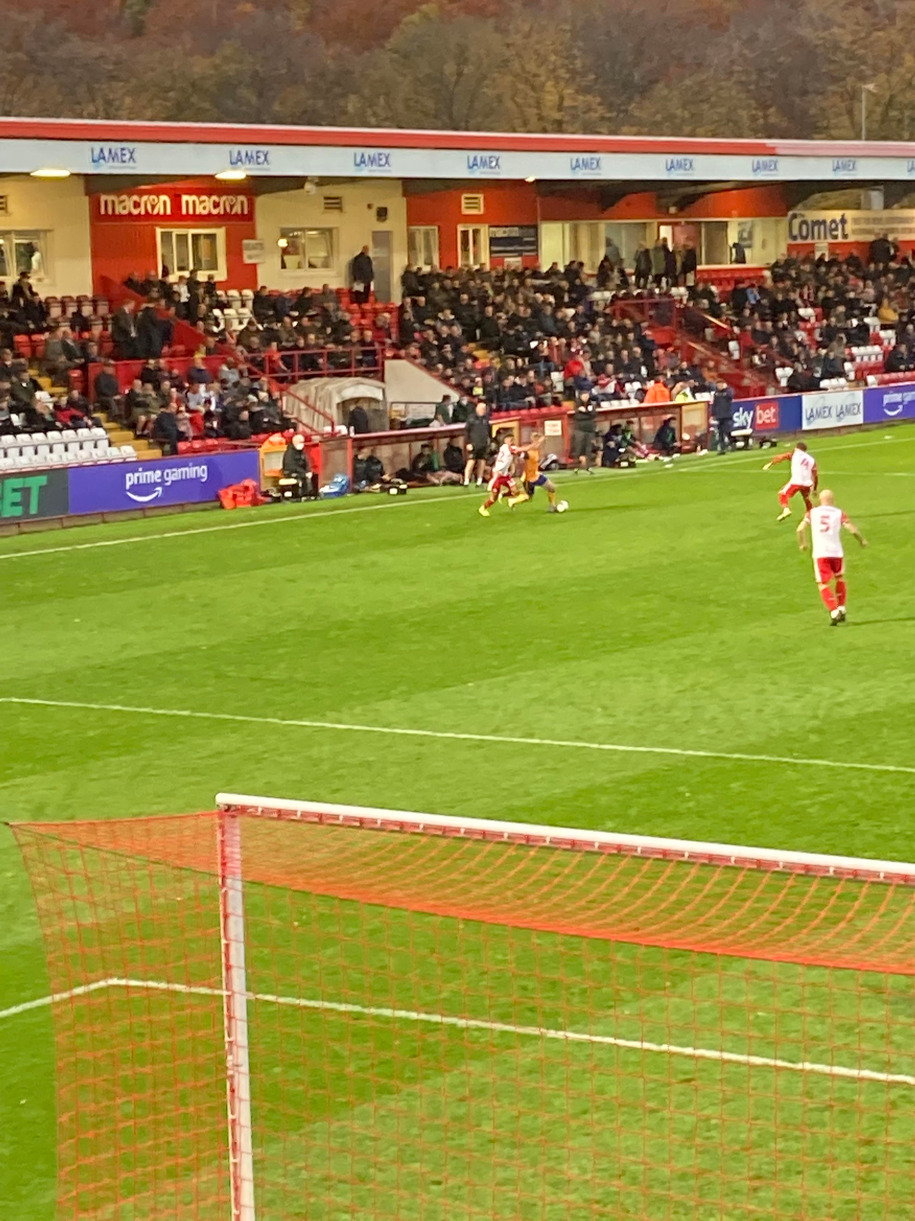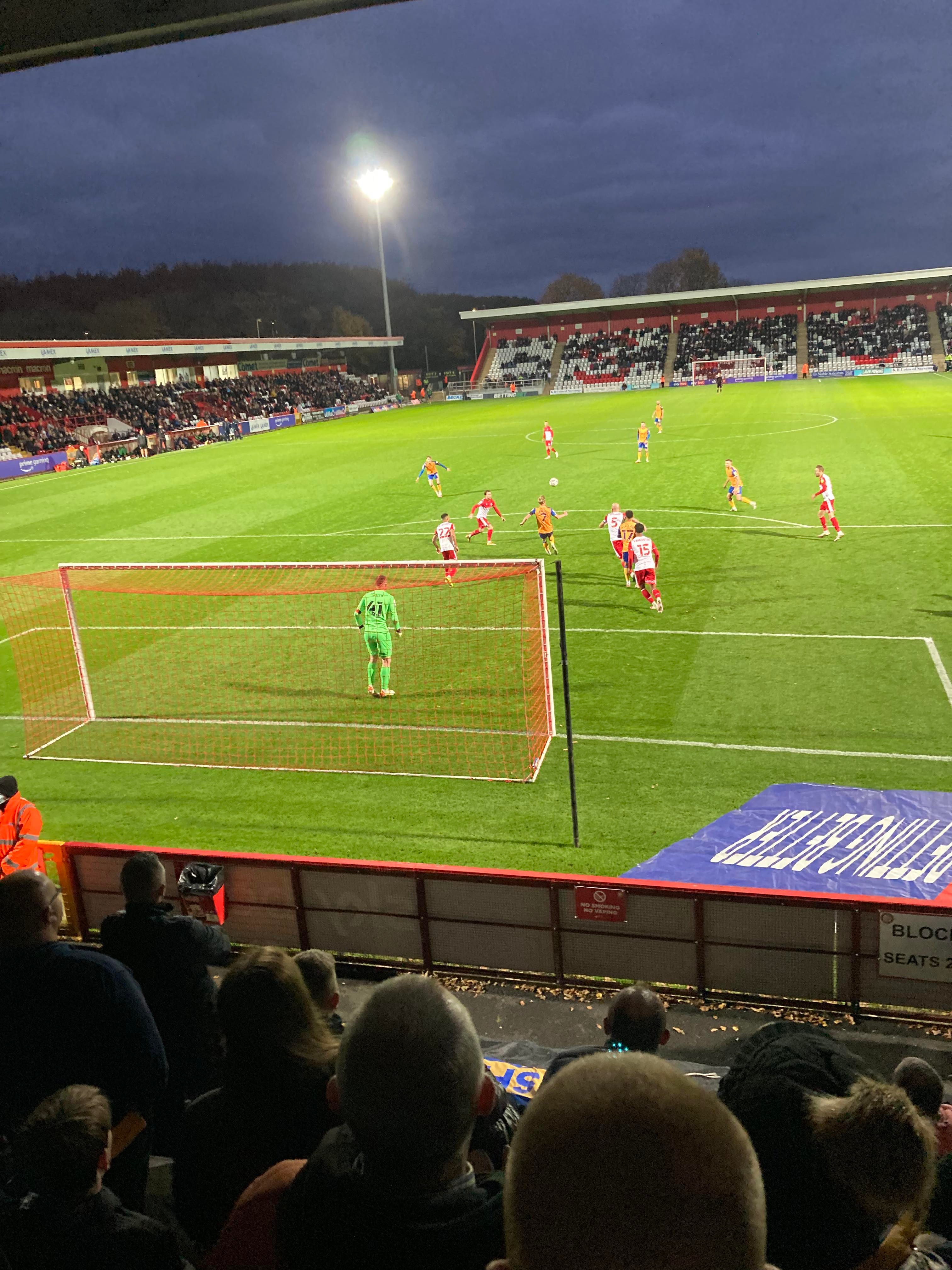 “Since I was young! I followed them! MTFC! The team for me!” Still banging in the away end! 16th minute and Mansfield have a corner, it’s whipped in… McLaughlin is there at the near post… Blocked! It falls to Ollie Hawkins to strike… Over! Close!