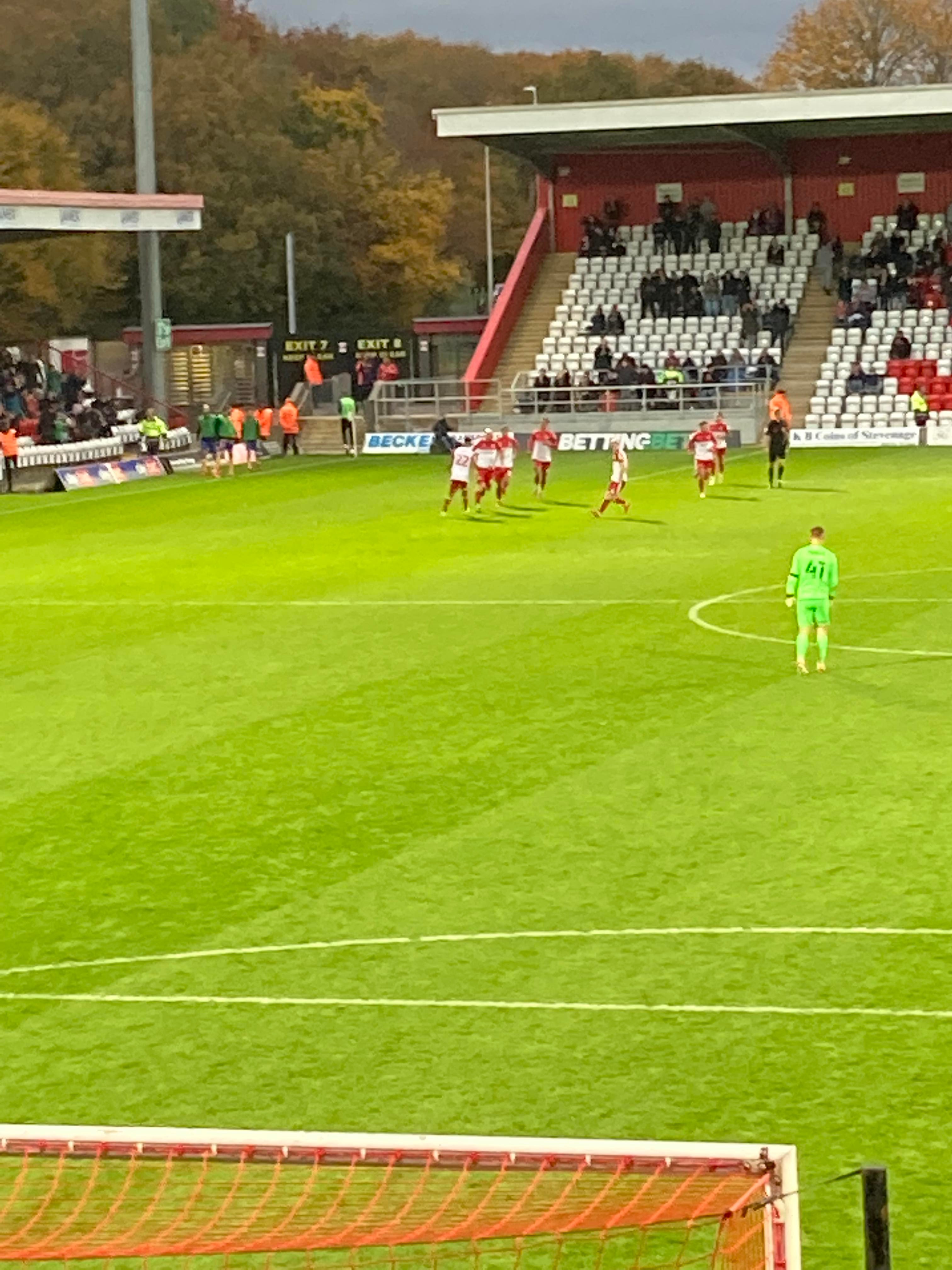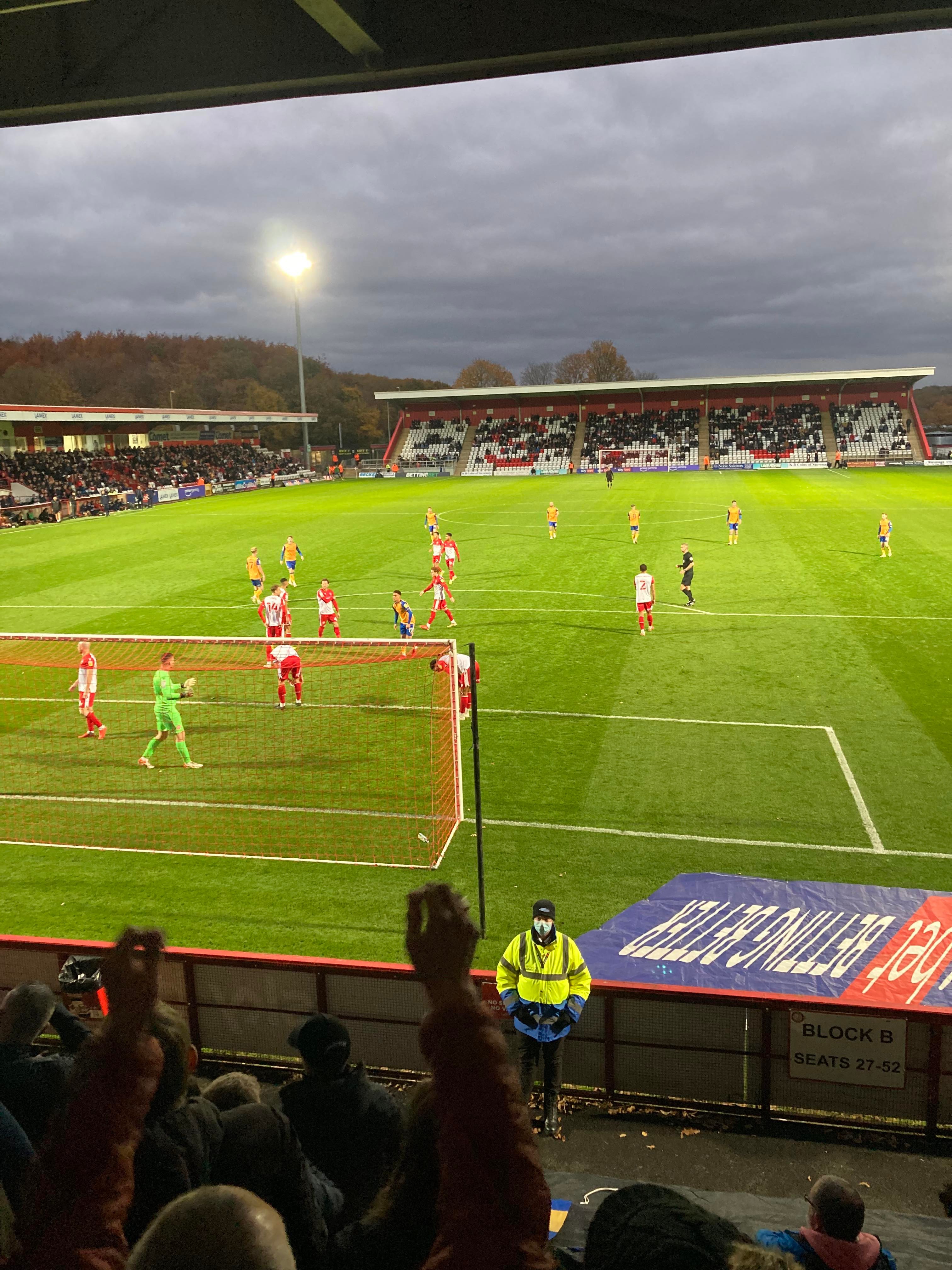 19 minutes on the clock and Mansfield have a free kick in the Stevenage half, it’s whipped into the box, John-Joe O’Toole with the header… GOAL!!!! Mansfield have the lead!!! And the away end goes crazy!!!!!! 0-1!!! “WAHEEEEEEY WAHOAAAAAAH! WAHEEEEEEEY! WAHOAAAAAAAH!!! Super Mansfield!”