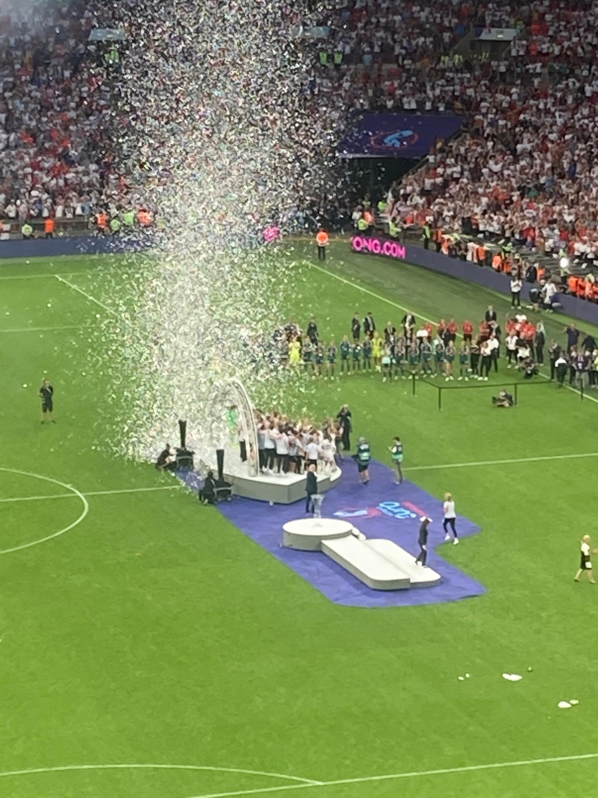Now it’s time for the ceremony! Out comes Prince William to present the Trophy! The players and officials receive their medals and now for the big moment! Leah Williamson has the trophy in her hands…………… YEEEEESSSSS!! FOOTBALL IS COMING HOME!!! ENGLAND ARE THE CHAMPIONS!! The Legacy will live on and on!