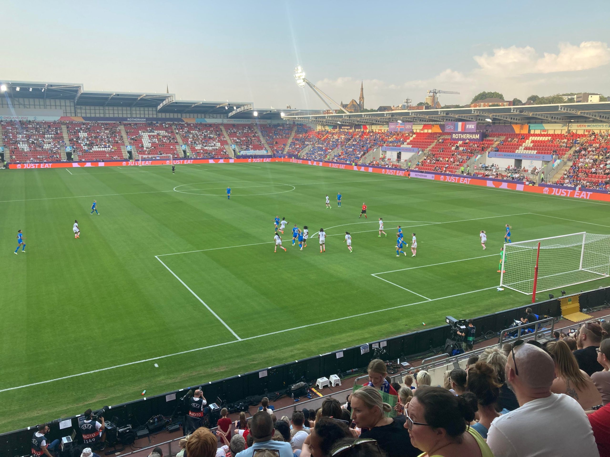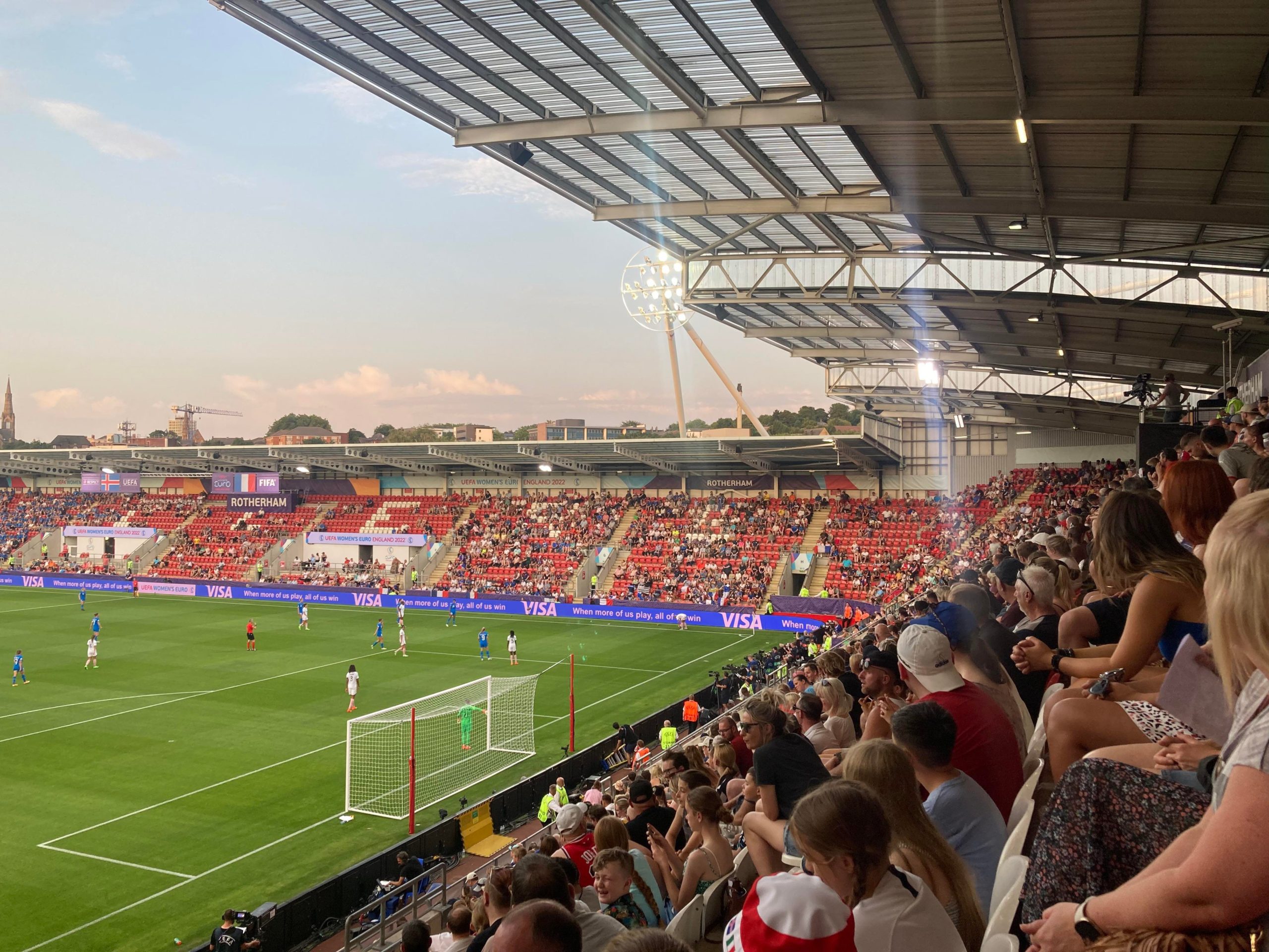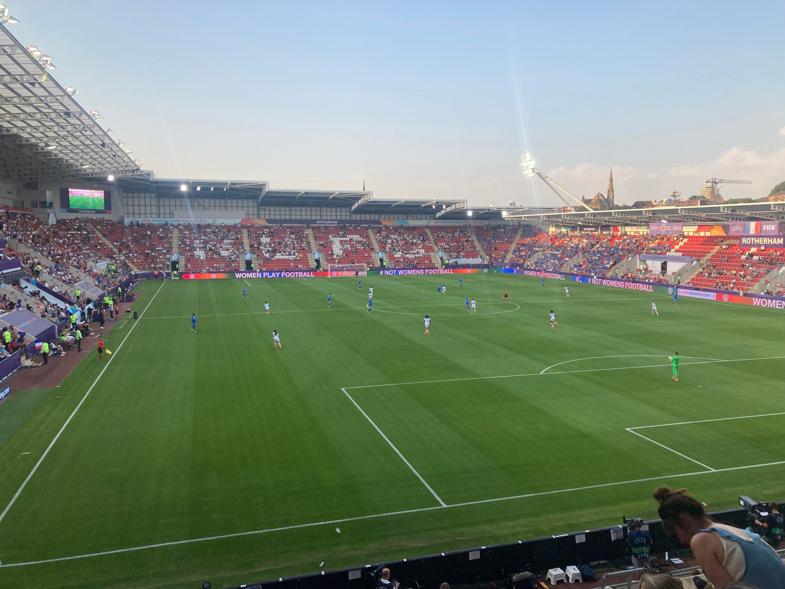 10 minutes later and I’m starting to melt… I’m going in! £10 to watch this Women’s Euros tie! Belting! My third time in this ground and my first time in what is the away end of the ground and I have to say that you do get a good view of Rotherham from here! The atmosphere is starting to build around the ground now with the clappers being used.