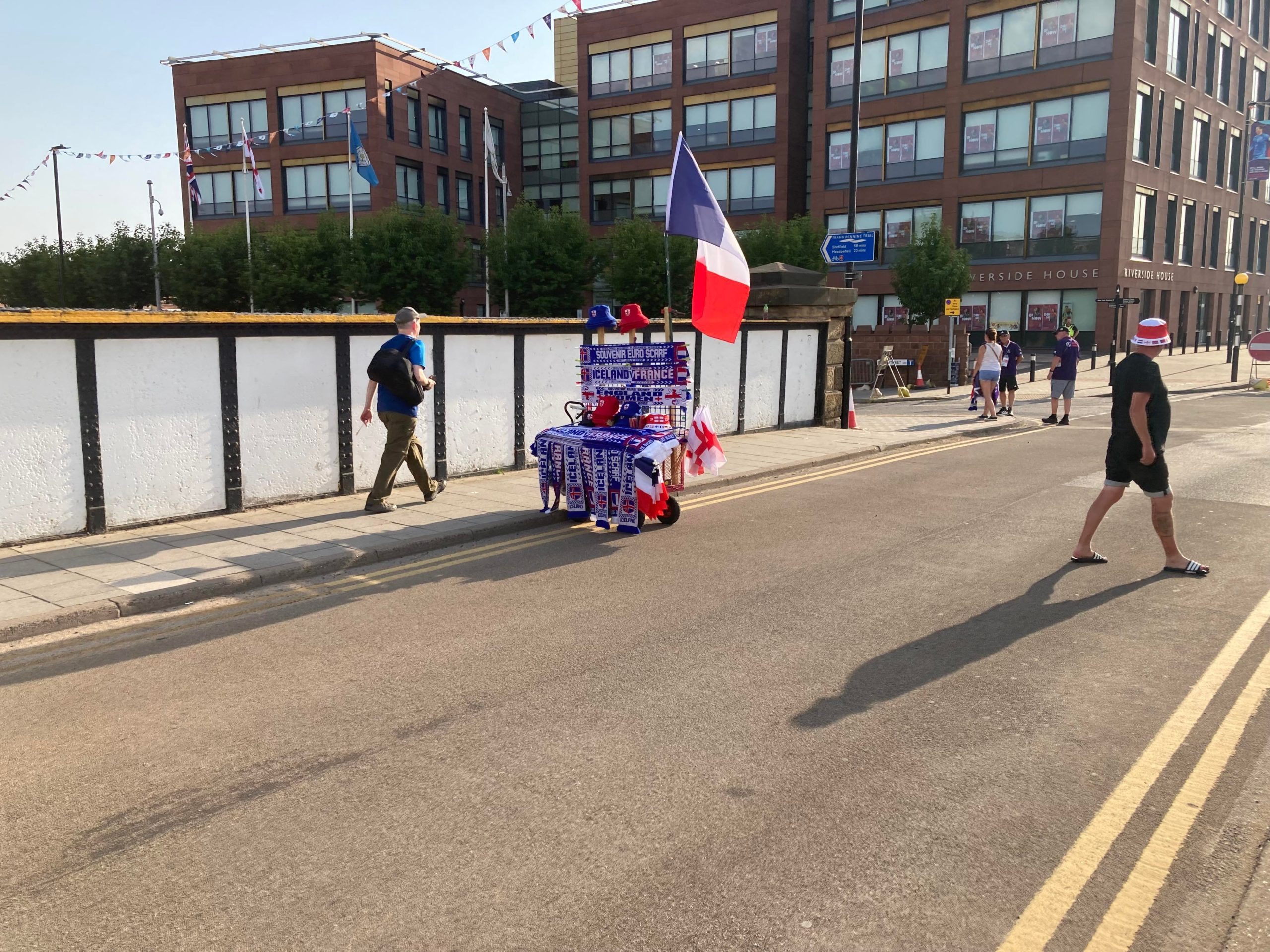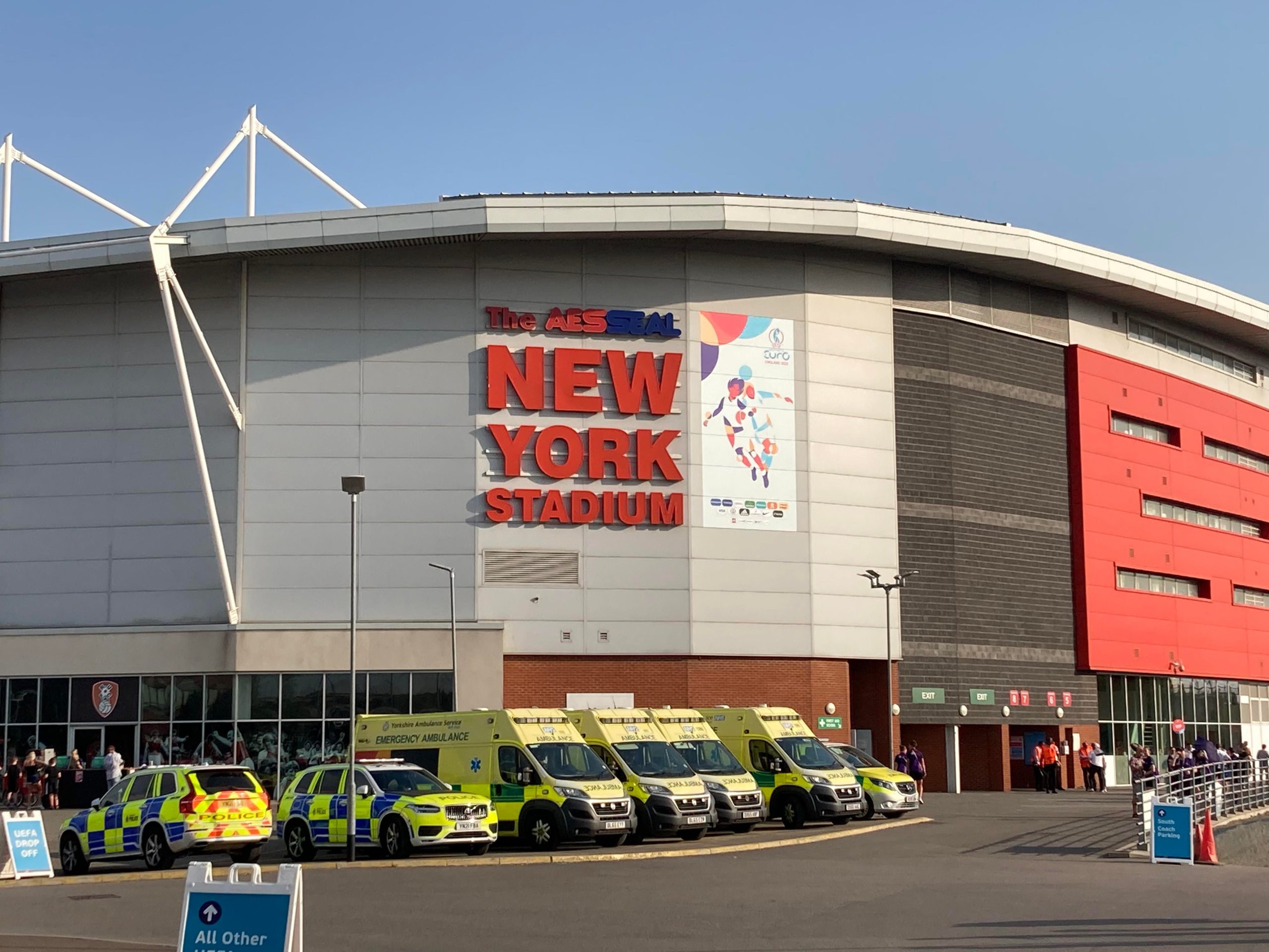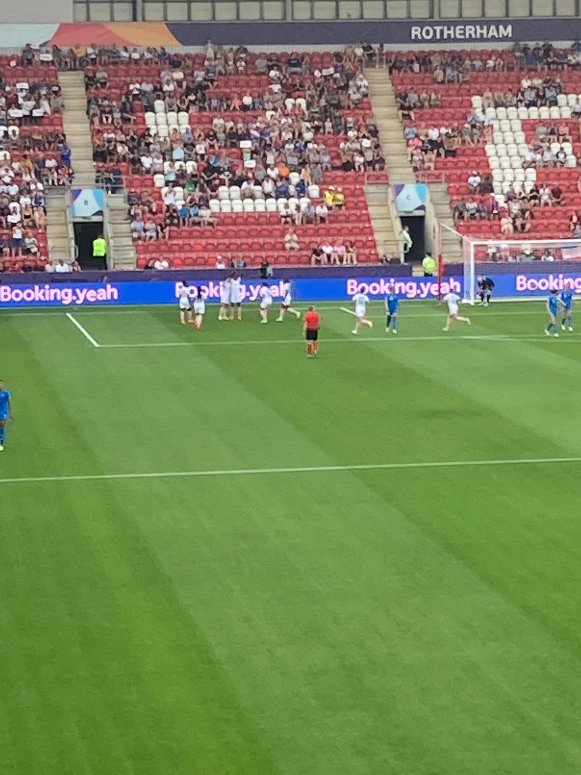 10 minutes later and I’m starting to melt… I’m going in! £10 to watch this Women’s Euros tie! Belting! My third time in this ground and my first time in what is the away end of the ground and I have to say that you do get a good view of Rotherham from here! The atmosphere is starting to build around the ground now with the clappers being used.