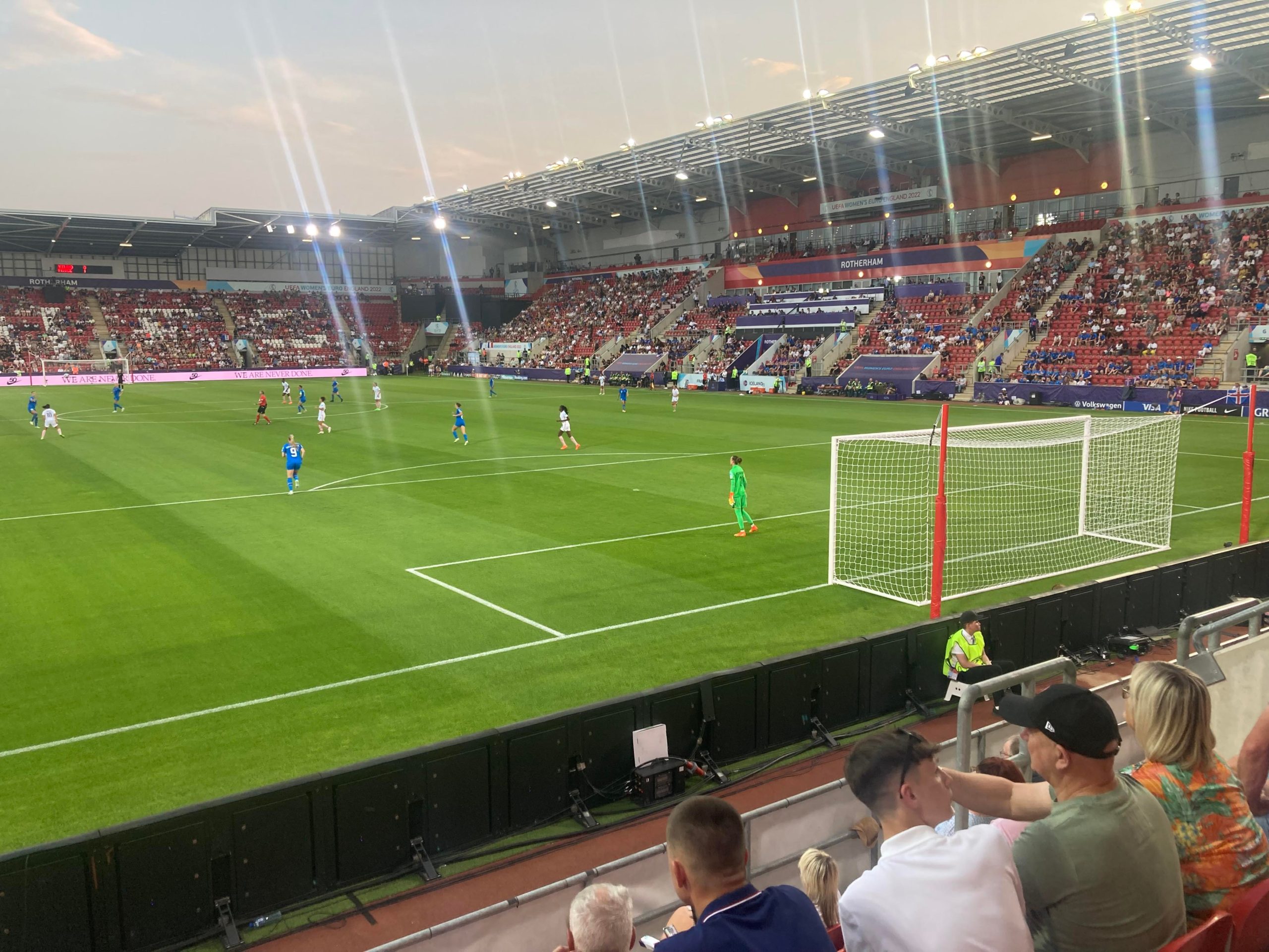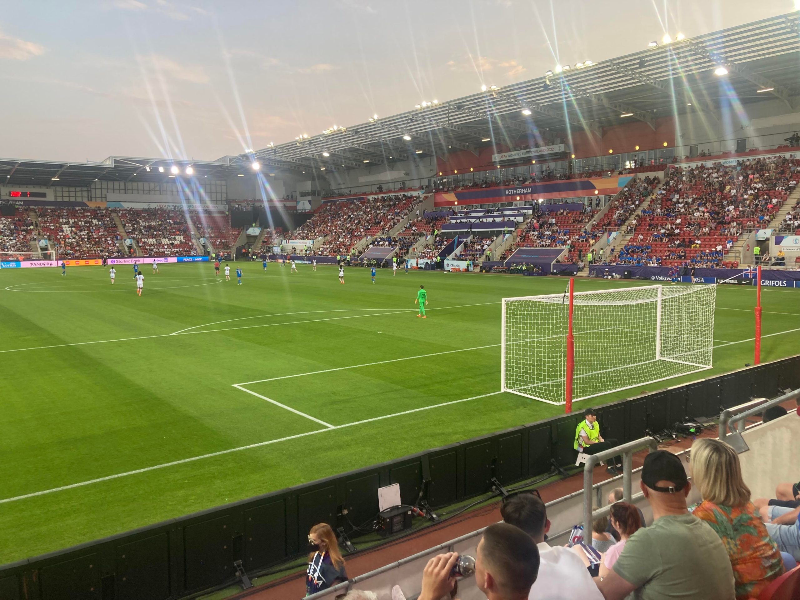 “Da da dadada dadadada Iceland!” Good noise so far from Iceland! Mr & Mrs Merry Miller are sat at the other end of the ground… 5 minutes on the clock and France lose the ball in their own half, it comes to Karólína Lea Vilhjálmsdóttir who goes for goal from around 20 yards out… Just wide!