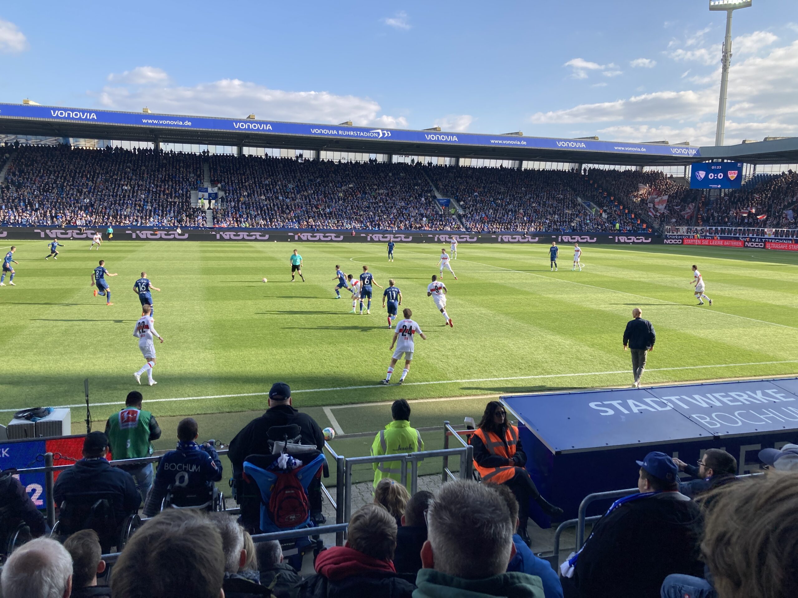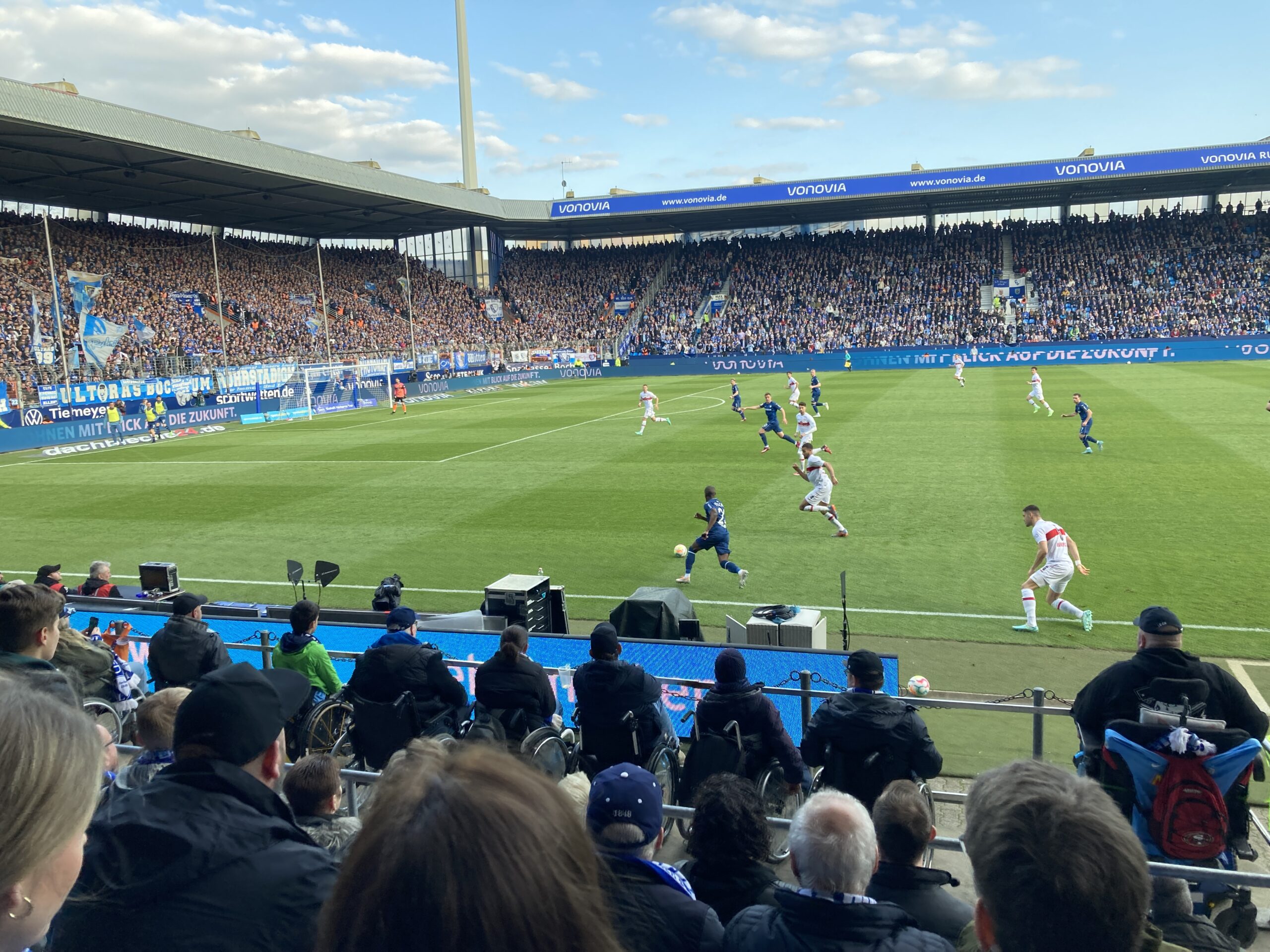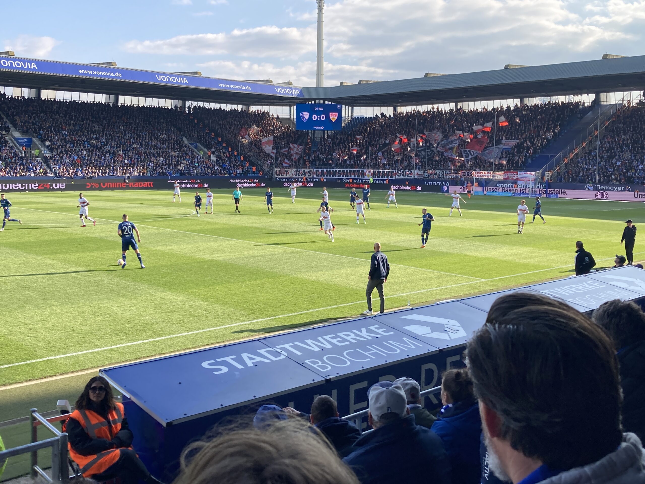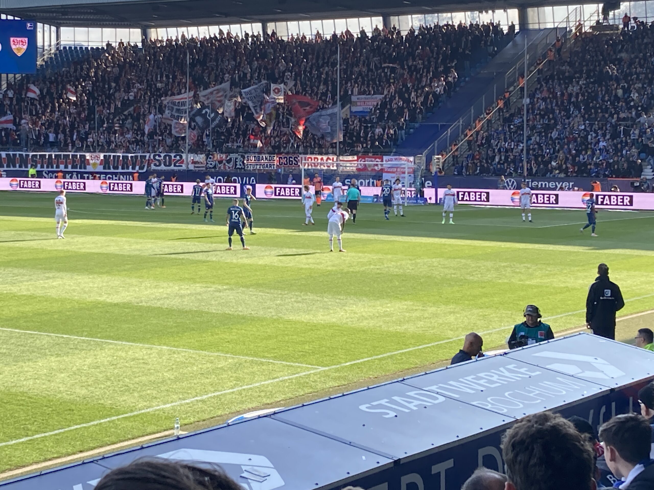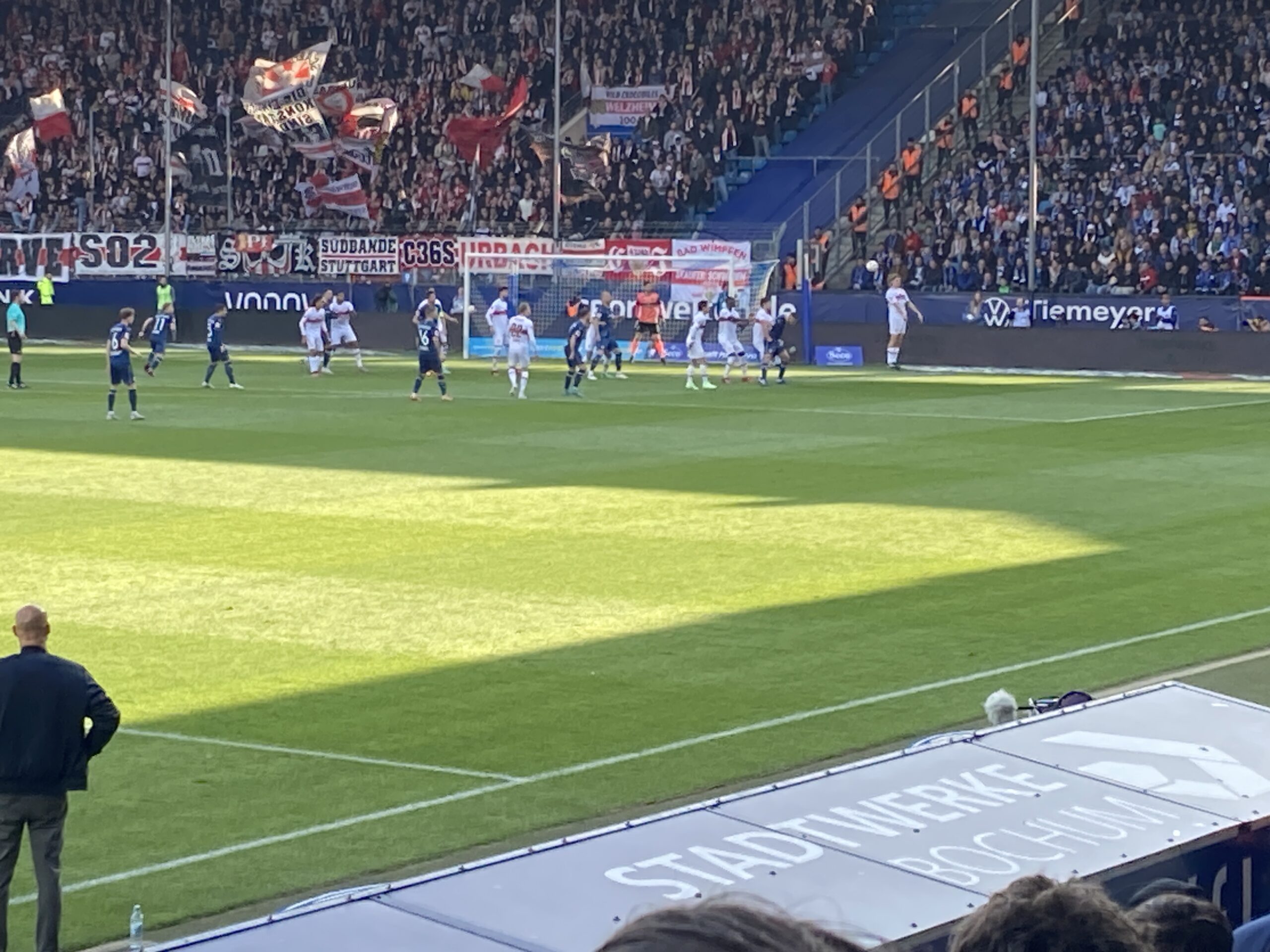 Kick Off! The Bochum fans are amazing so far! Stuttgart pretty impressive too! Germany is the place! Bochum playing a lot of long balls so far whereas Stuttgart are looking to work it through the thirds.