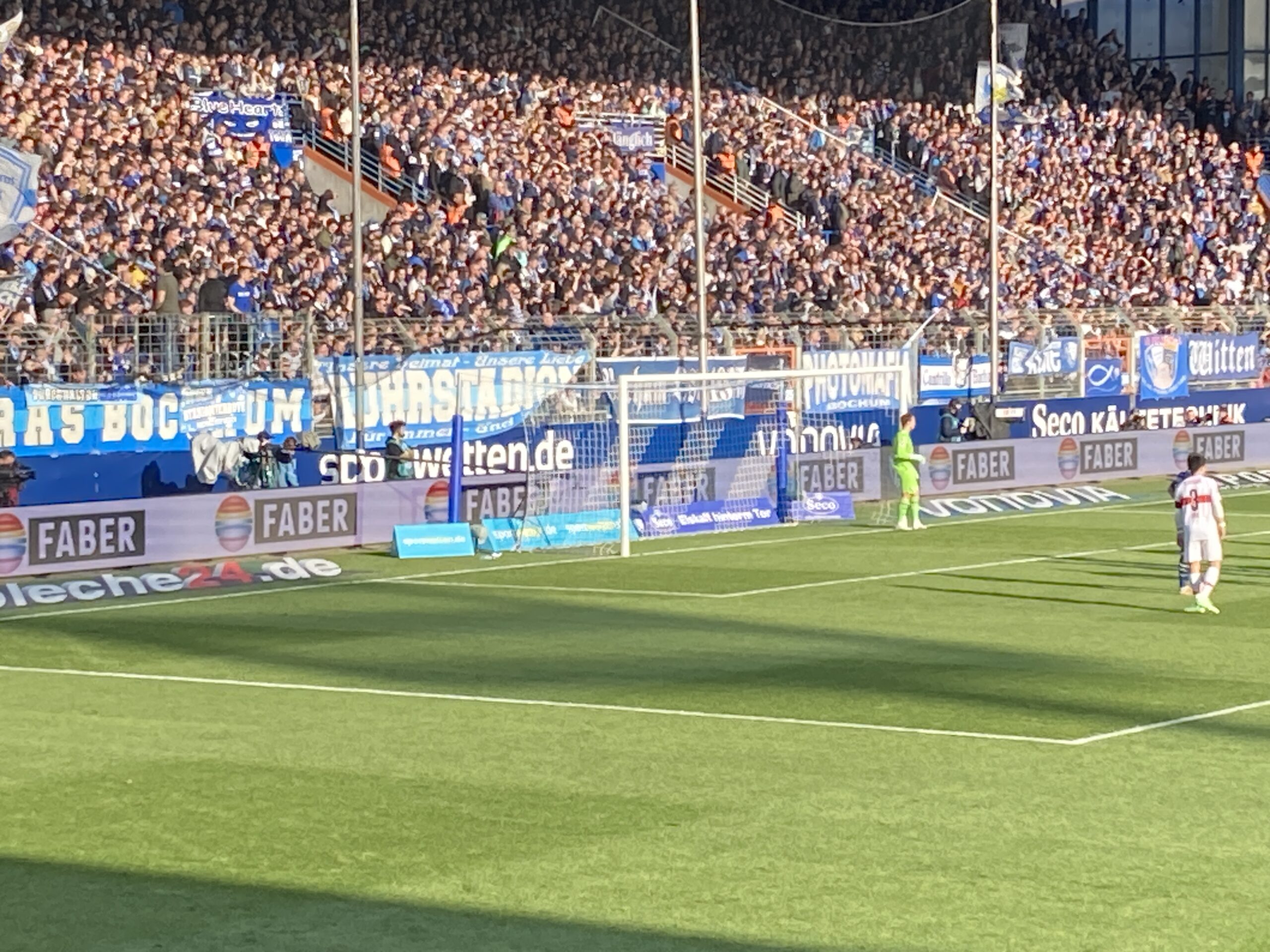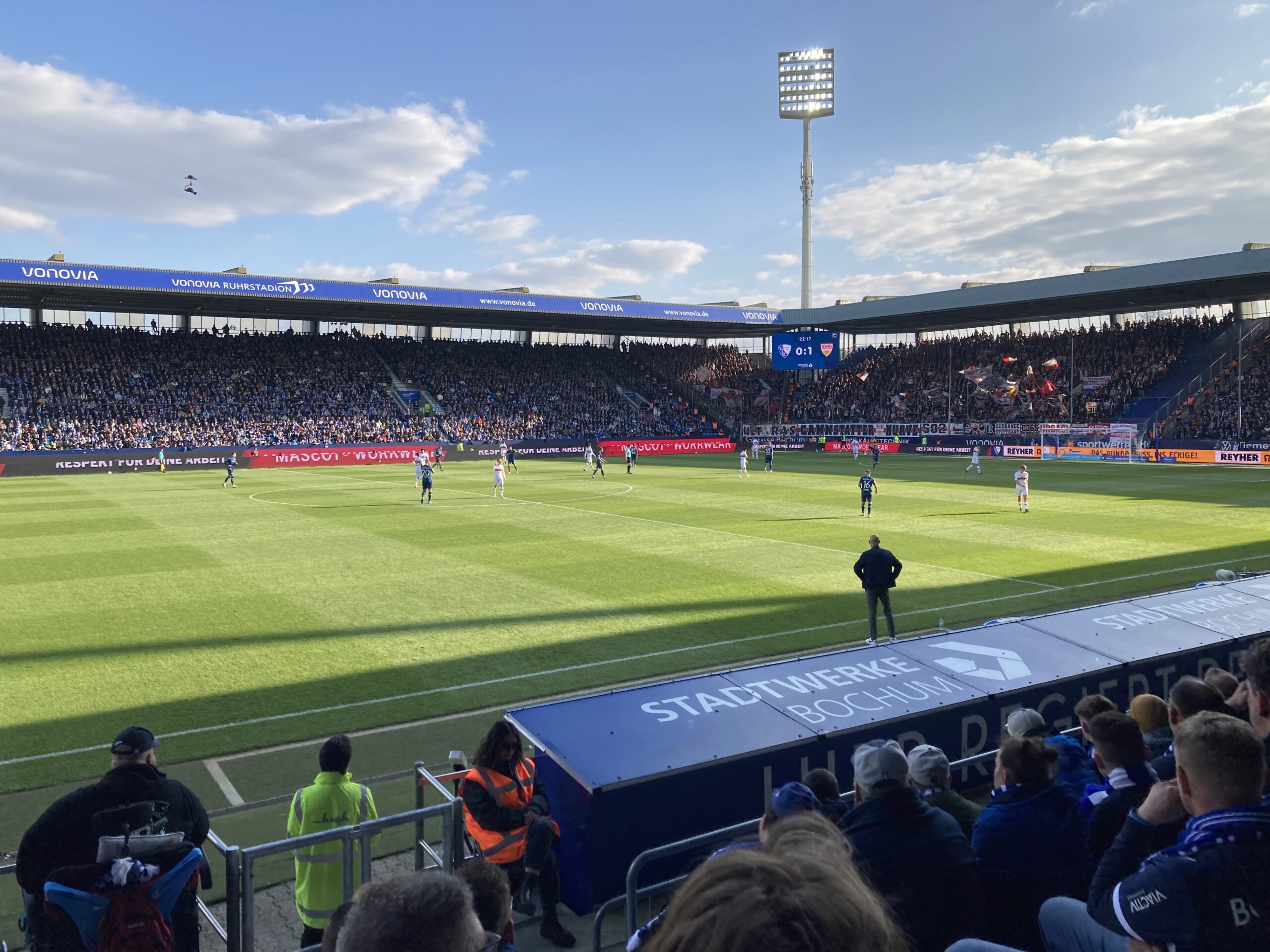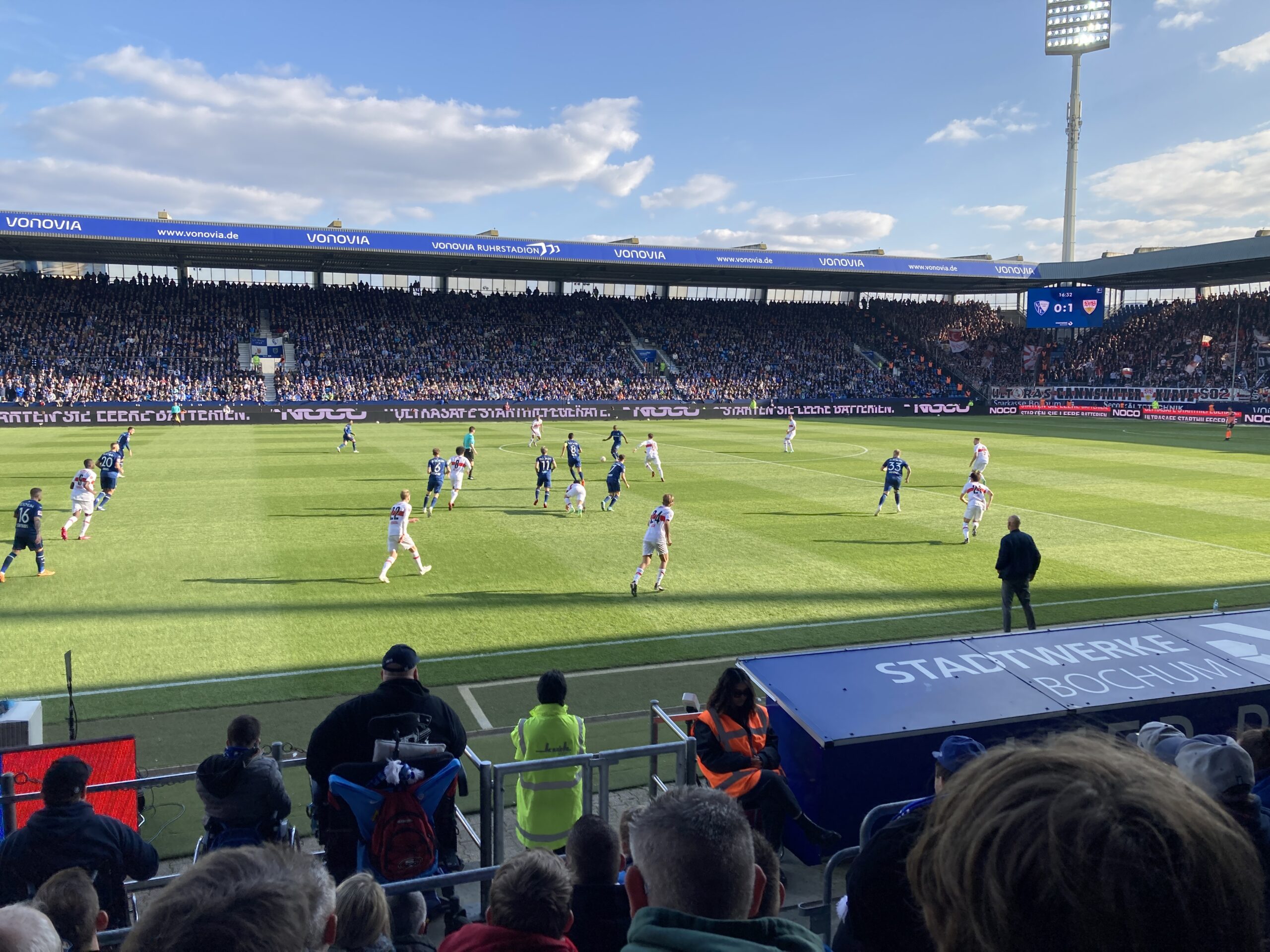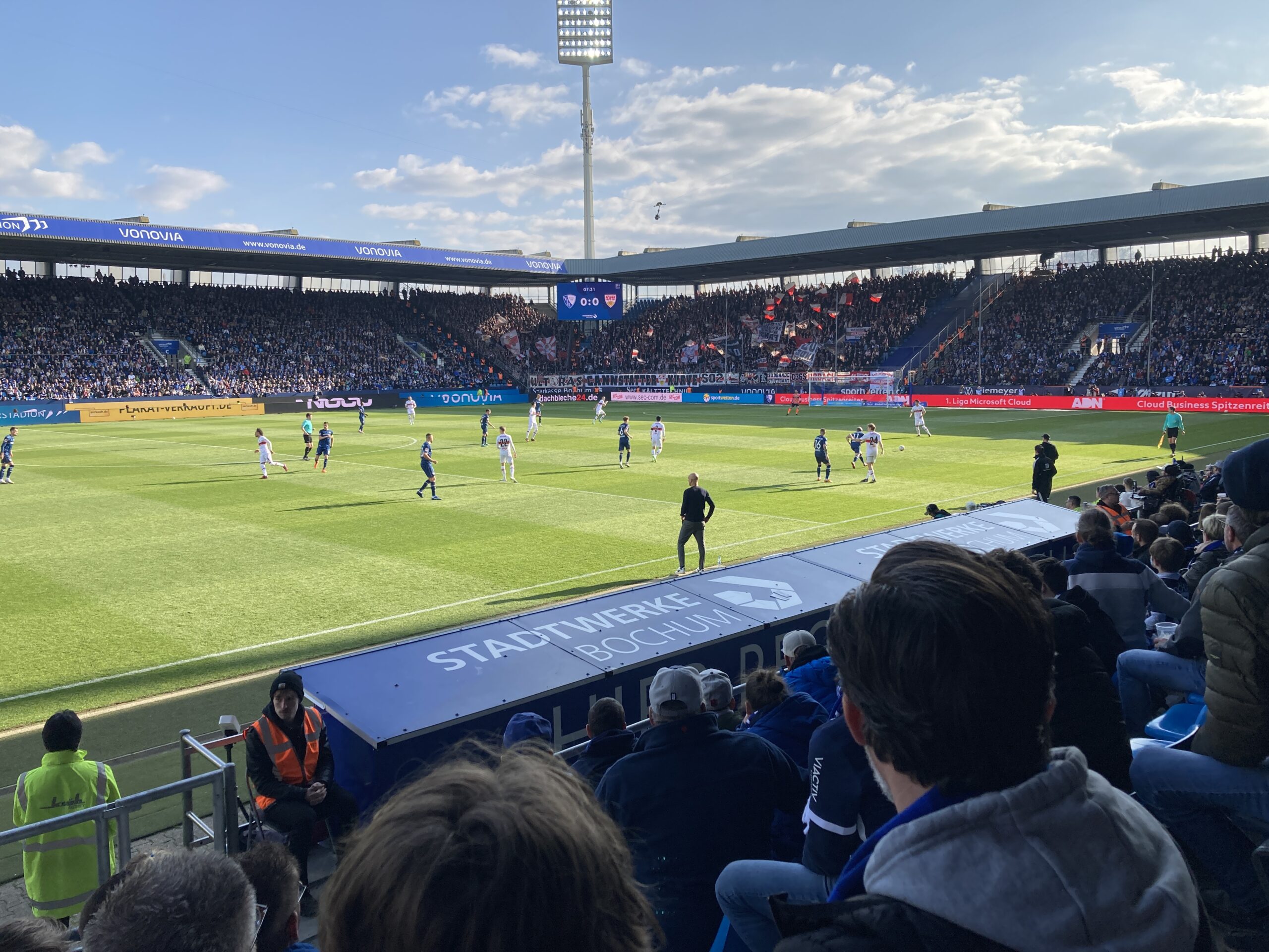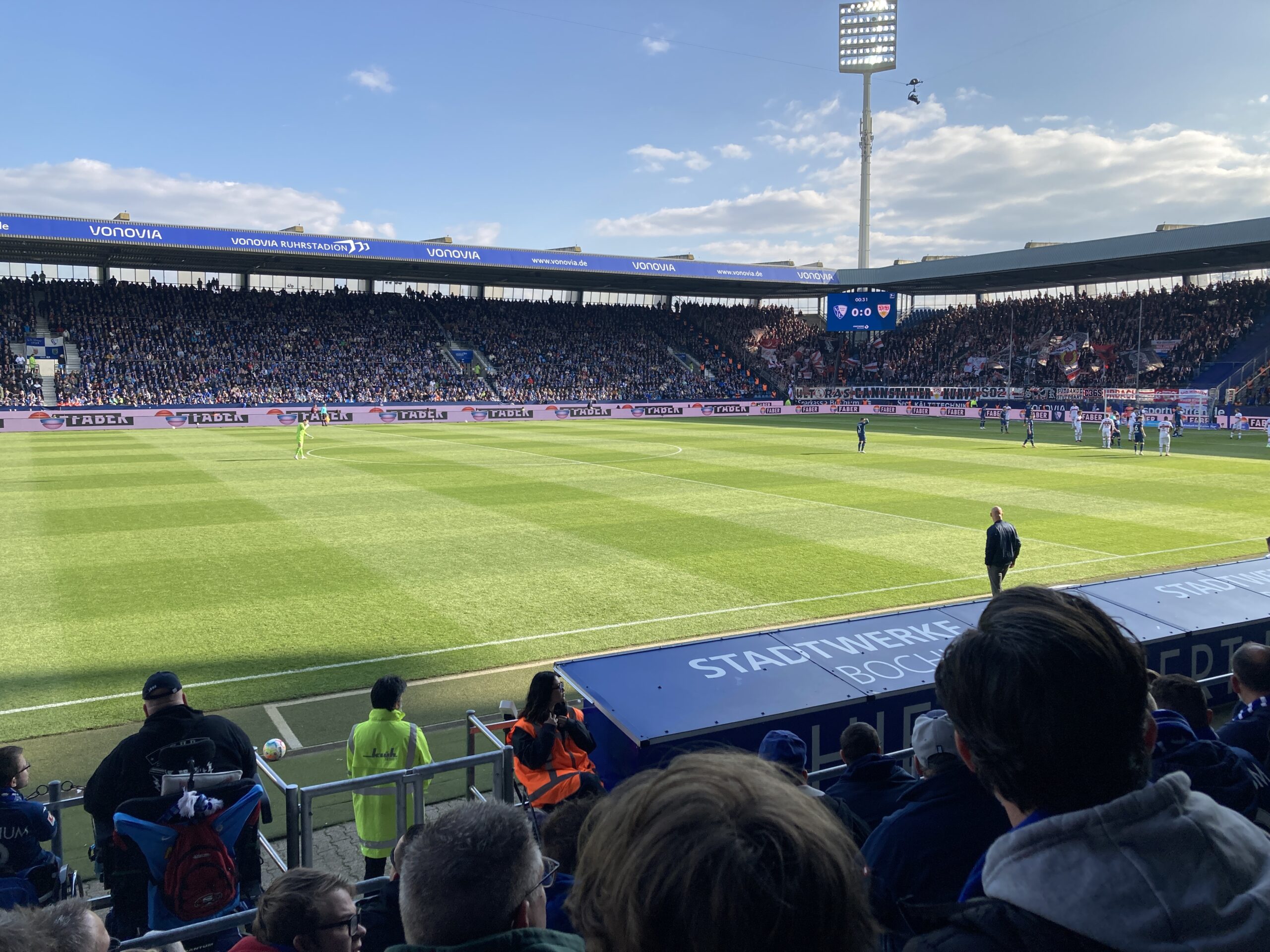 Kick Off! The Bochum fans are amazing so far! Stuttgart pretty impressive too! Germany is the place! Bochum playing a lot of long balls so far whereas Stuttgart are looking to work it through the thirds.