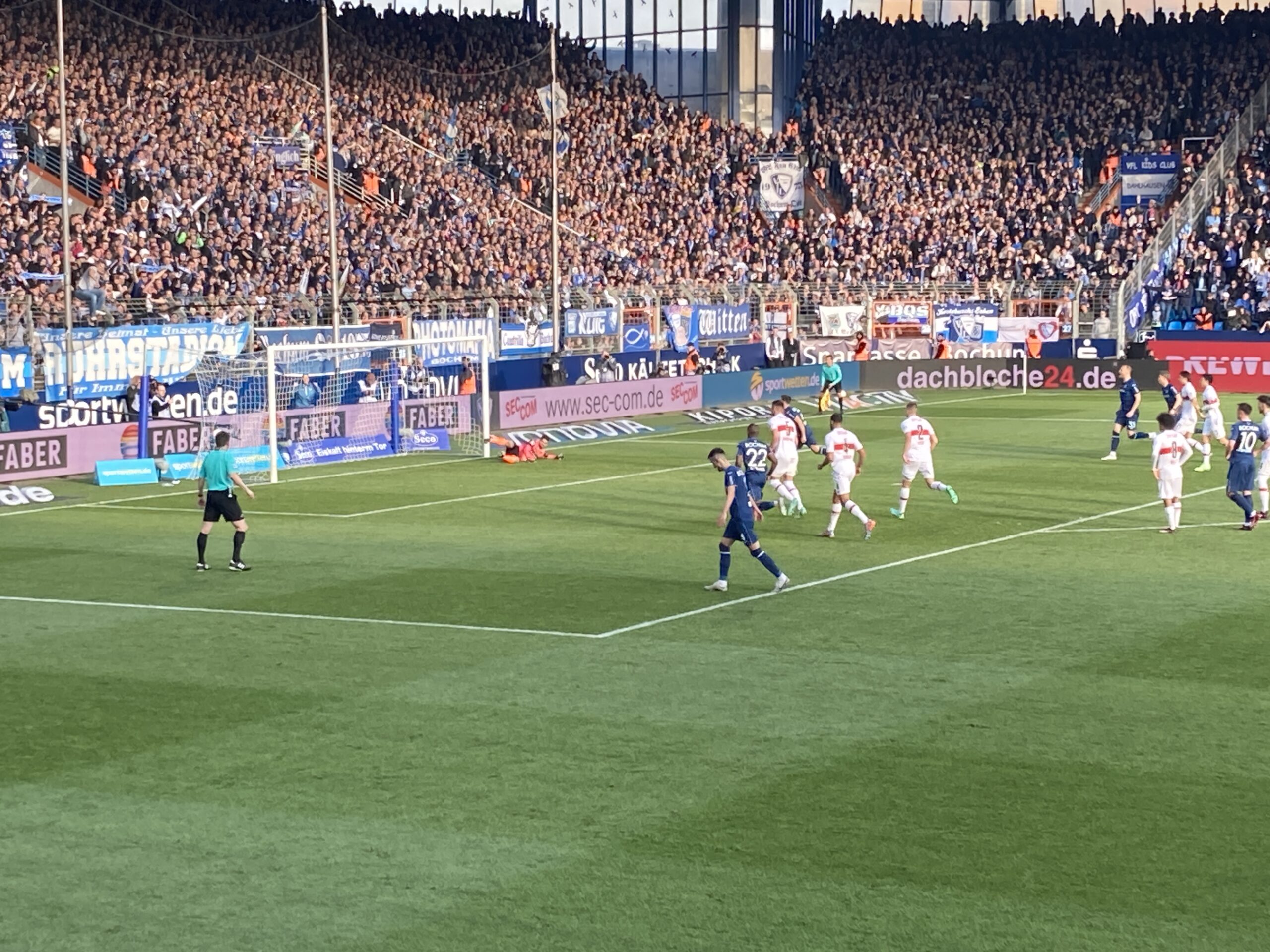 56 minutes gone and Bochum play a ball into the box, it’s headed down, Philipp Förster is held back there… PENALTY! Bochum have the chance to level! Kevin Stöger steps up… YES!! He’s levelled it! 1-1! Come on now Bochum!