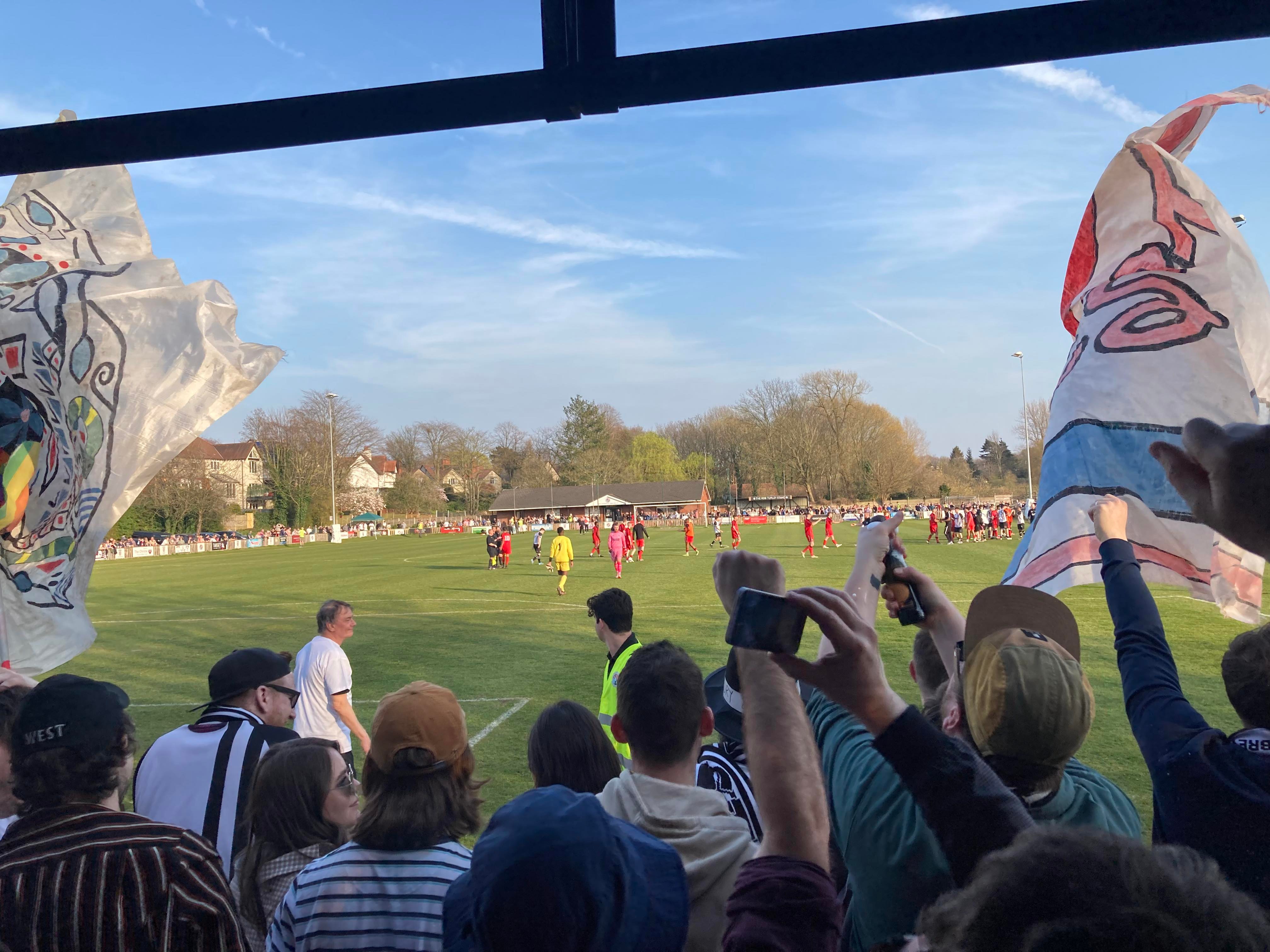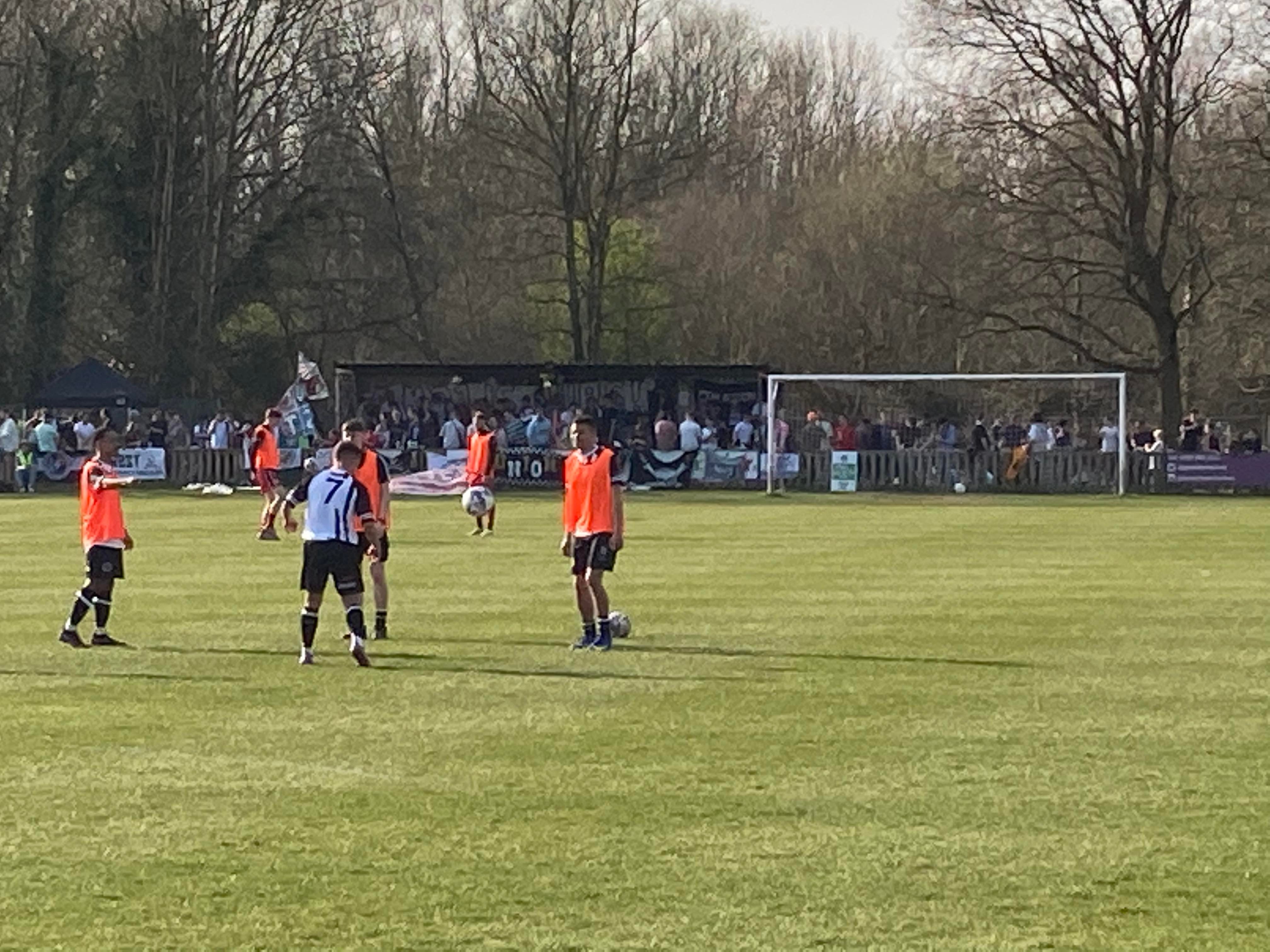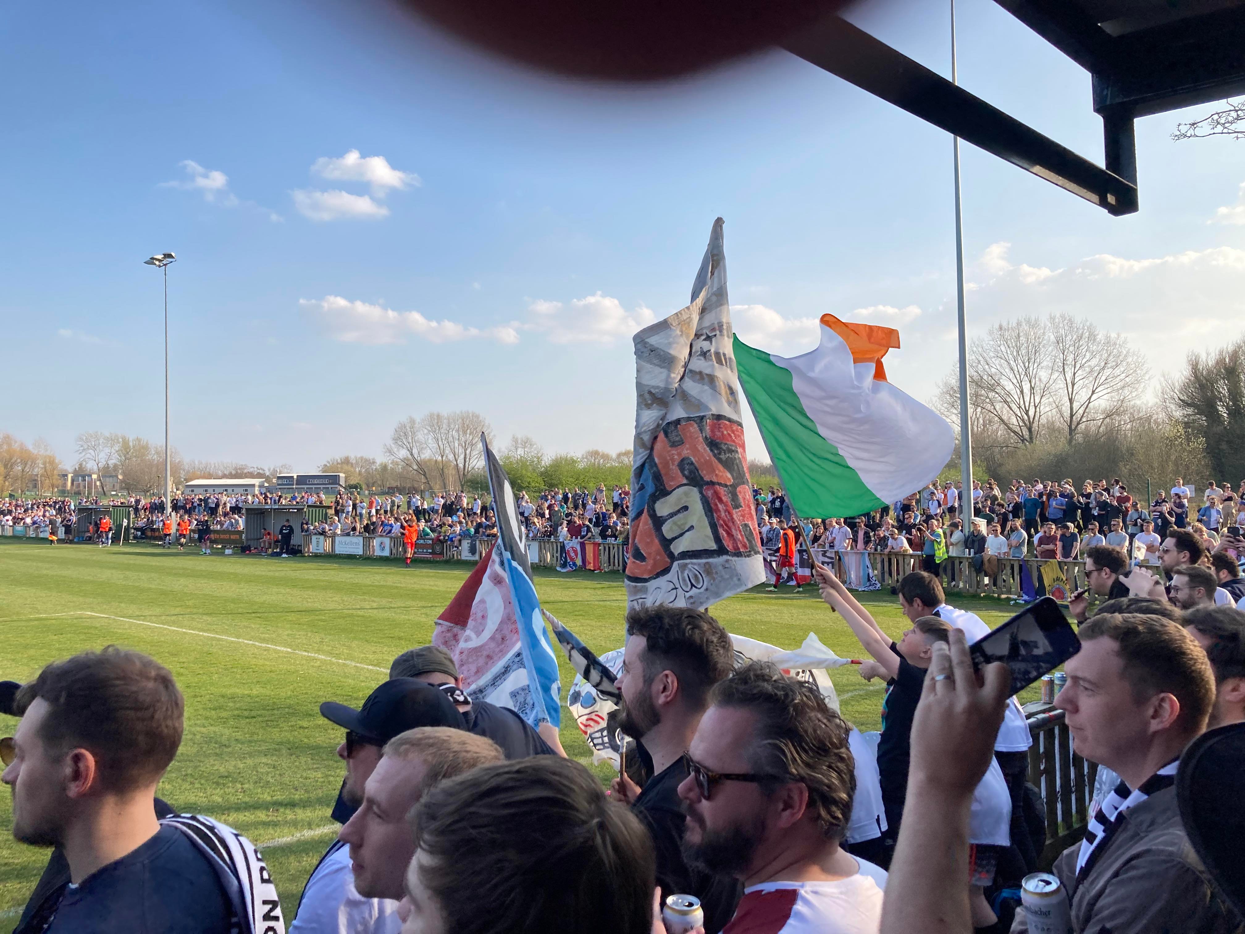 We have set up territory in the Shed! Out come the players for their warm ups! Me and Match Days Joe are discussing our plans for next season and for the end of this one… That sure did pass the time! The spirits are certainly sky high with the West Didsbury fans!!