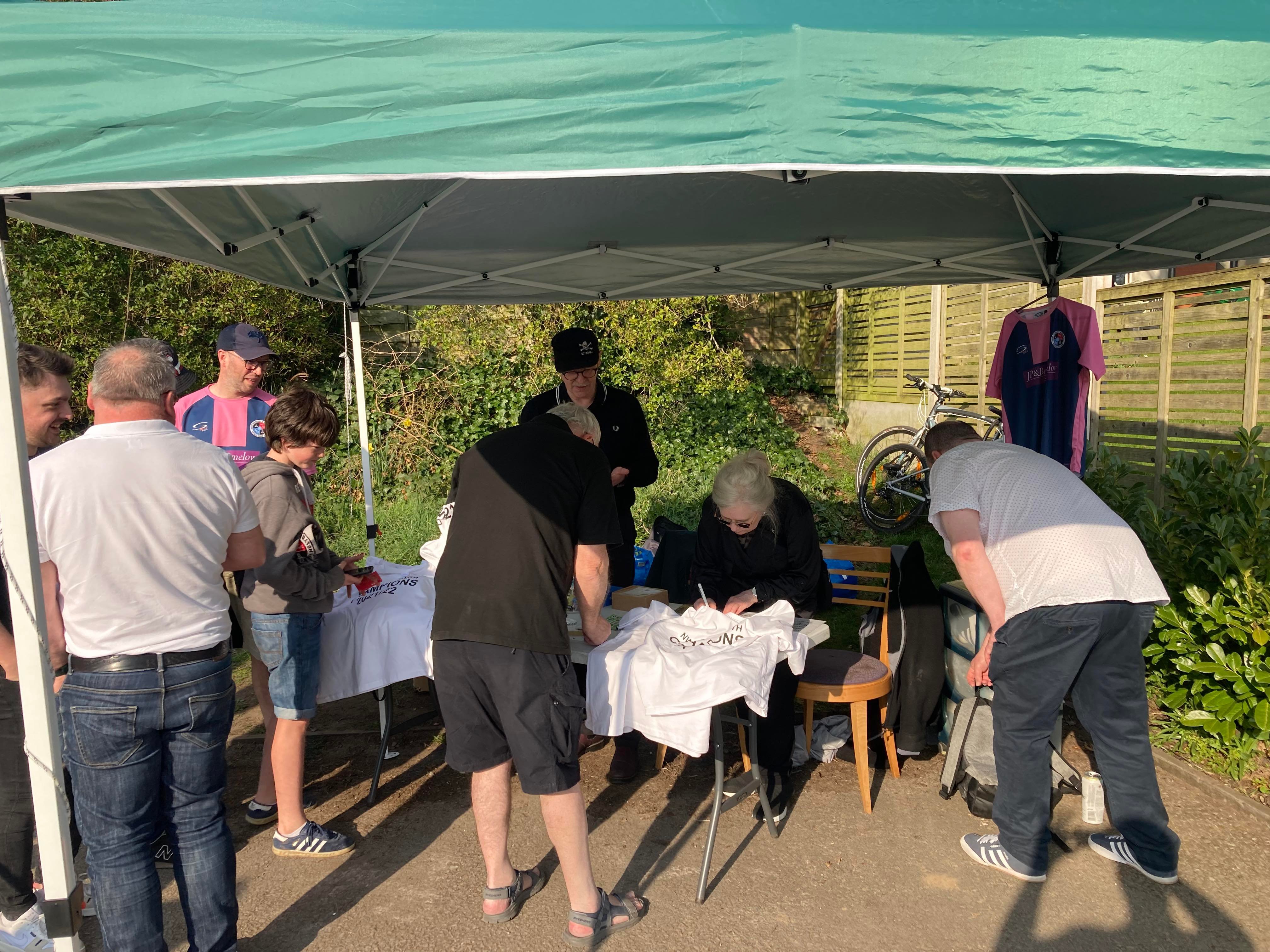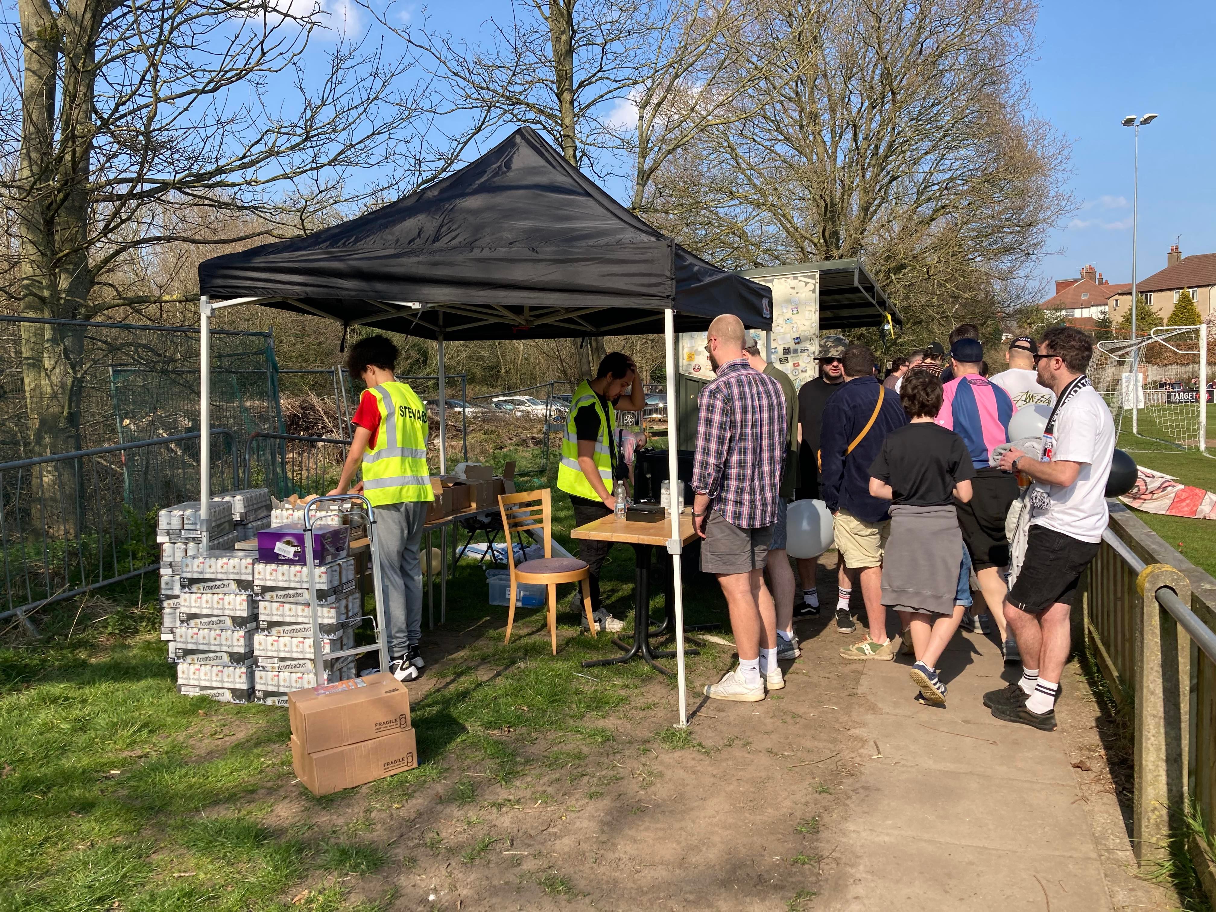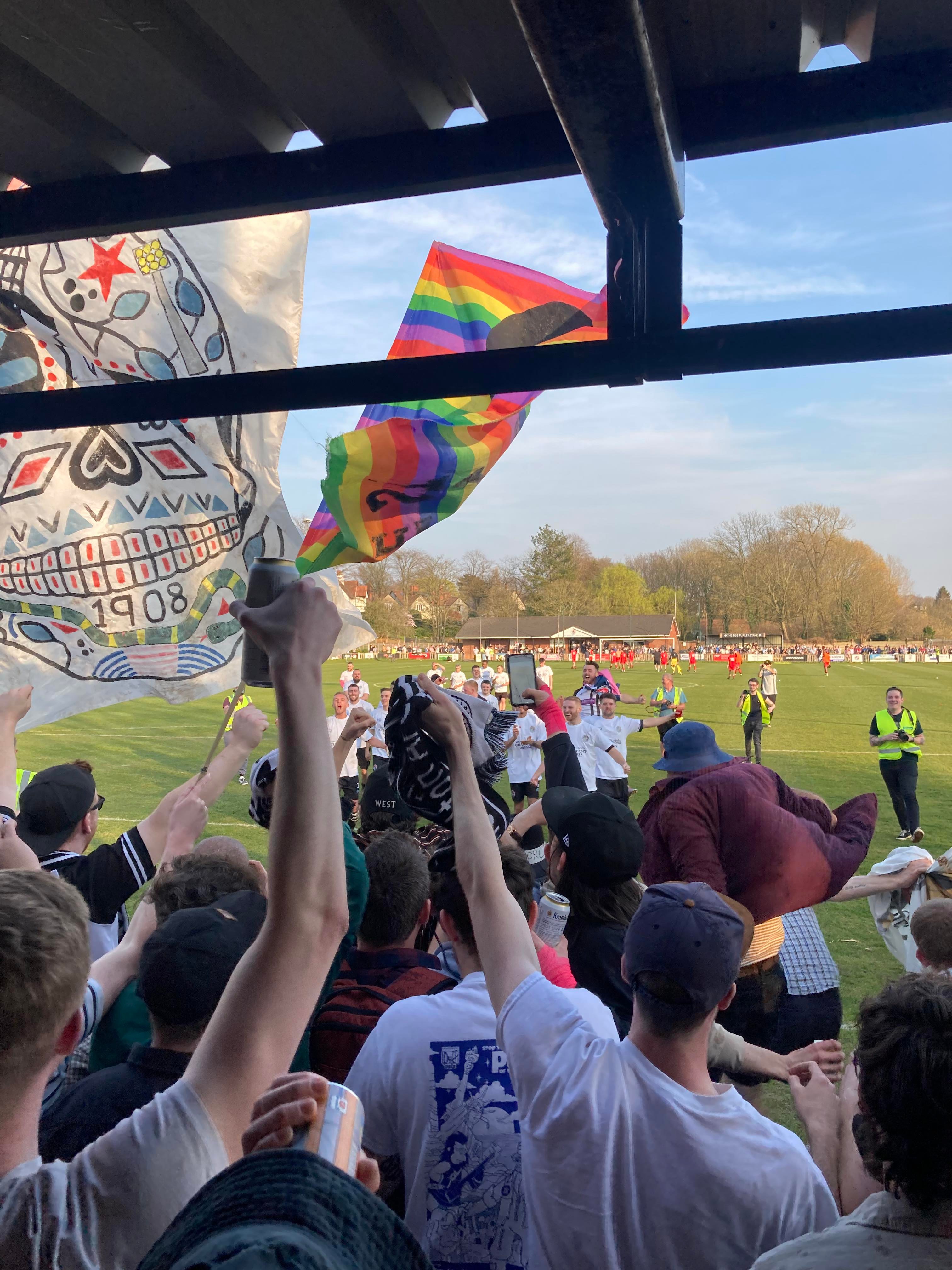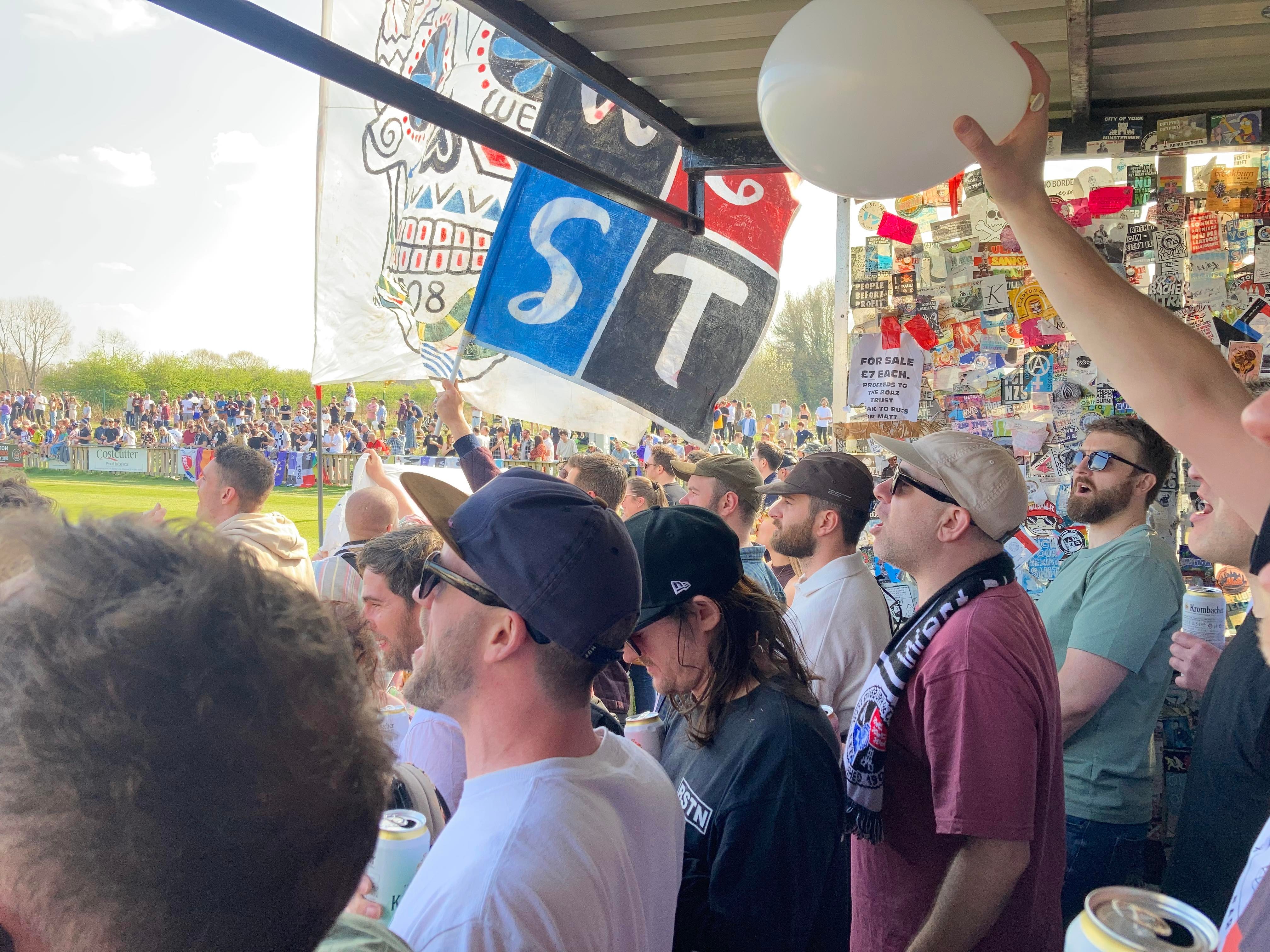 We have set up territory in the Shed! Out come the players for their warm ups! Me and Match Days Joe are discussing our plans for next season and for the end of this one… That sure did pass the time! The spirits are certainly sky high with the West Didsbury fans!!