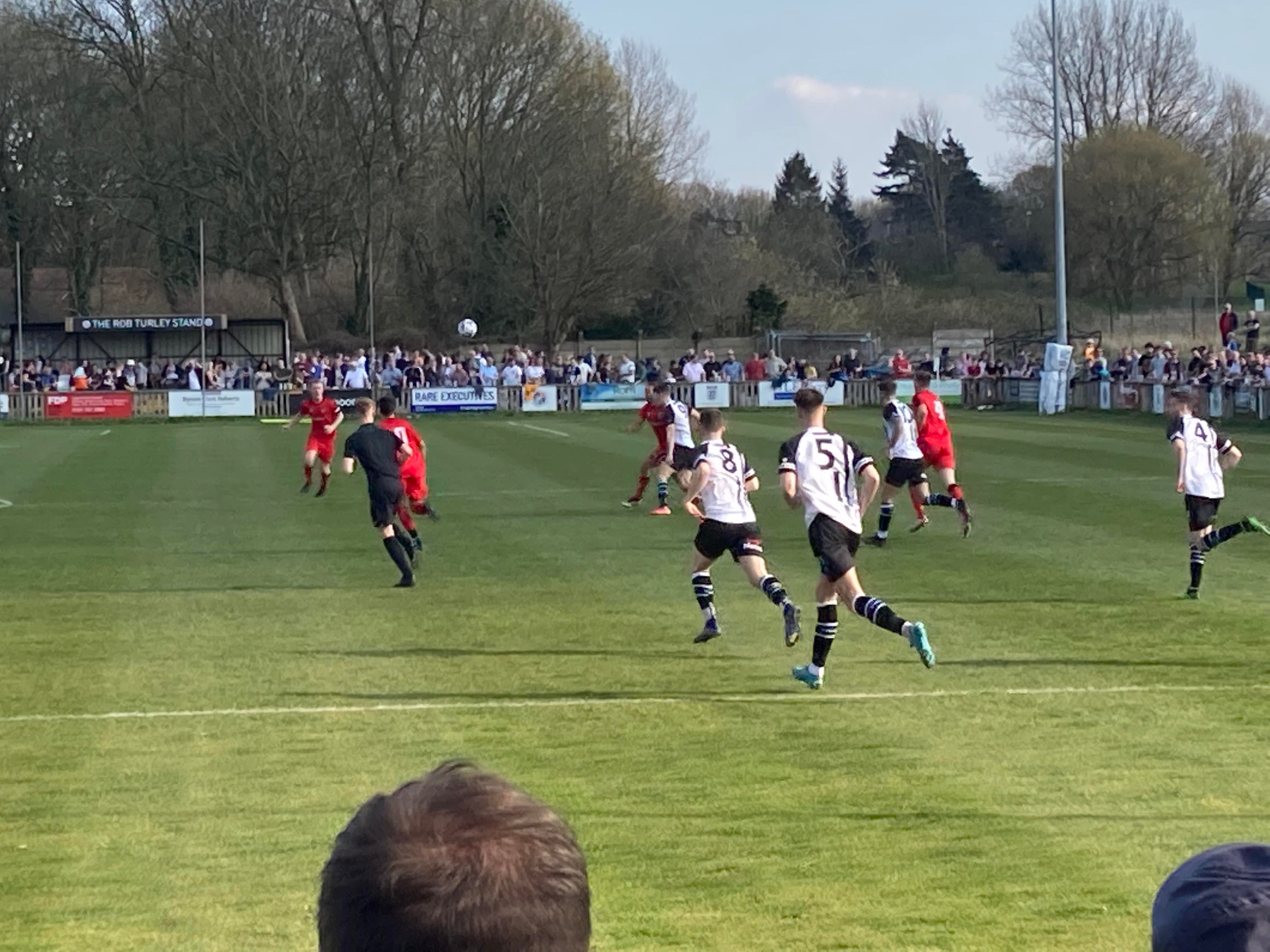 Into stoppage time now and West play it back to the keeper, he lumps it forward, the keeper comes for it… He’s missed it and it’s loose… Alsager clear… It could have been so much more! Stoppage time goes on and West play it back to the keeper again and he launches it forward again, Dominic Barnes gets his head to it for Alsager to clear… And that is that!! Full Time!!